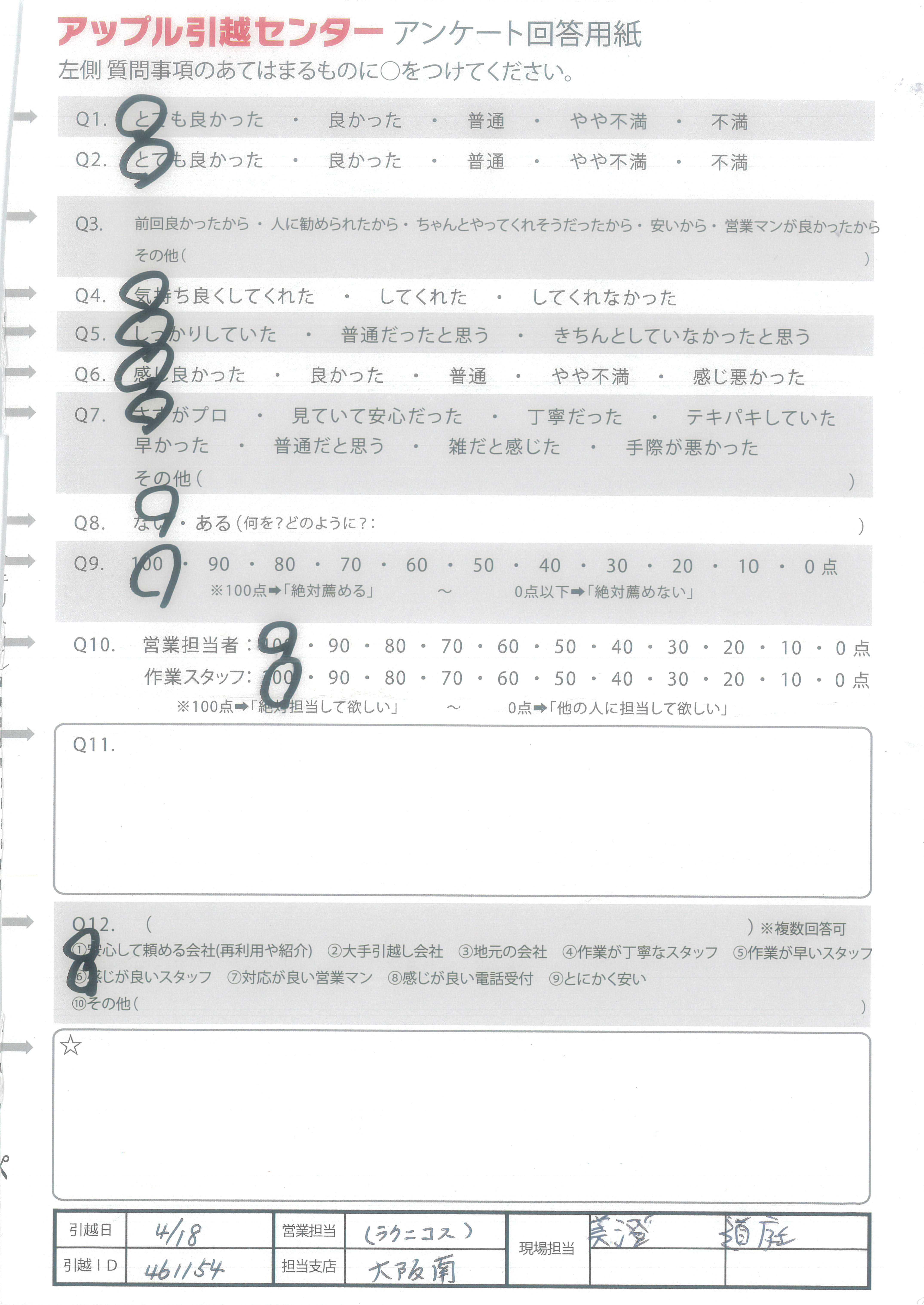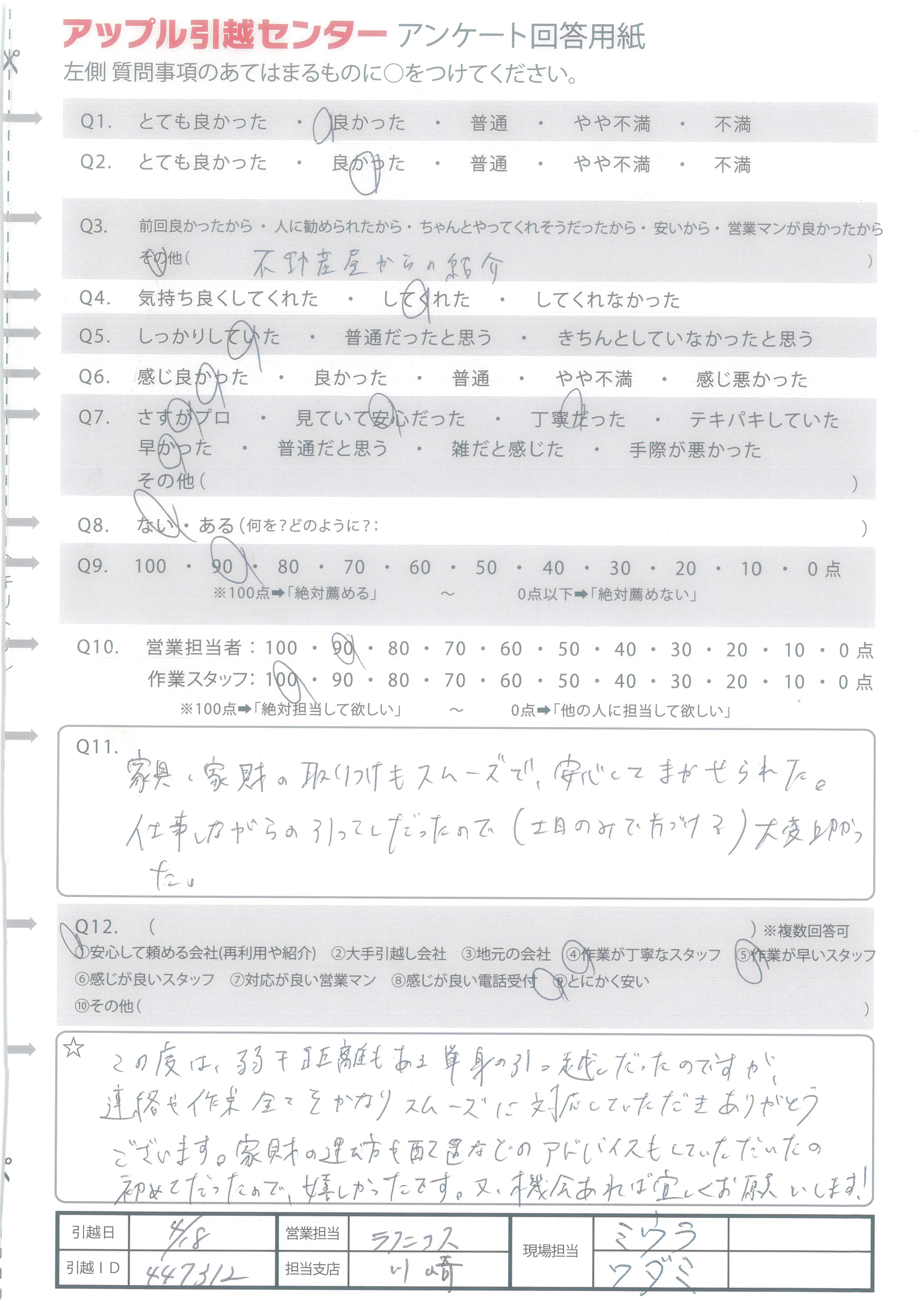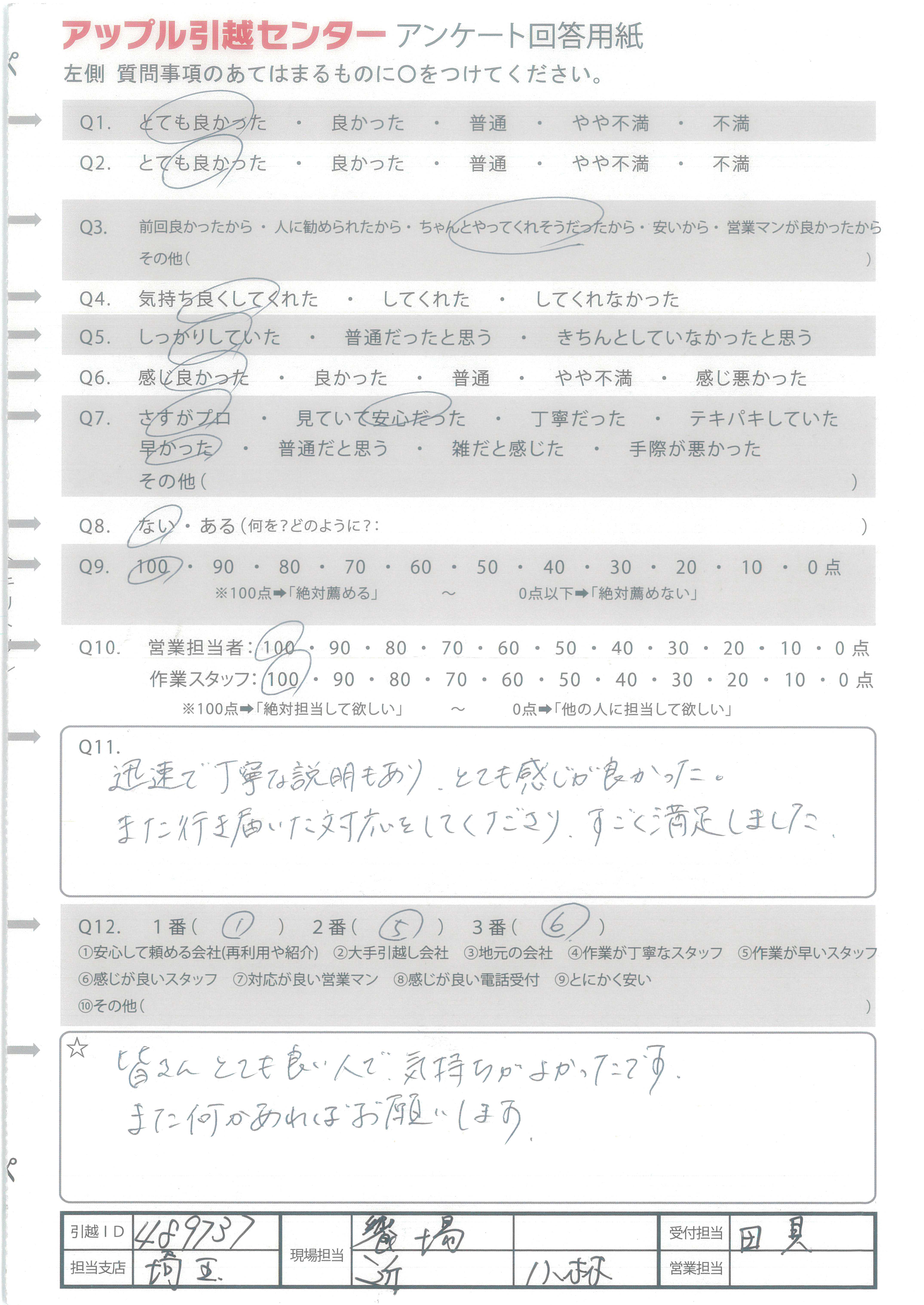A.この度は、弱干距離もある単身の引っ越しだったのですが、連絡や作業全てをかなりスムーズに対応していただきありがとうございます。家財の運び方や配置などのアドバイスもしていただいたの初めてだったので、嬉しかったです。又、機会あれば宜しくお願いします!