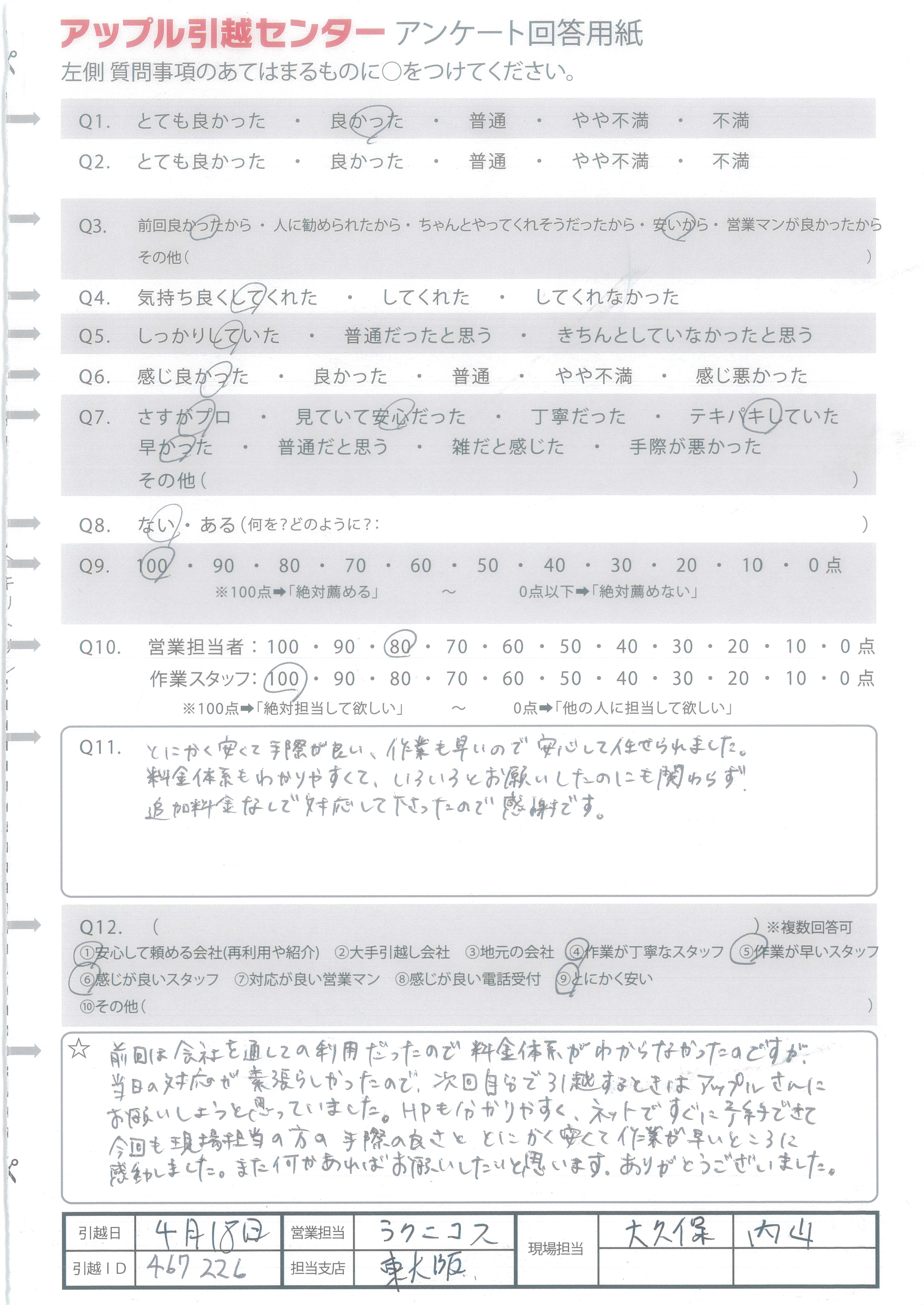 A.前回は会社を通しての利用だったので料金体系がわからなかったのですが、当日の対応が素晴らしかったので、次回自分で引越しするときはアップルさんにお願いしようと思ってました。HPも分かりやすく、ネットですぐに予約できて今回も現場担当の方の手際の良さととにかく安くて作業が早いところに感動しました。また何かあればお願いしたいと思います。ありがとうございました。