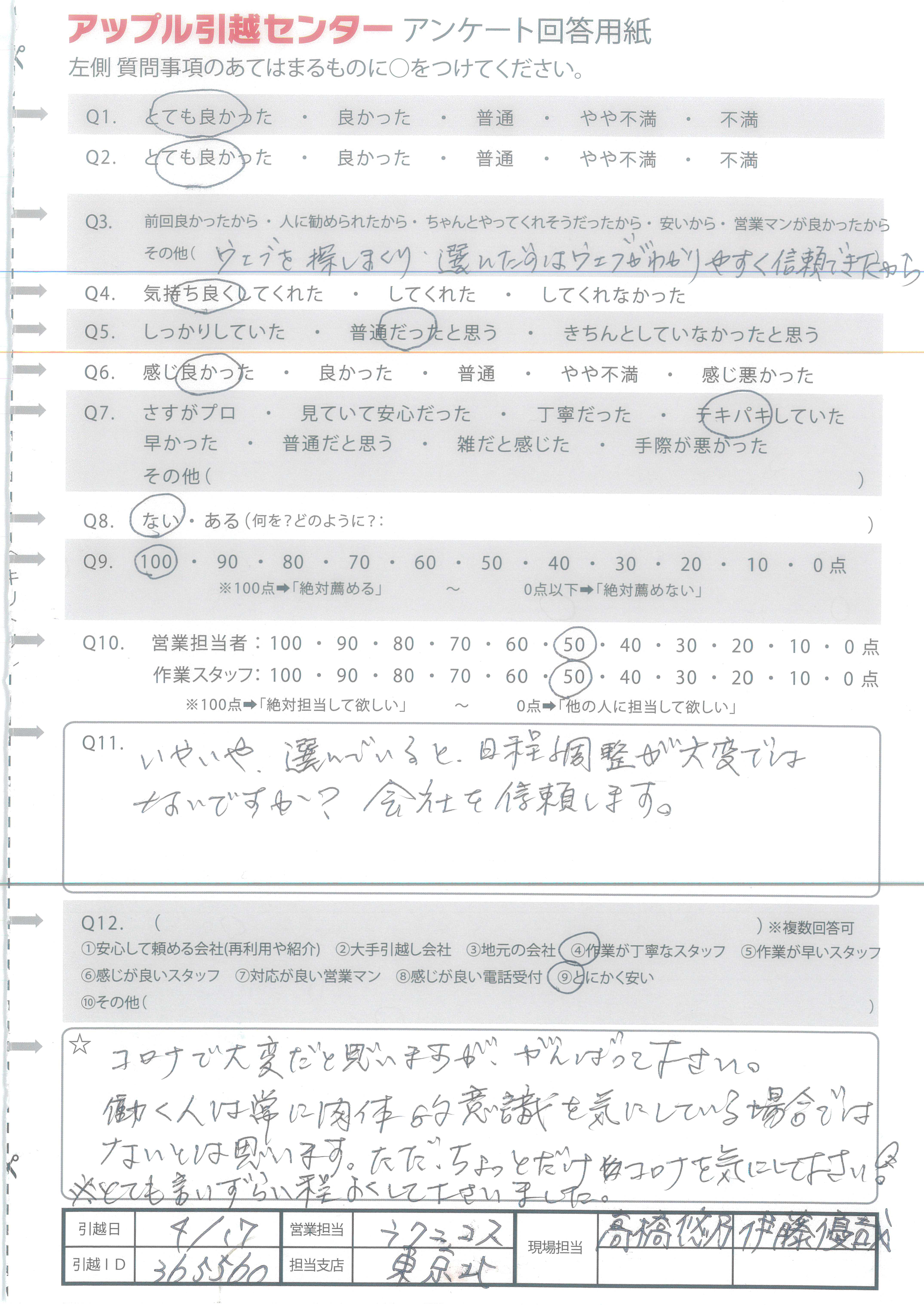 A.見積りも電話で安心。営業もなくてよかった。 この時期でも安くてよかった。対応も早くテキパキとしていて安心でした。引越しのサカイがクソだったのでアップルにして良かった。