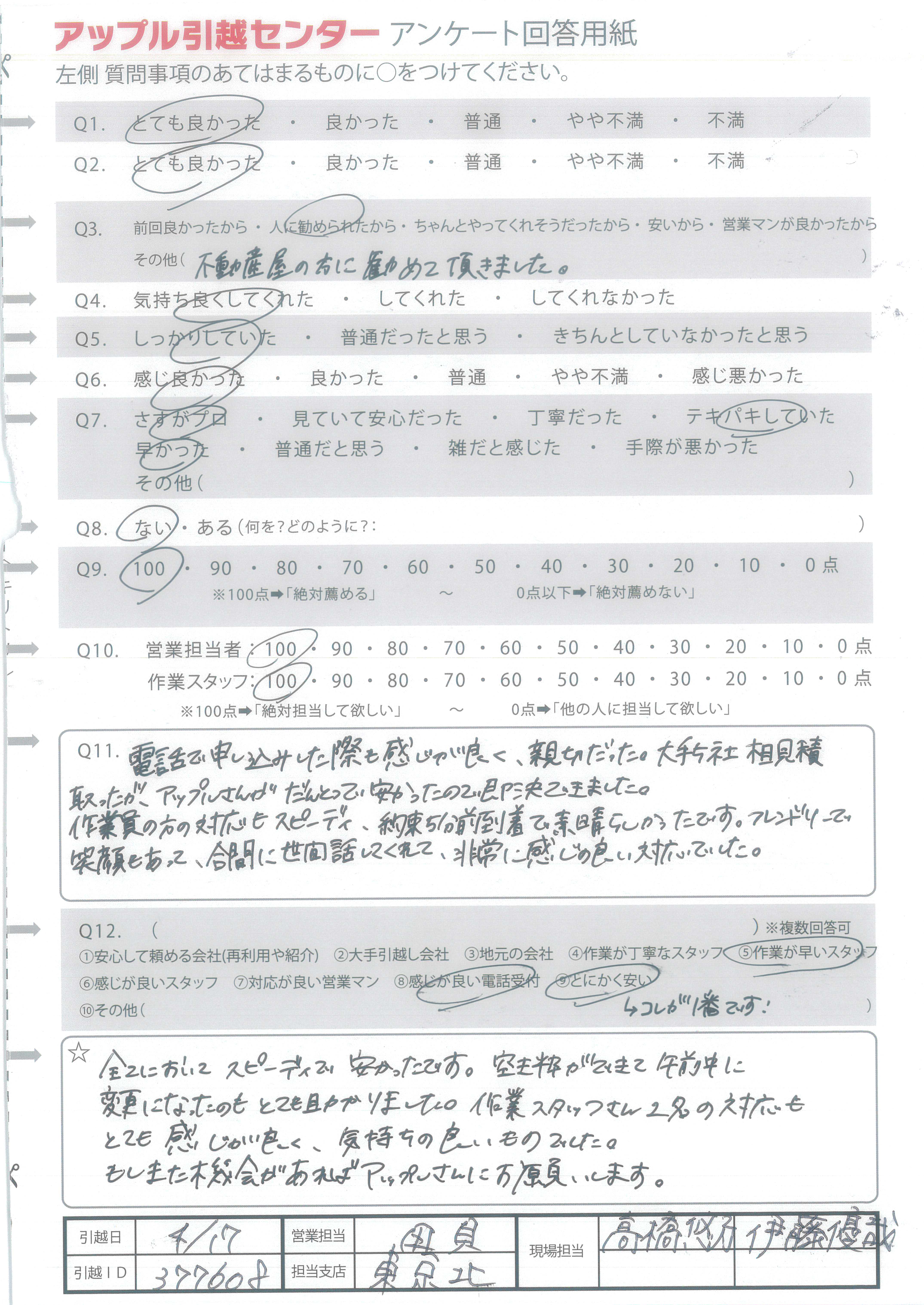 A.電話で申し込みした際も感じが良く、親切だった。大手5社相見積取ったが、アップルさんがだんとつで安かったので即決できました。 作業員の方の対応もスピーディー、約束5分前到着で素晴らしかったです。フレンドリーで笑顔もあって、合間に世間話してくれて、非常に感じの良い対応でした。