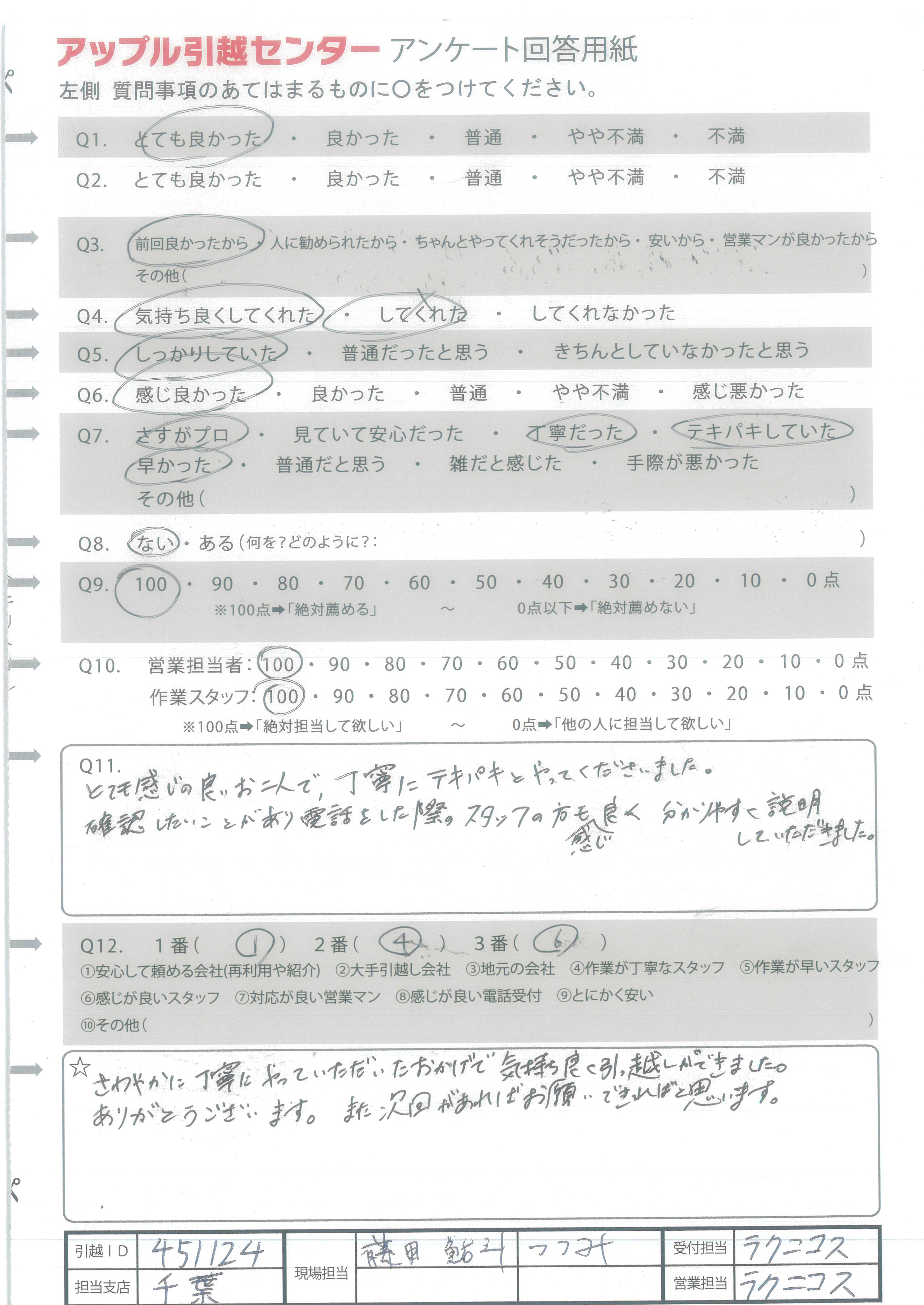 A.さわやかに丁寧にやっていただいたおかげで気持ち良く引っ越しができました。 ありがとうございます。また次回があればお願いできればと思います。
