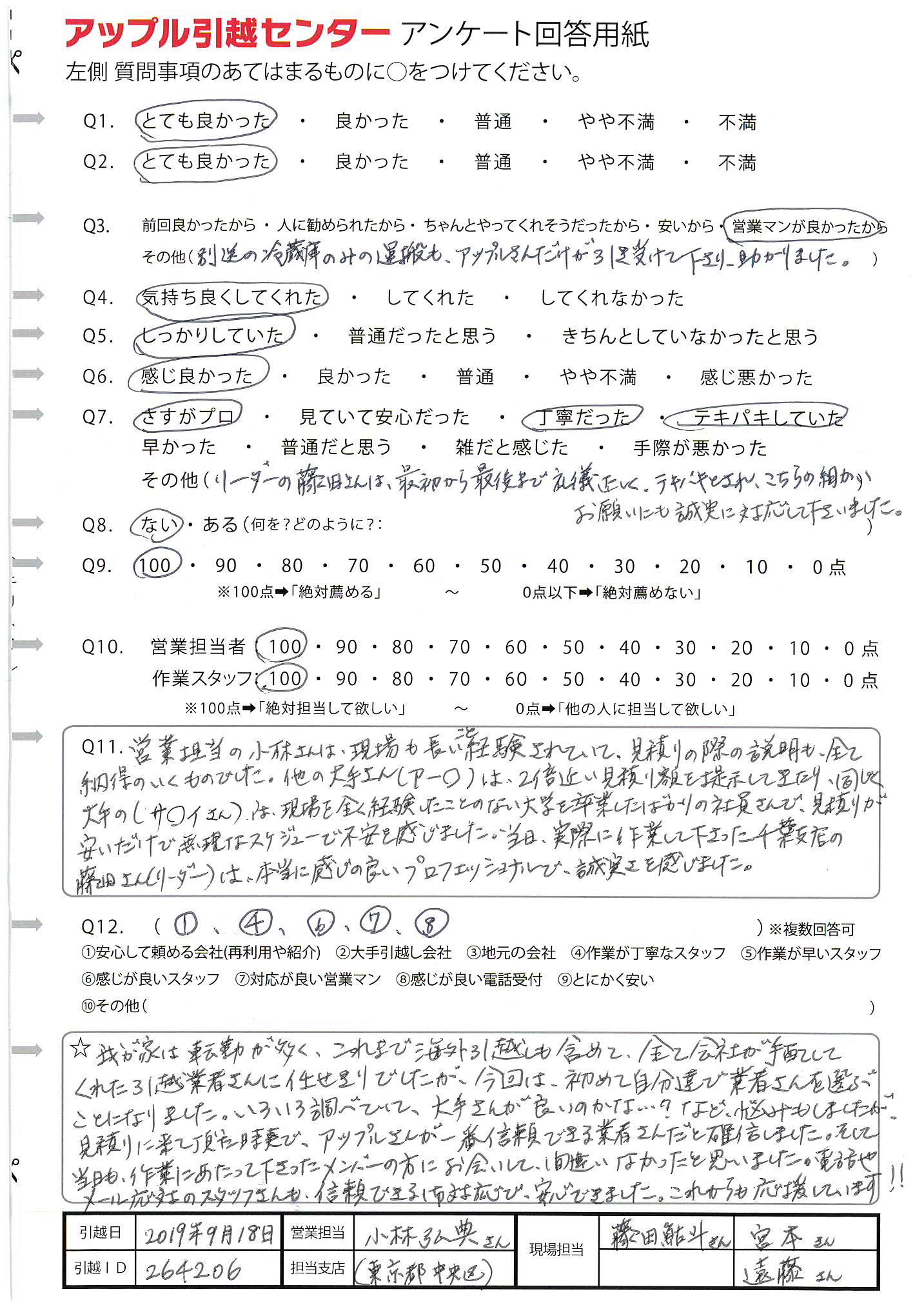 A.営業担当の小林弘典さん、作業リーダーの藤田鮎斗さん、大阪支店の三谷さんには、特にお世話になりました。ありがとうございました。今後もまた引っ越しの際は、どうぞ宜しくお願い致します。