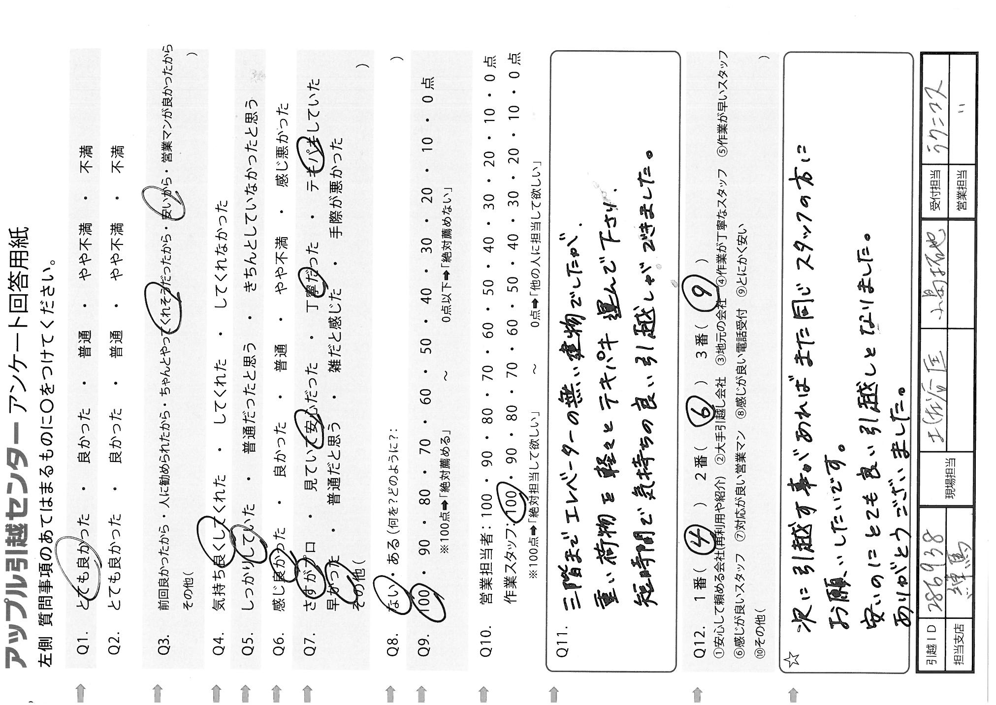 A.数年前に利用したK業者の作業員がとても良かったので今回も利用しようとtelしたらtel対応者の対応がひどくクレームしたほどでした。 その次にtelしたアップルさんはまずtel対応の方の対応がすばらしくてびっくりしました。 対応も早く作業に来られたお2人もきちんとされていて、今回こちらを選んで良かったと思いました。 私用&社用でもこちらを今後はすすめていきたいと思うほど良かったです。 ありがとうございました