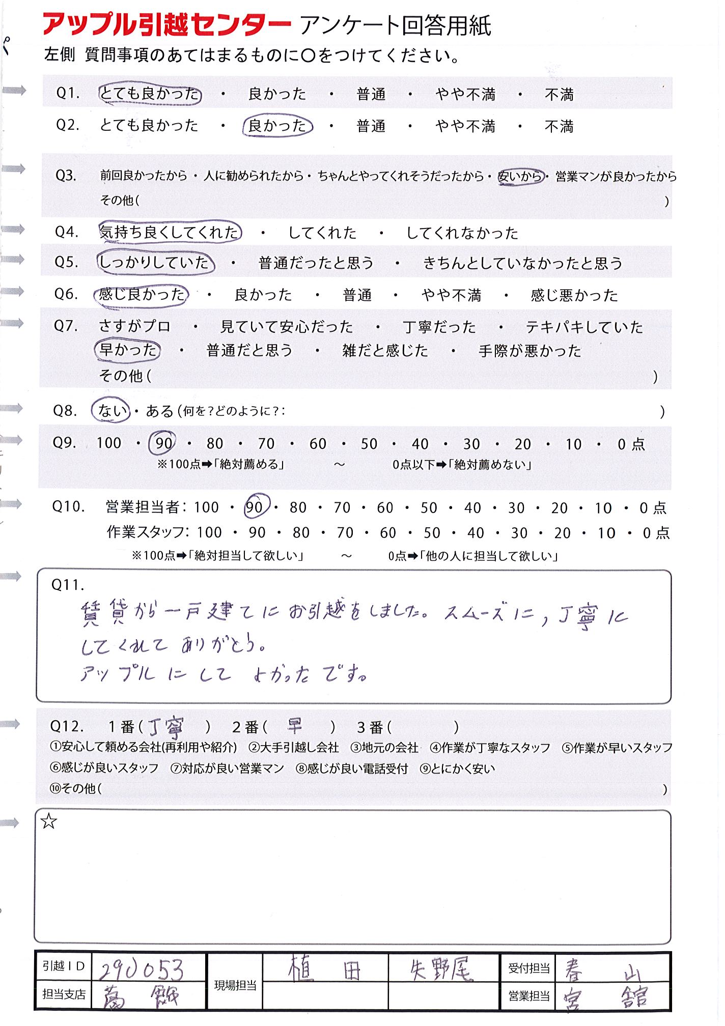 A.一人暮らしの引越しで3人も来てくれると思っていませんでした。 皆さんに担当していただけて良かったです。 ありがとうございました。