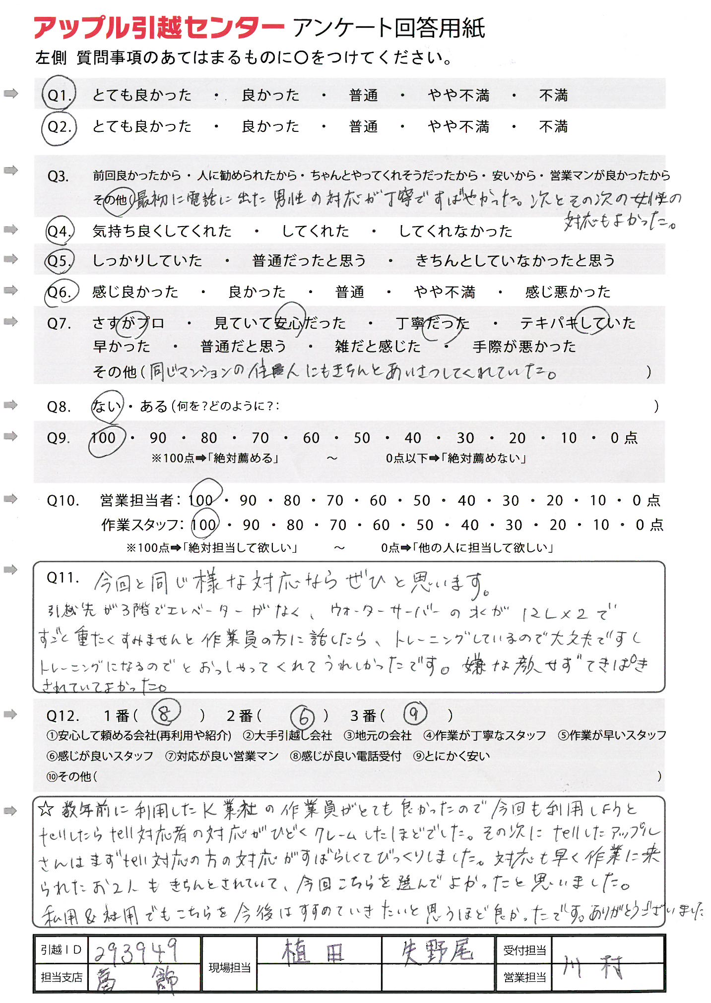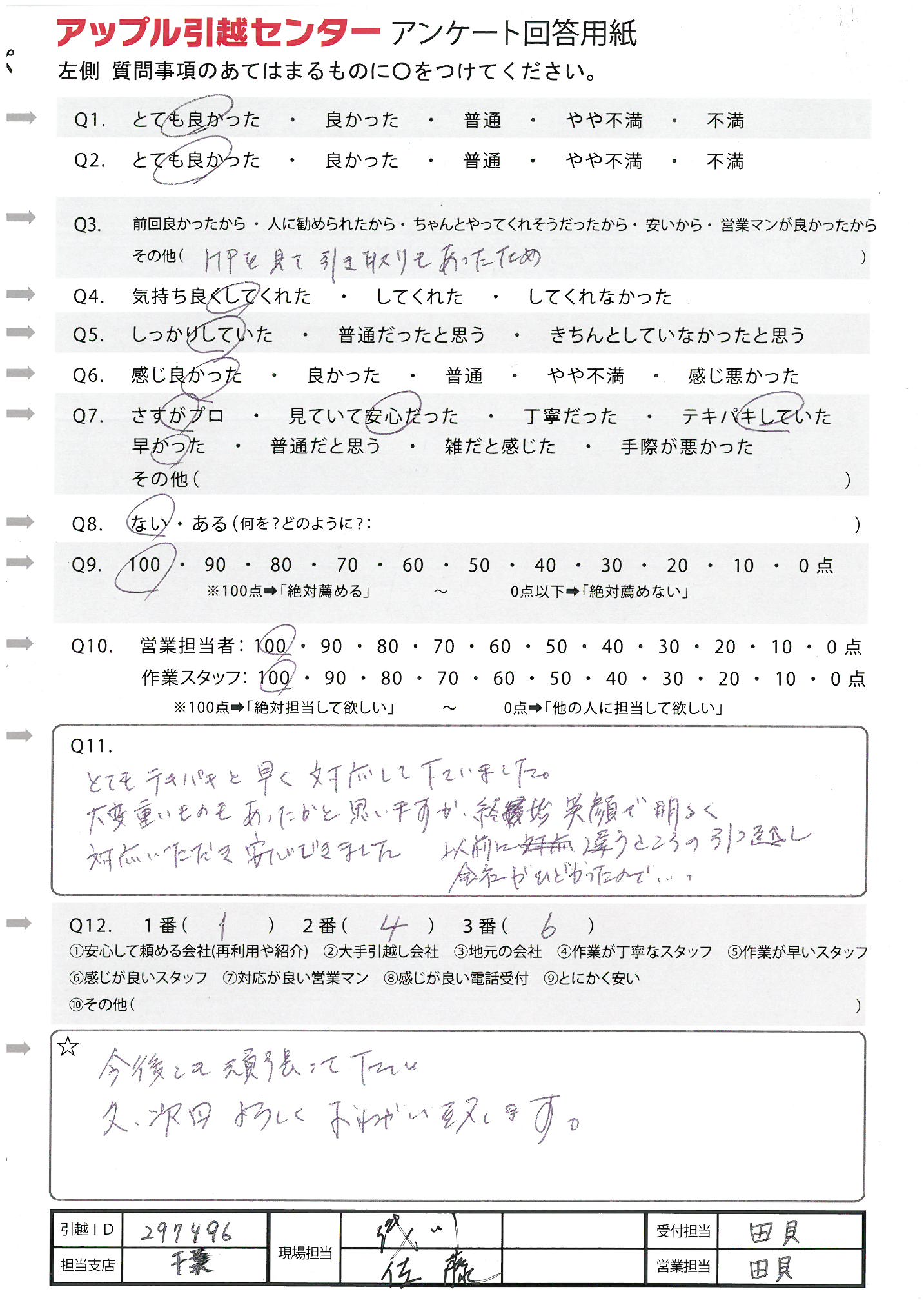 A.我家は転勤が多く、これまで海外引越しも含めて全て会社が手配してくれた引越業者さんに任せきりでしたが、今回は、初めて自分達で業者さんを選ぶことになりました。 いろいろ調べていて、大手さんが良いのかな・・・?など、悩みもしましたが見積りに着て頂いた時点で、アップルさんが一番信頼できる業者さんだと確信しました。 そして当日も、作業にあたって下さったメンバーの方にお会いして、間違いなかったと思いました。 電話やメール応対のスタッフさんも、信頼できる対応で、安心できました。 これからも応援しています!!