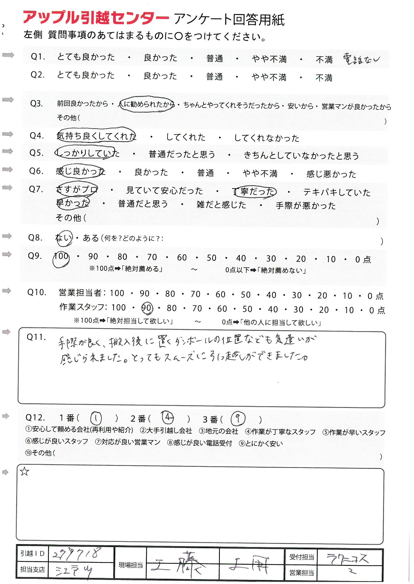 A.他のスタッフの方を知らないので今回の対応のみで100. まず電話対応してくれた川村様がとても感じがよく、現場スタッフへの信頼を感じた。 当日スタッフの新谷様、広田様もプロらしい仕事をしていただき、見ていて安心できました。 本当にありがとうございました。