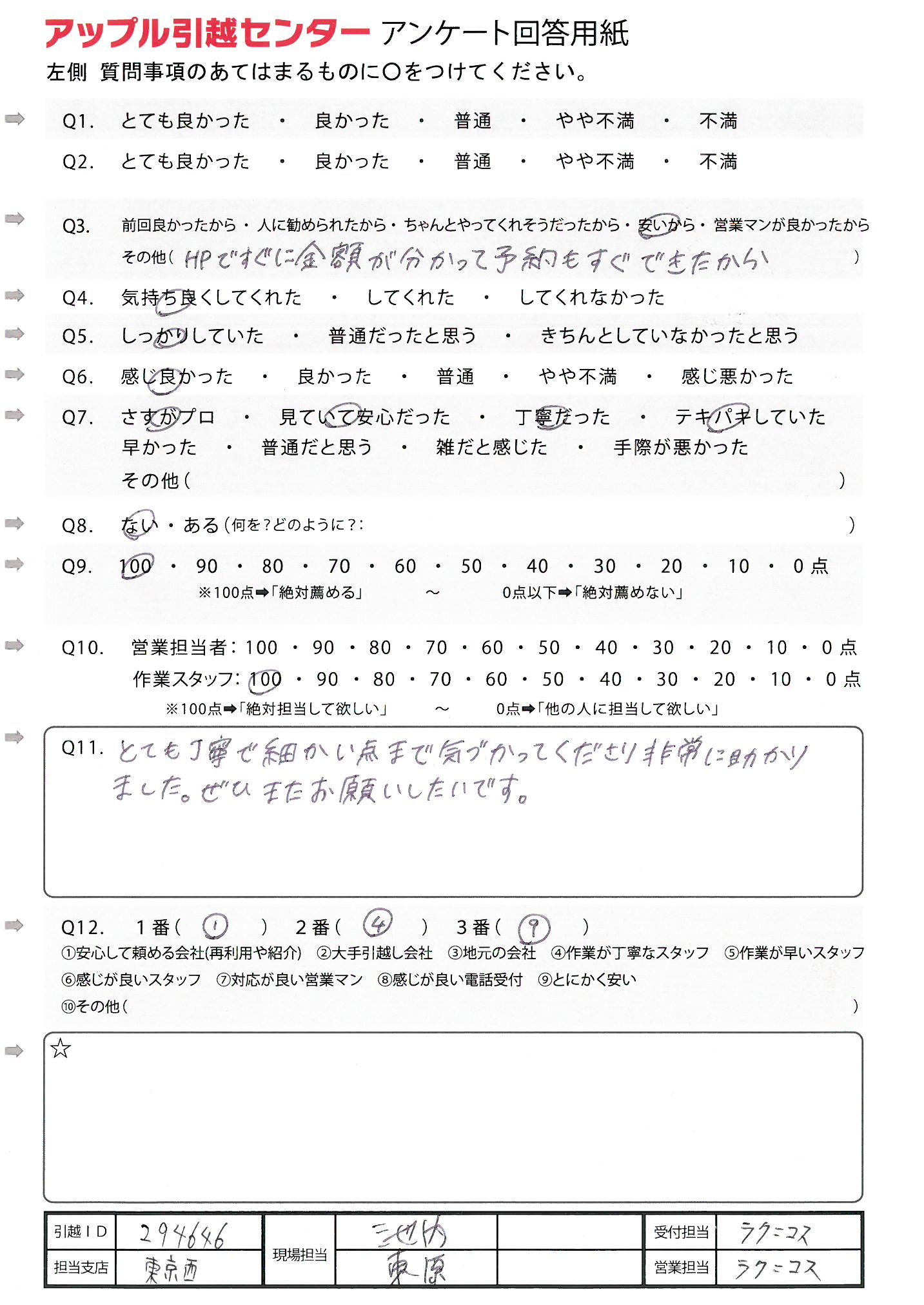 A.引越し作業中に出た不用品も心よく回収していただき、非常に助かりました。 スムーズに引越しすることができとても満足しています。 東北への引越しだったので使用後のダンボールの回収のみ対象外でしたが、他は全て良かったです。 本当にありがとうございました。