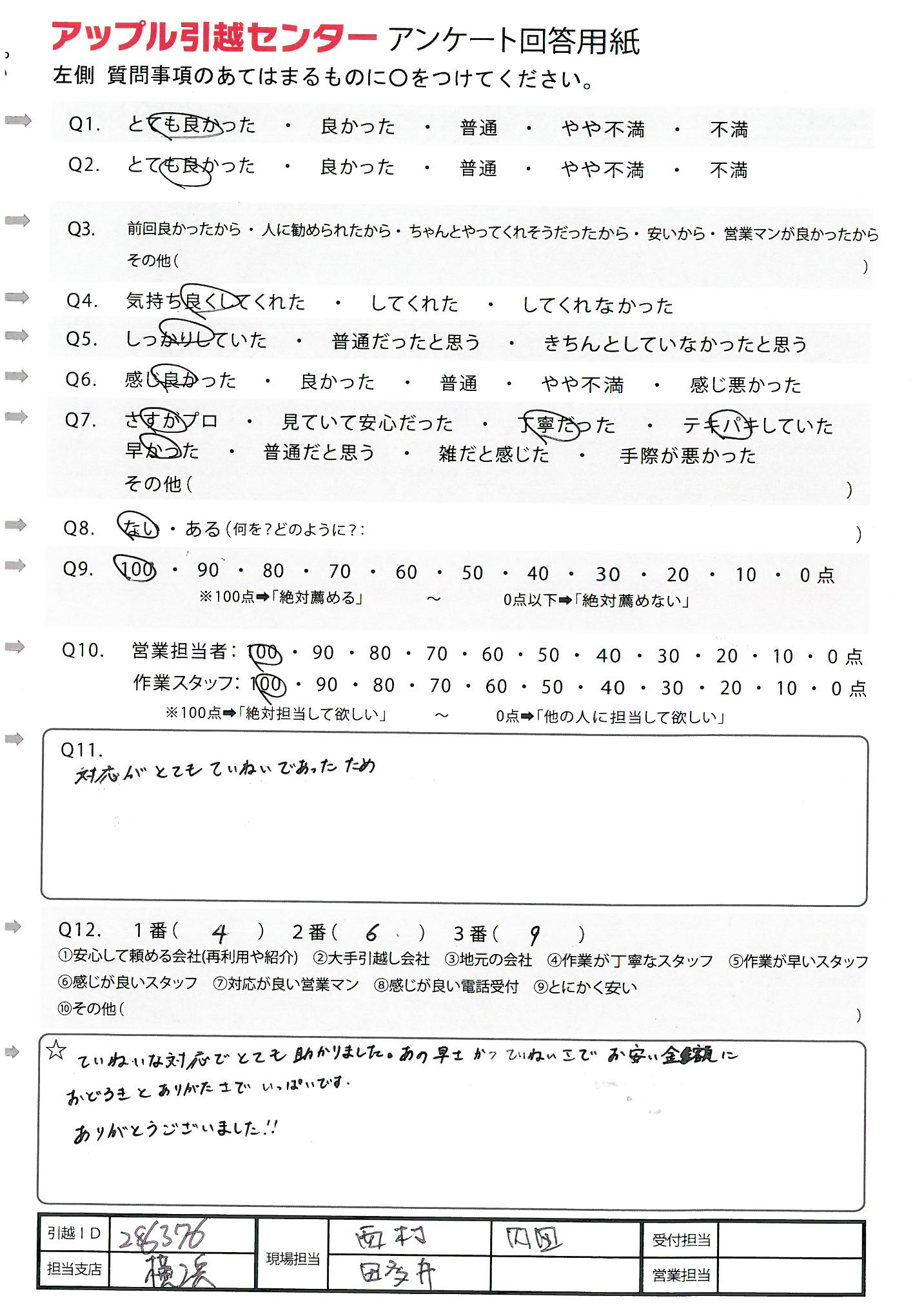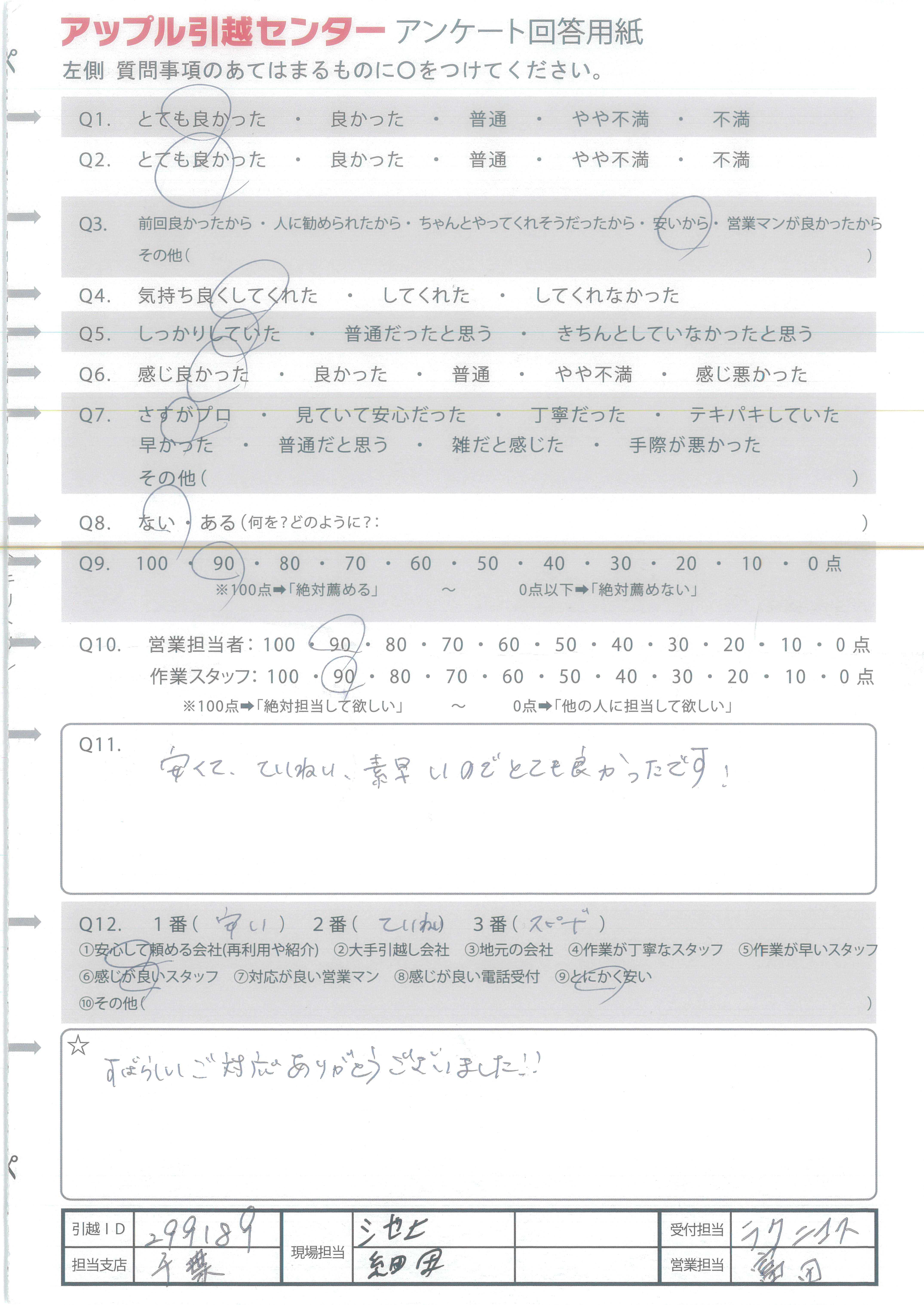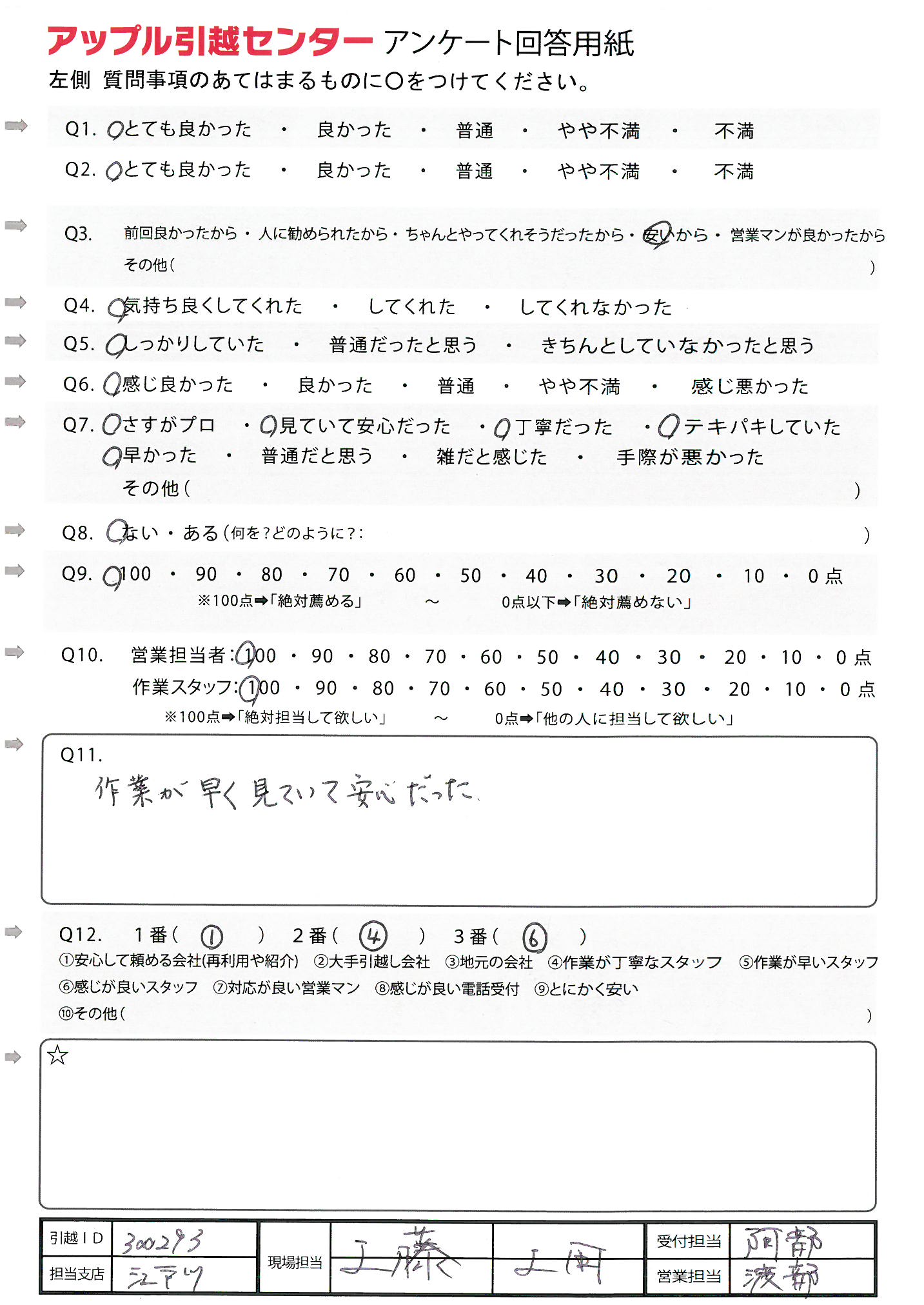 A.本当にありがとうございました。引っ越しは何度もあるものではないですが、良い気持ちで終えられて嬉しいですし、誰かに紹介したいです。ありがとうございました!