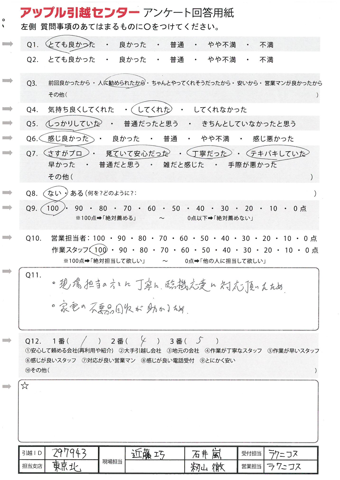 A.スタッフの方が2人とも感じの良い方で、作業の手際が良くスムーズに引越ができた。