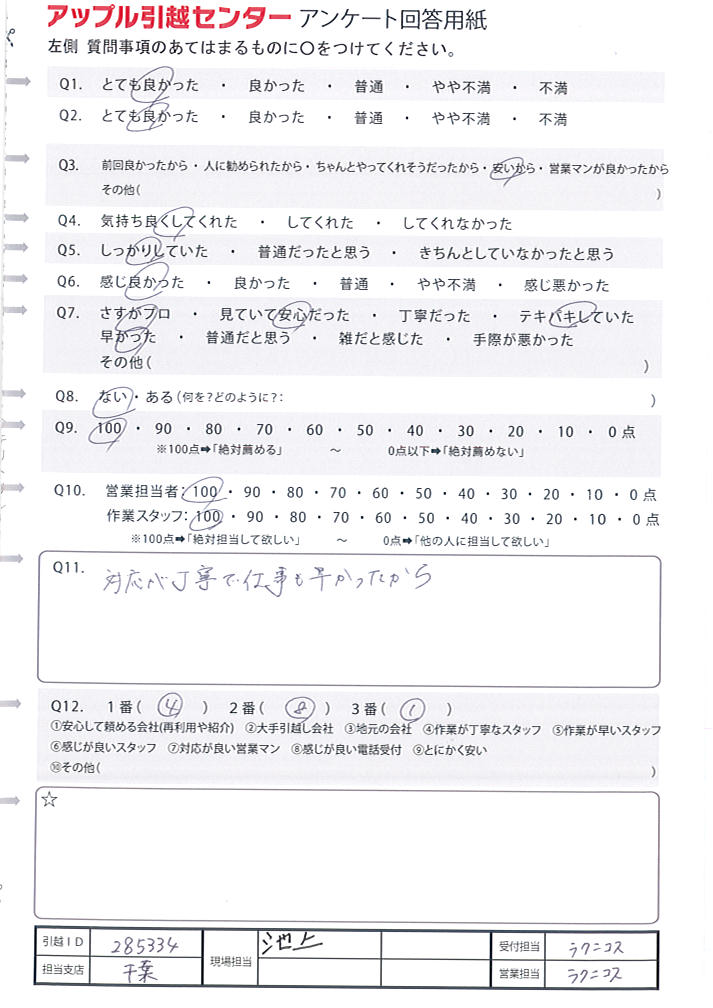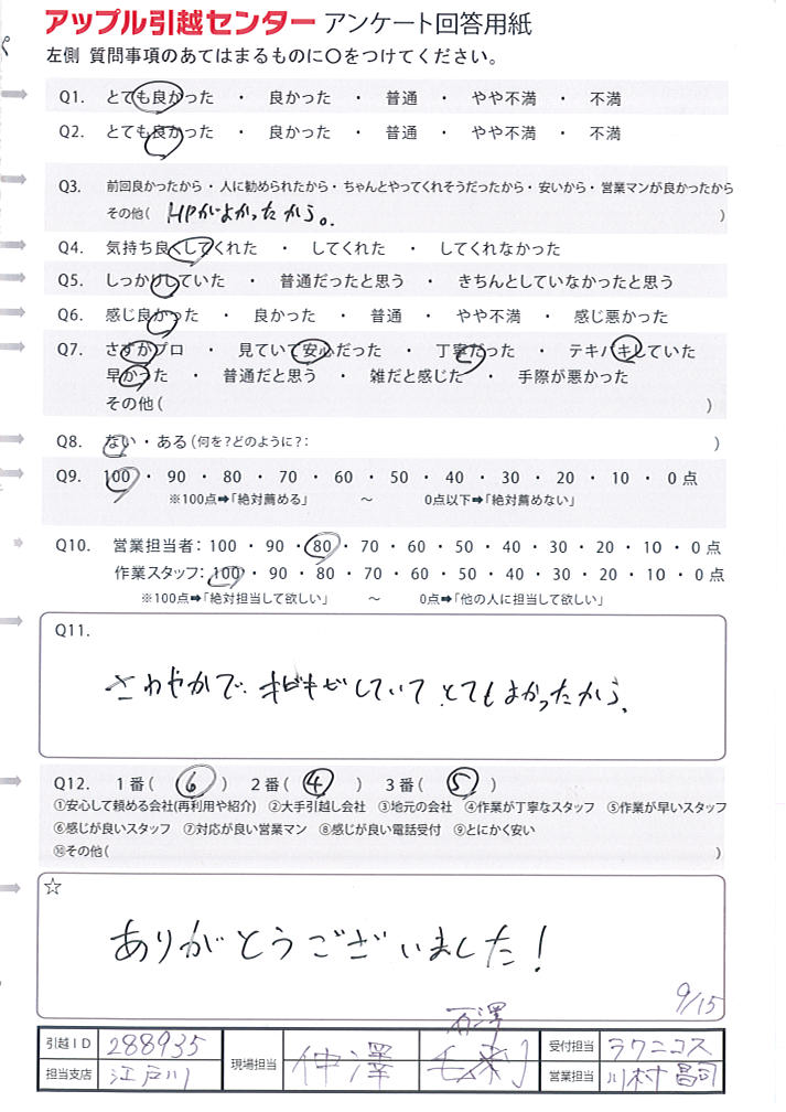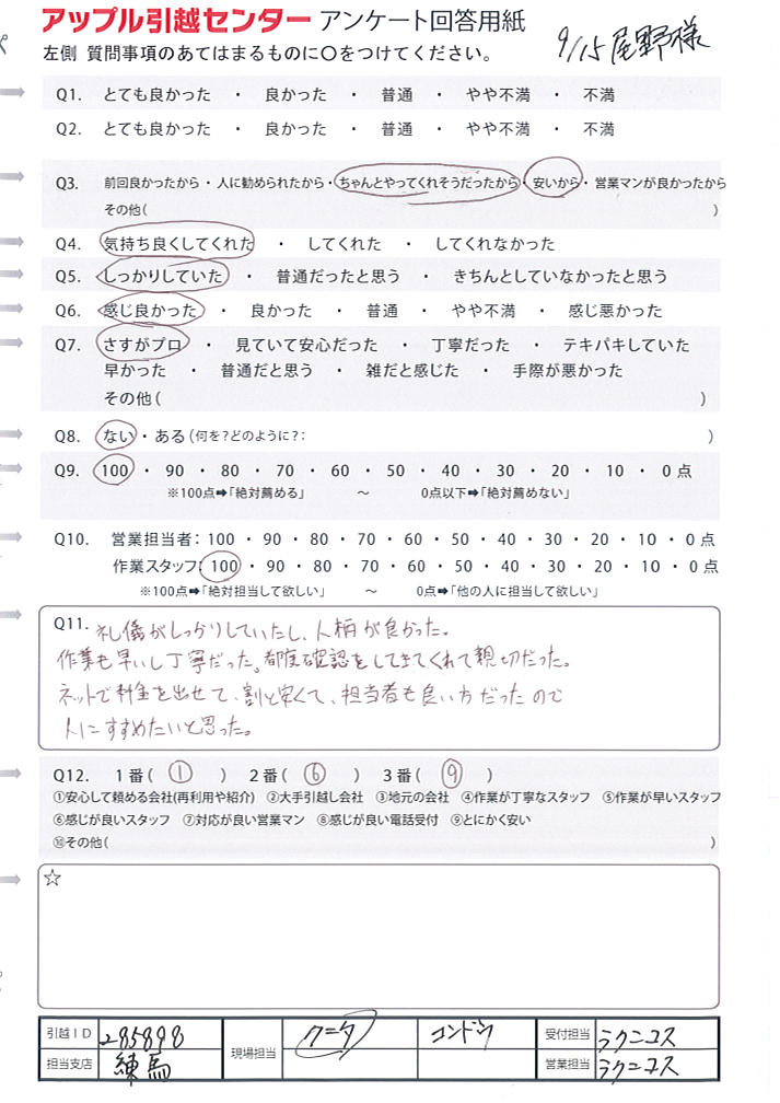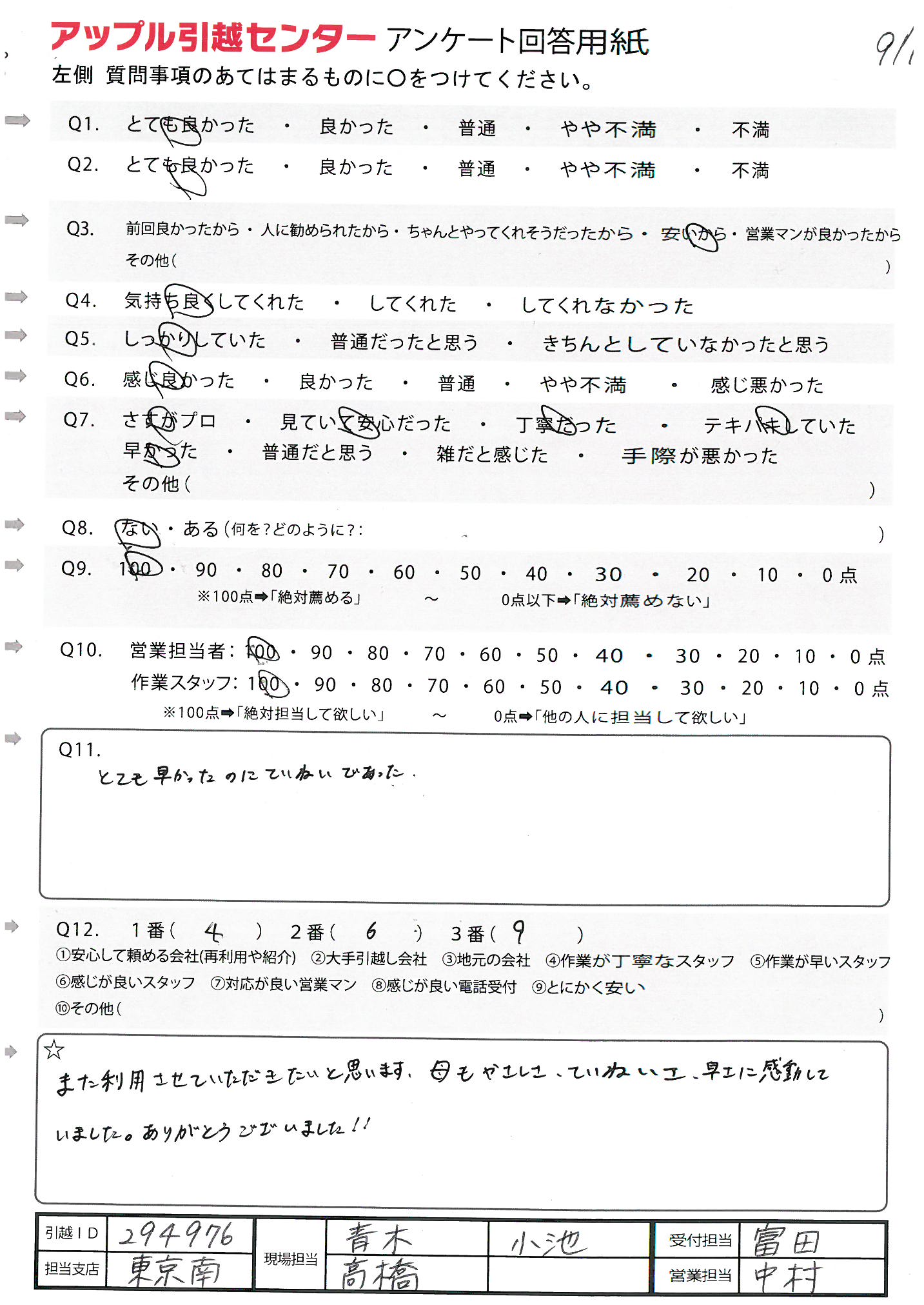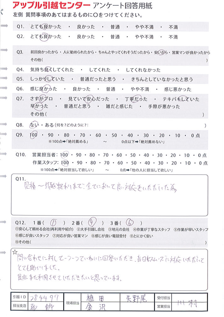 A.アンケート提出遅くなってしまい、申し訳ございません。 アップルさんにお願いして安心して引越しができました。 また次もお願いします。 お世話になりました!