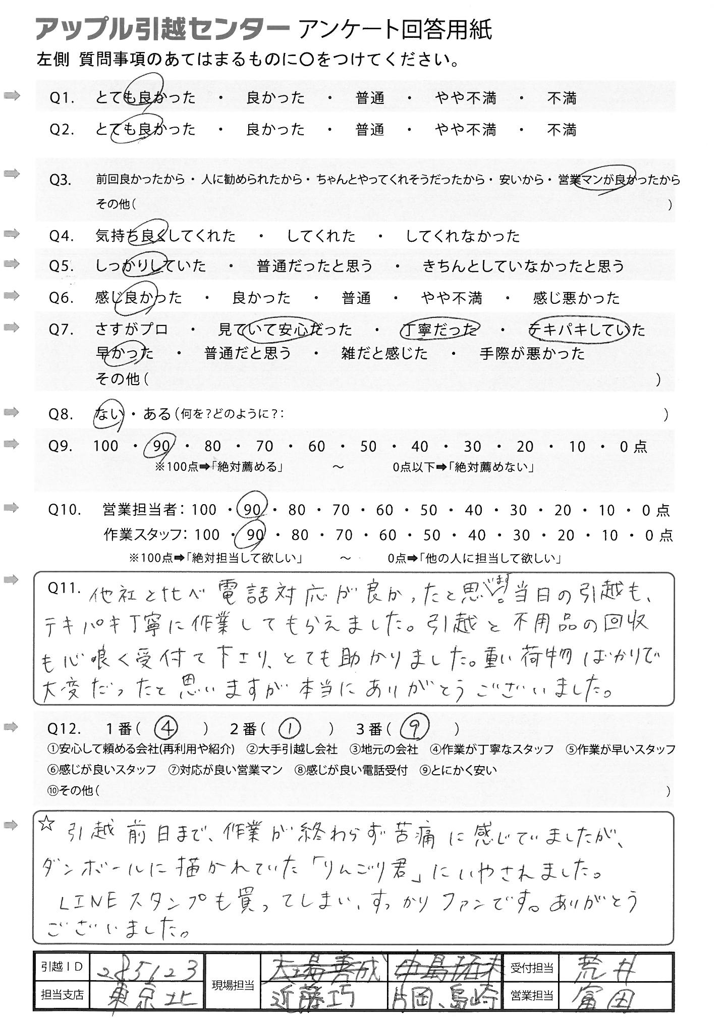 A.最初から最後まで丁寧な対応をしていただき、安心してお任せできました。 (冷蔵庫やPCデスクの件ではお手数をお掛けしました。) 次回引越しの際にも是非利用したいと思っています。 今回は本当にありがとうございました。