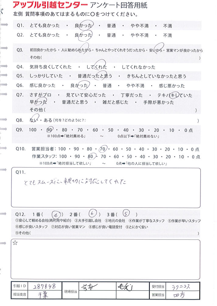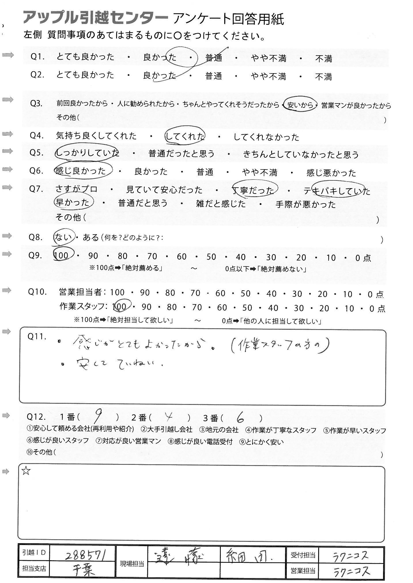 A.他社と比べ電話対応が良かったと思います。 当日の引越も、テキパキ丁寧に作業してもらえました。引越と不用品の回収も心良く受付けて下さり、とても助かりました。 重い荷物ばかりで大変だったと思いますが、本当にありがとうございました。