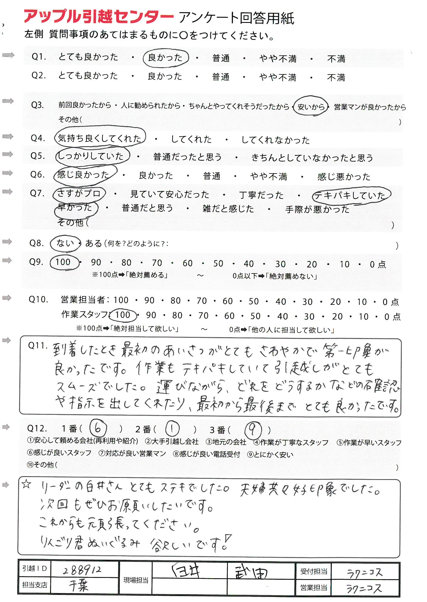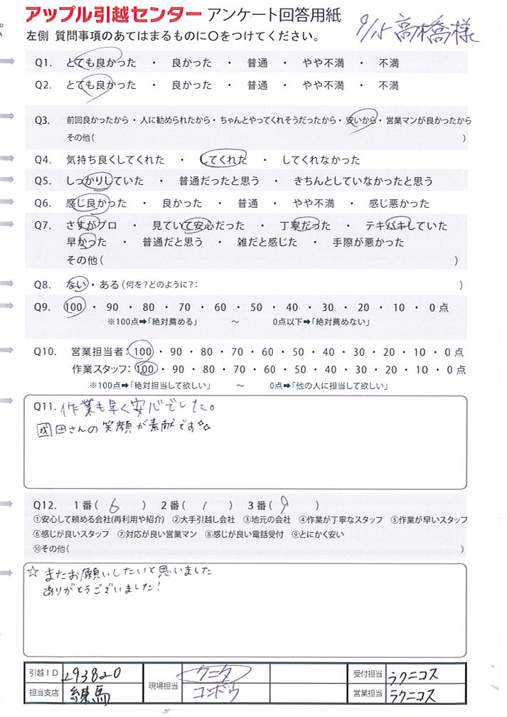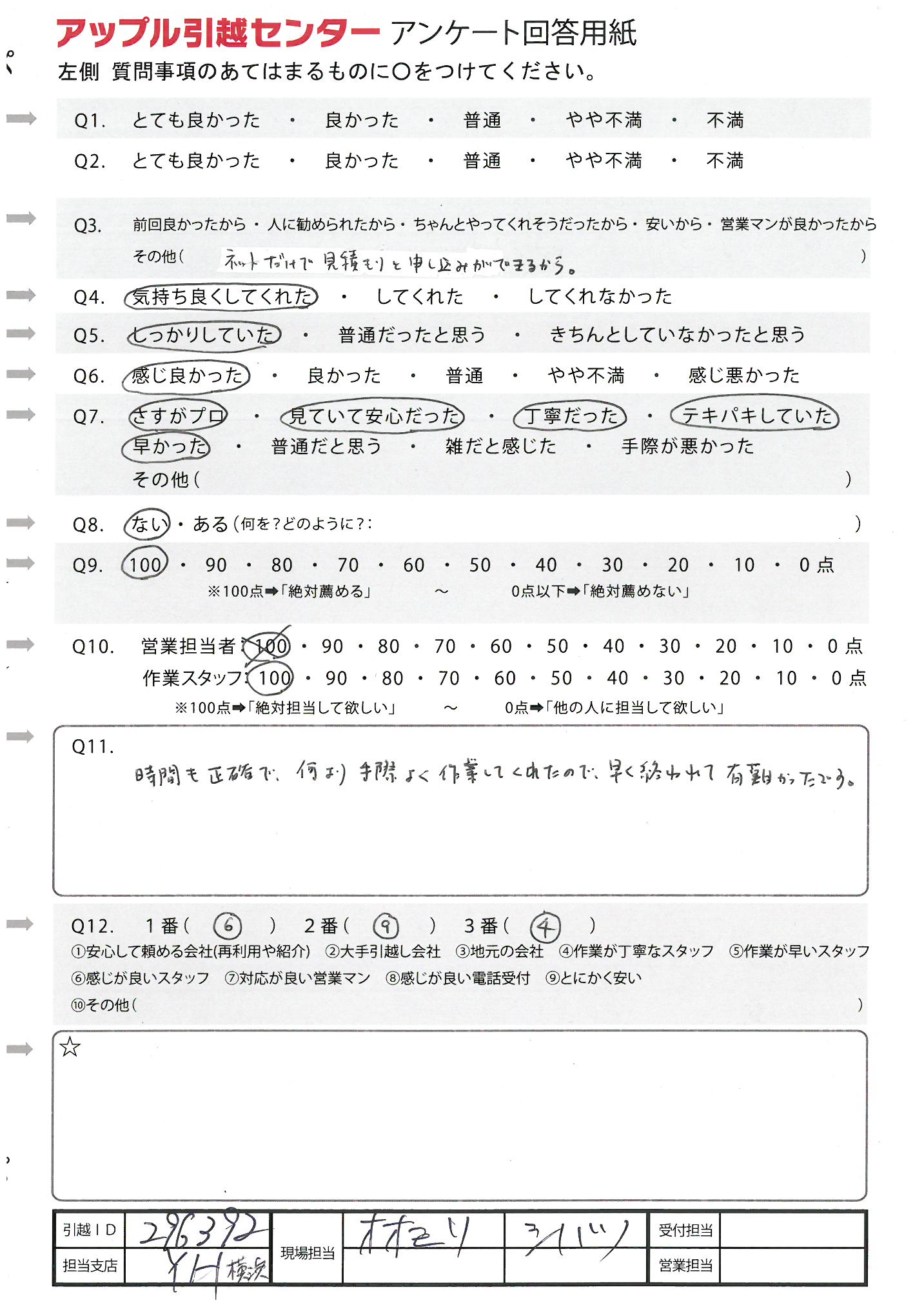 A.とてもテキパキしていて早かった。前回に続きとてもさわやかで次回引越しする時またお願いしたいと思いました。
