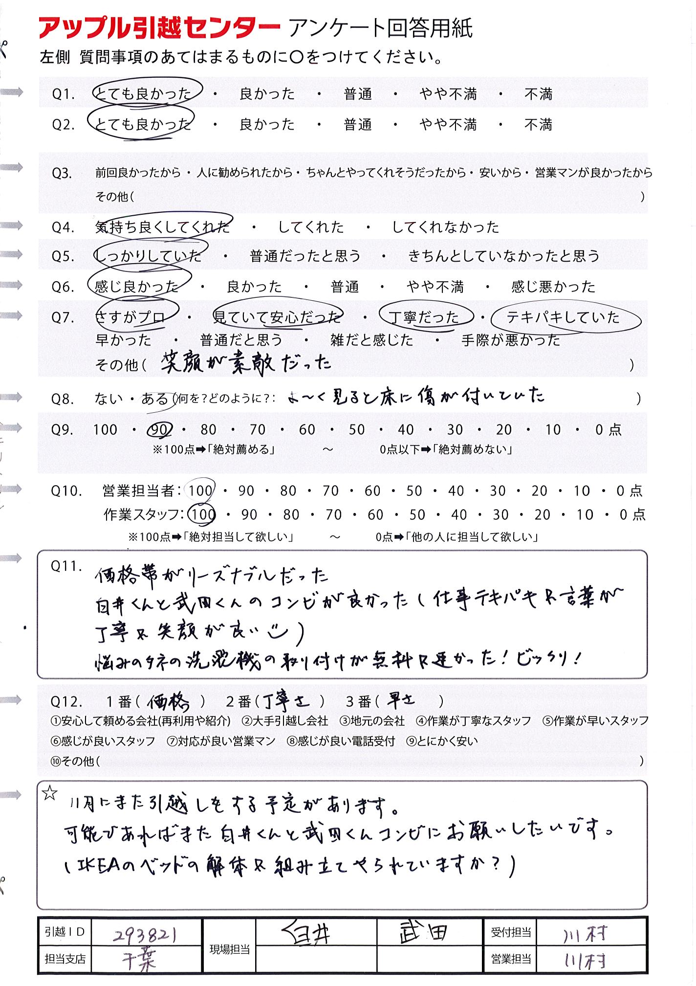A.11月にまた引越しをする予定があります。 可能であればまた白井くんと武田くんコンビにお願いしたいです。 (IKEAのベッドの解体&組み立てやられていますか?)