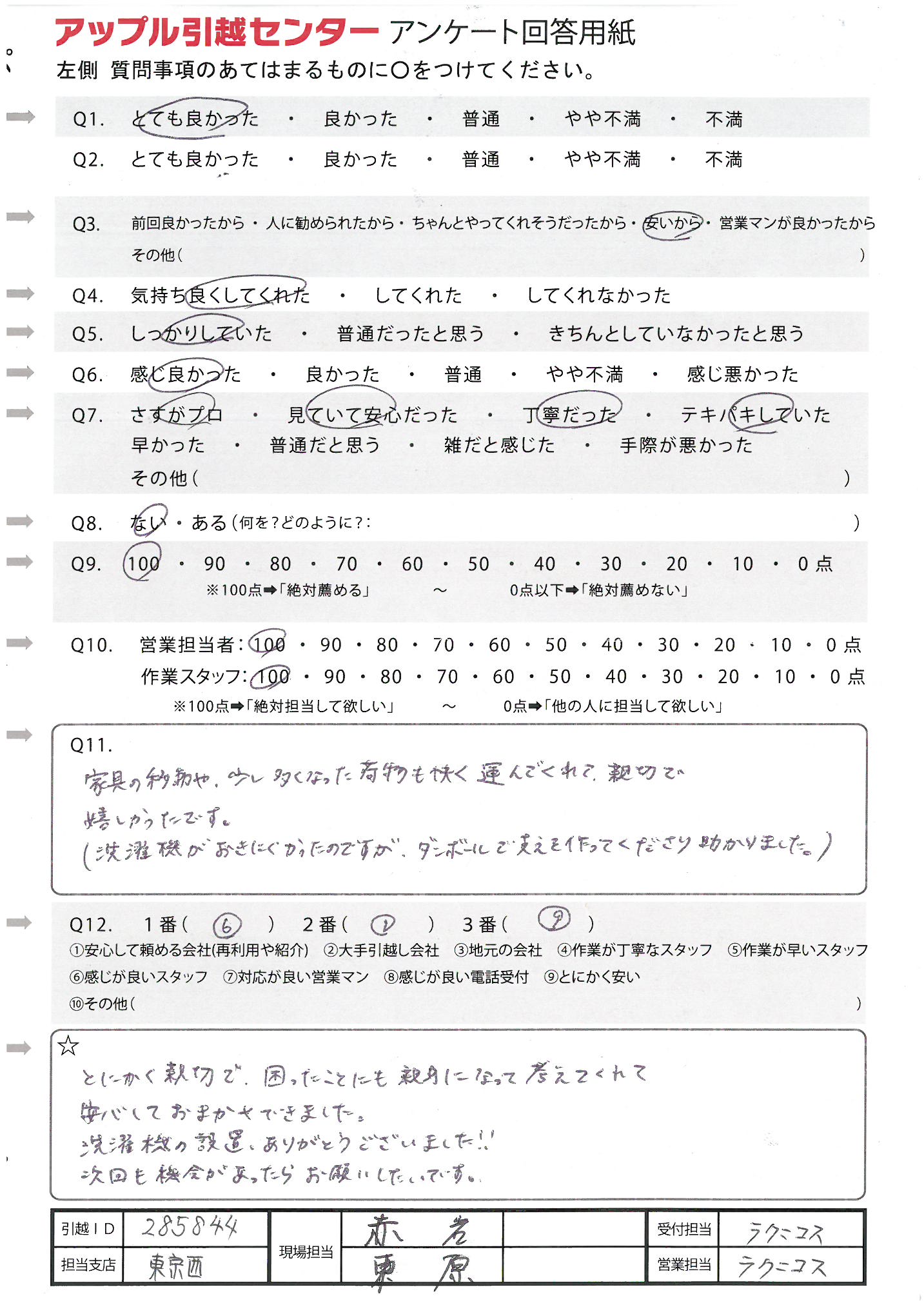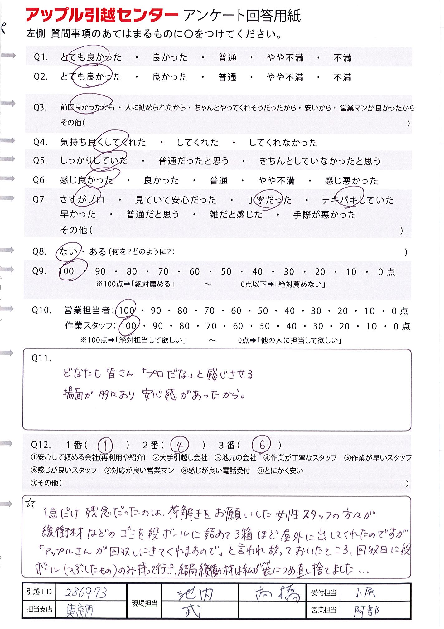 A.数社の見積もりをとって悩んだ結果、アップルさんに決めて本当に良かったです。 これまで、数回引越しを経験してきましたが、これほどストレスなく終えられたのは初めてです。 渡部さんの言葉にウソはありませんでした。 感謝の気持ちで一杯です。 ありがとうございました!