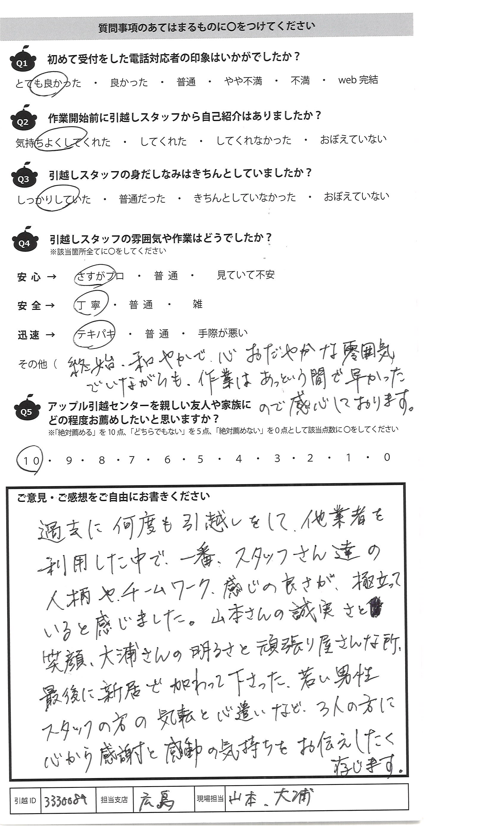A.過去に何度も引越しをして、他業者を 利用した中で、一番スタッフさん達の 人柄やチームワーク、感じの良さが、極立って いると感じました。山本さんの誠実さと 笑顔、大浦さんの明るさと頑張り屋さんな所、 最後に新居で加わって下さった、若い男性 スタッフの方の気転と心遣いなど、3人の方に 心から感謝と感動の気持ちをお伝えしたく 存じます。