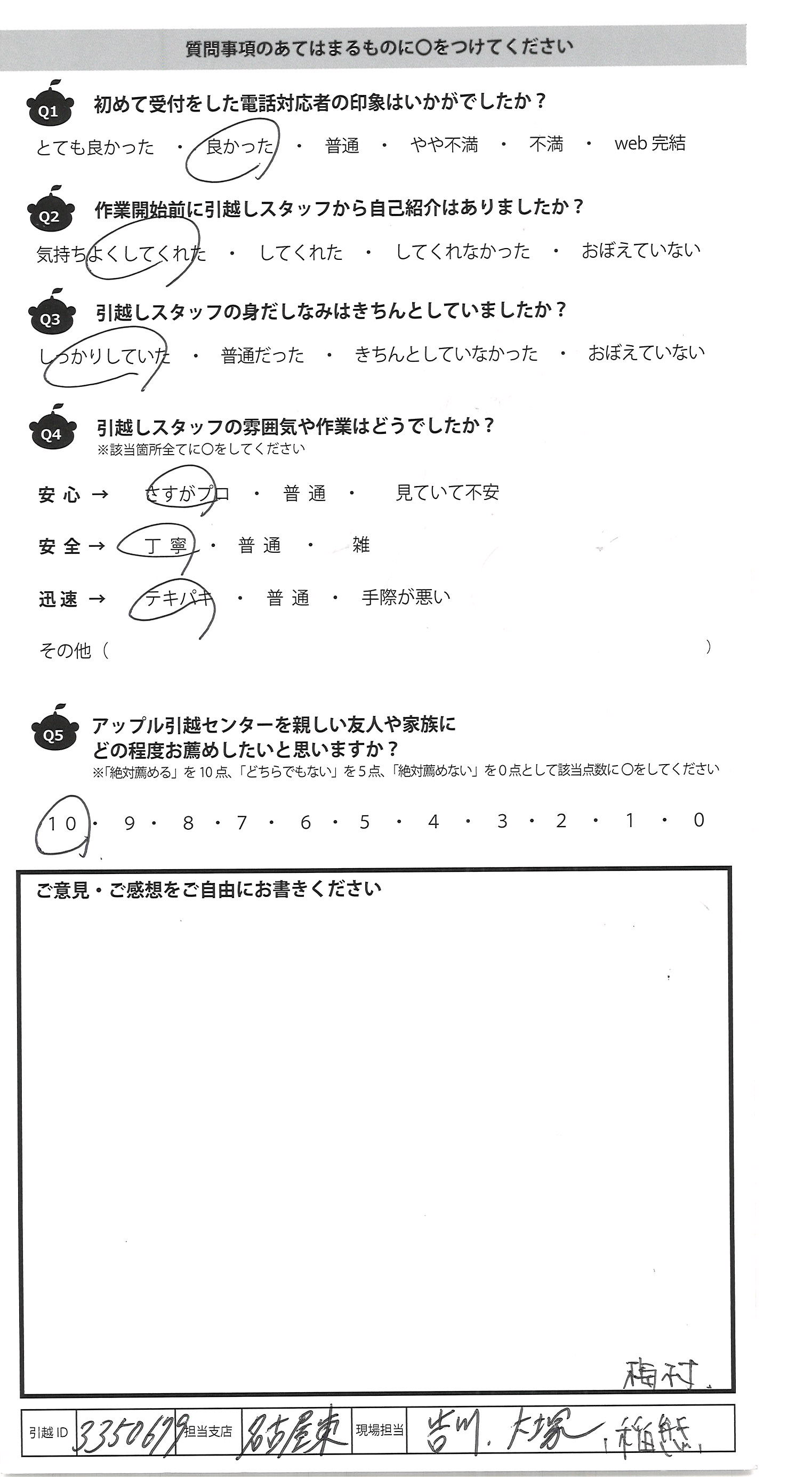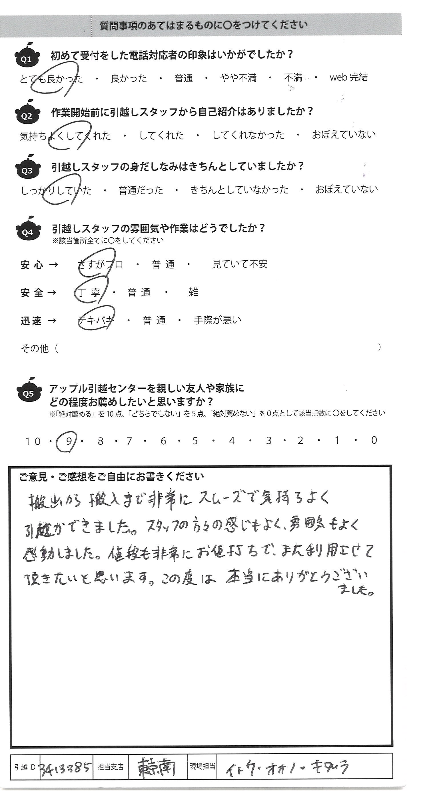 A.搬出から搬入まで非常にスムーズで気持ちよく 引越ができました。スタッフの方々の感じもよく、雰囲気もよく 感動しました。値段も非常にお値打ちで、また利用させて 頂きたいと思います。この度は本当にありがとうござい ました。