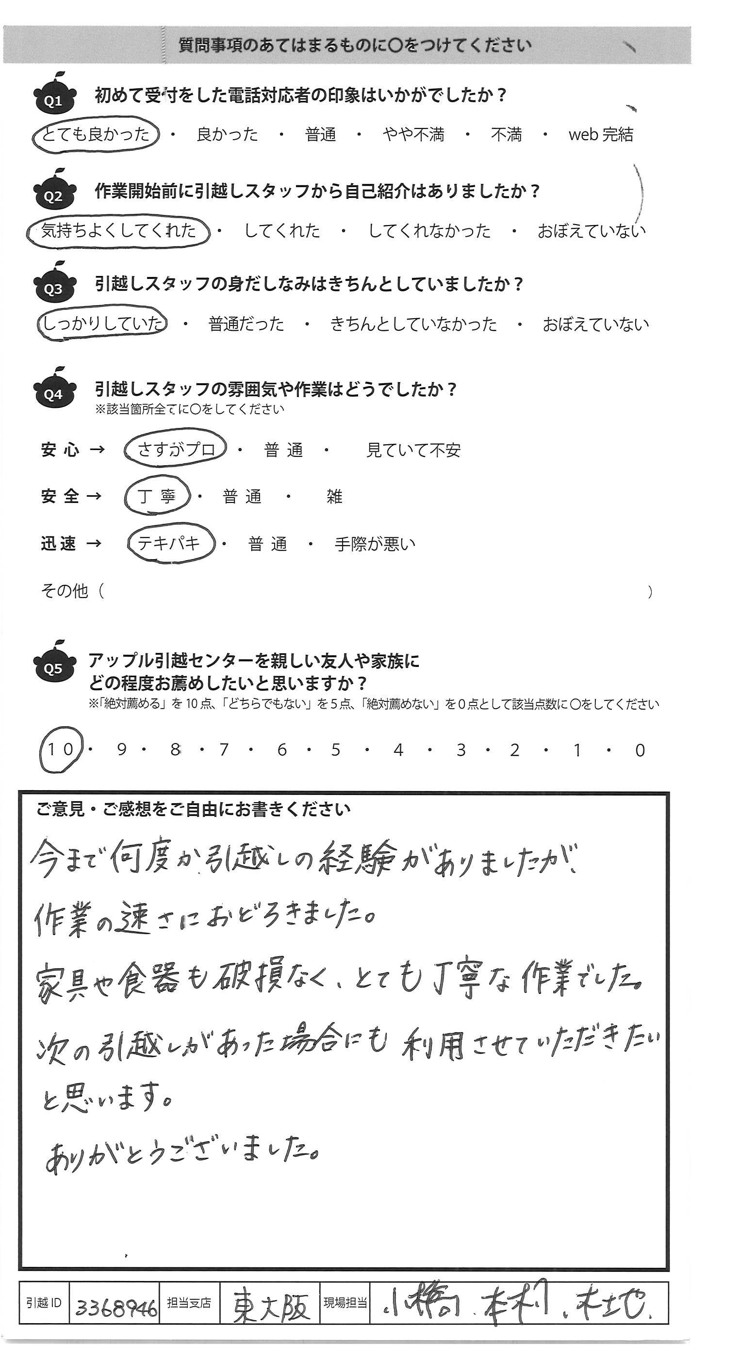 A.今まで何度か引越しの経験がありましたが、 作業の速さにおどろきました。 家具や食器も破損なく、とても丁寧な作業でした。 次の引越しがあった場合にも利用させていただきたい と思います。 ありがとうございました。