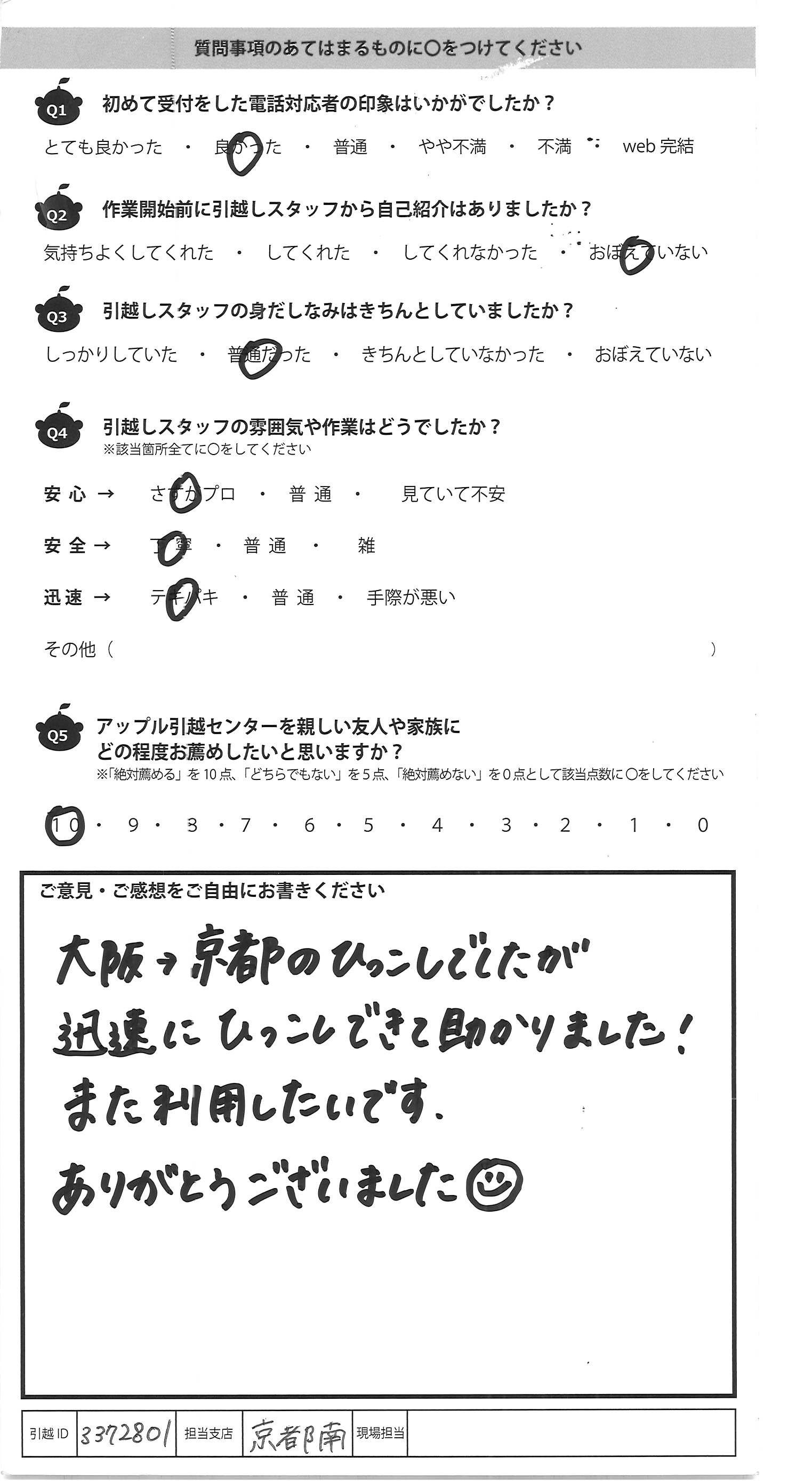 A.大阪→京都のひっこしでしたが 迅速にひっこしできて助かりました! また利用したいです ありがとうございました