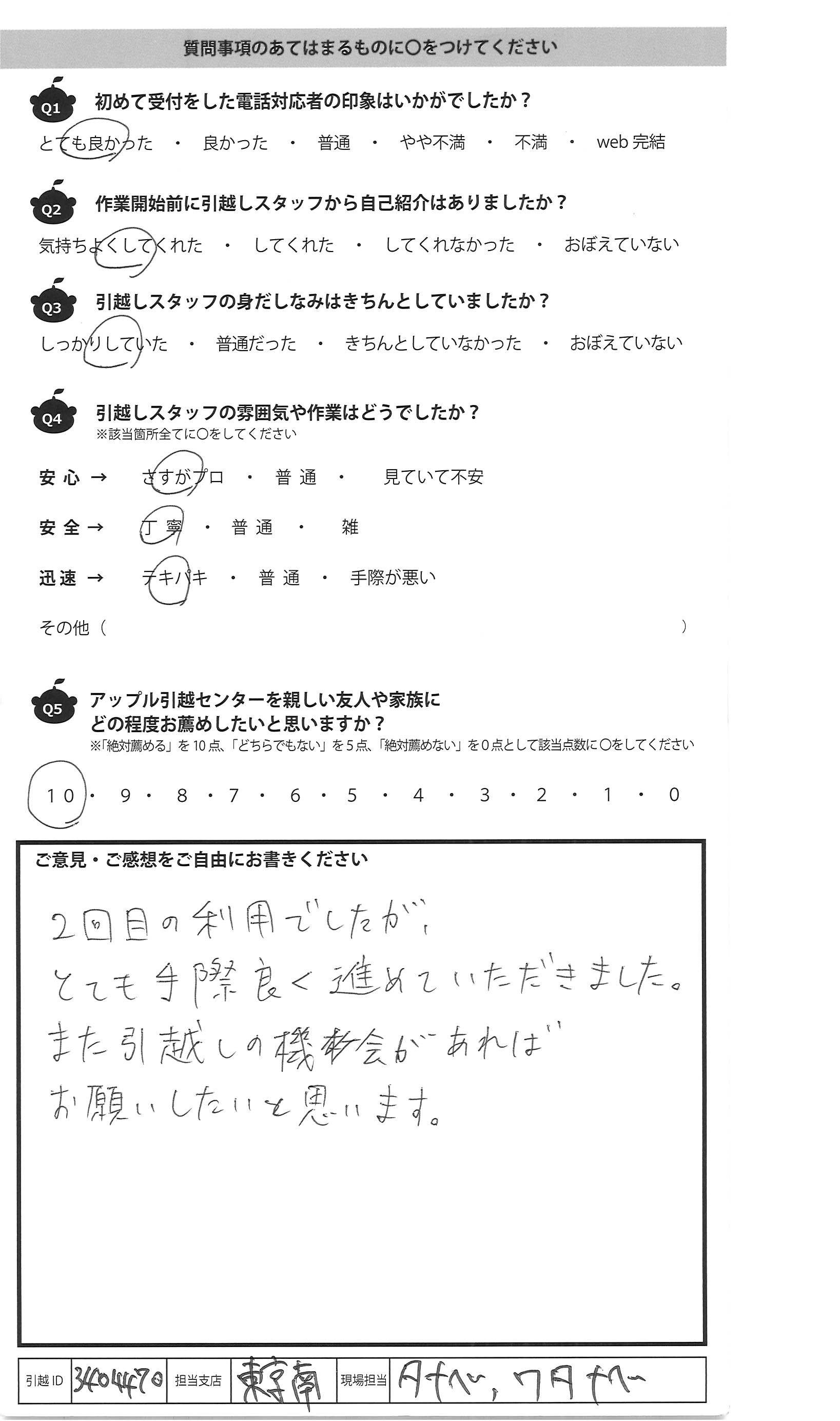 A.2回目の利用でしたが、 とても手際良く進めていただきました。 また引越しの機会があれば お願いしたいと思います。