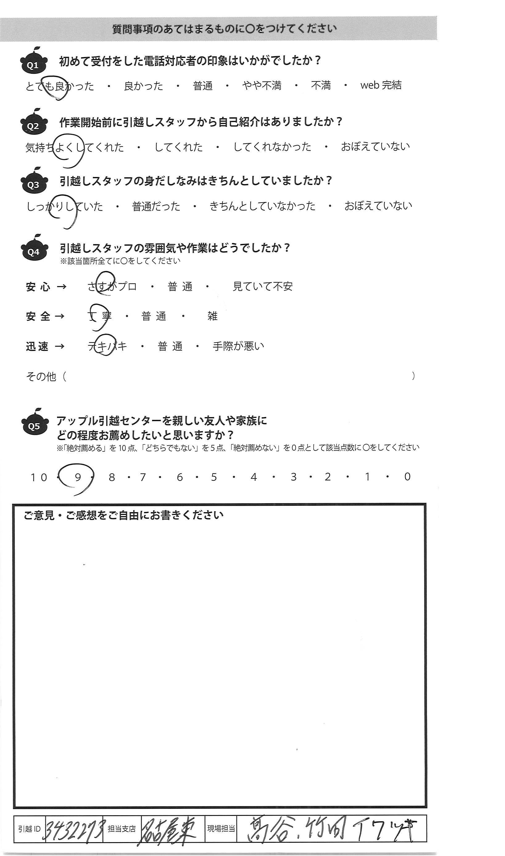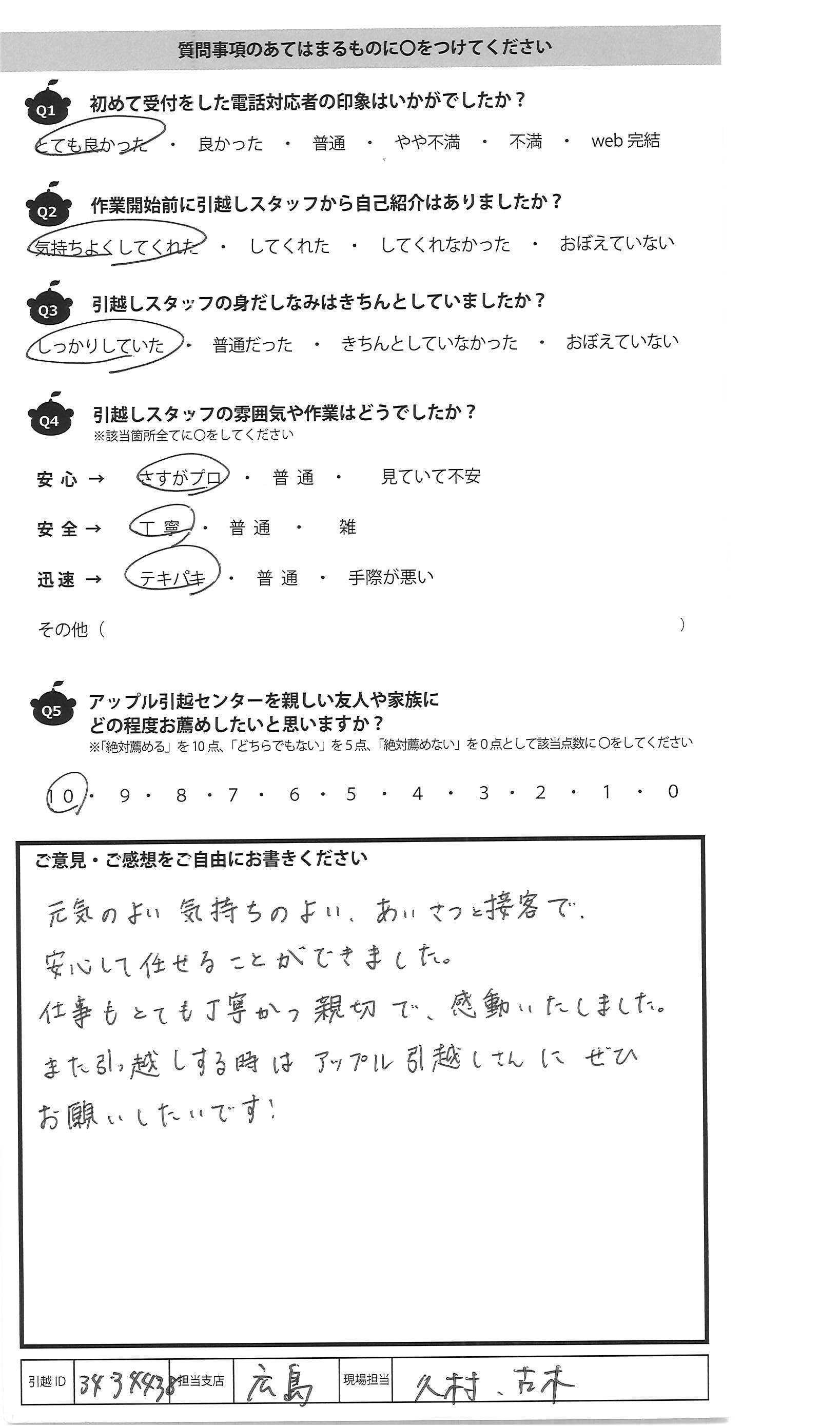 A.元気のよい気持ちのよい、あいさつと接客で、 安心して任せることができました。 仕事もとても丁寧かつ親切で、感動いたしました。 また引っ越しする時はアップル引越しさんにぜひ お願いしたいです!
