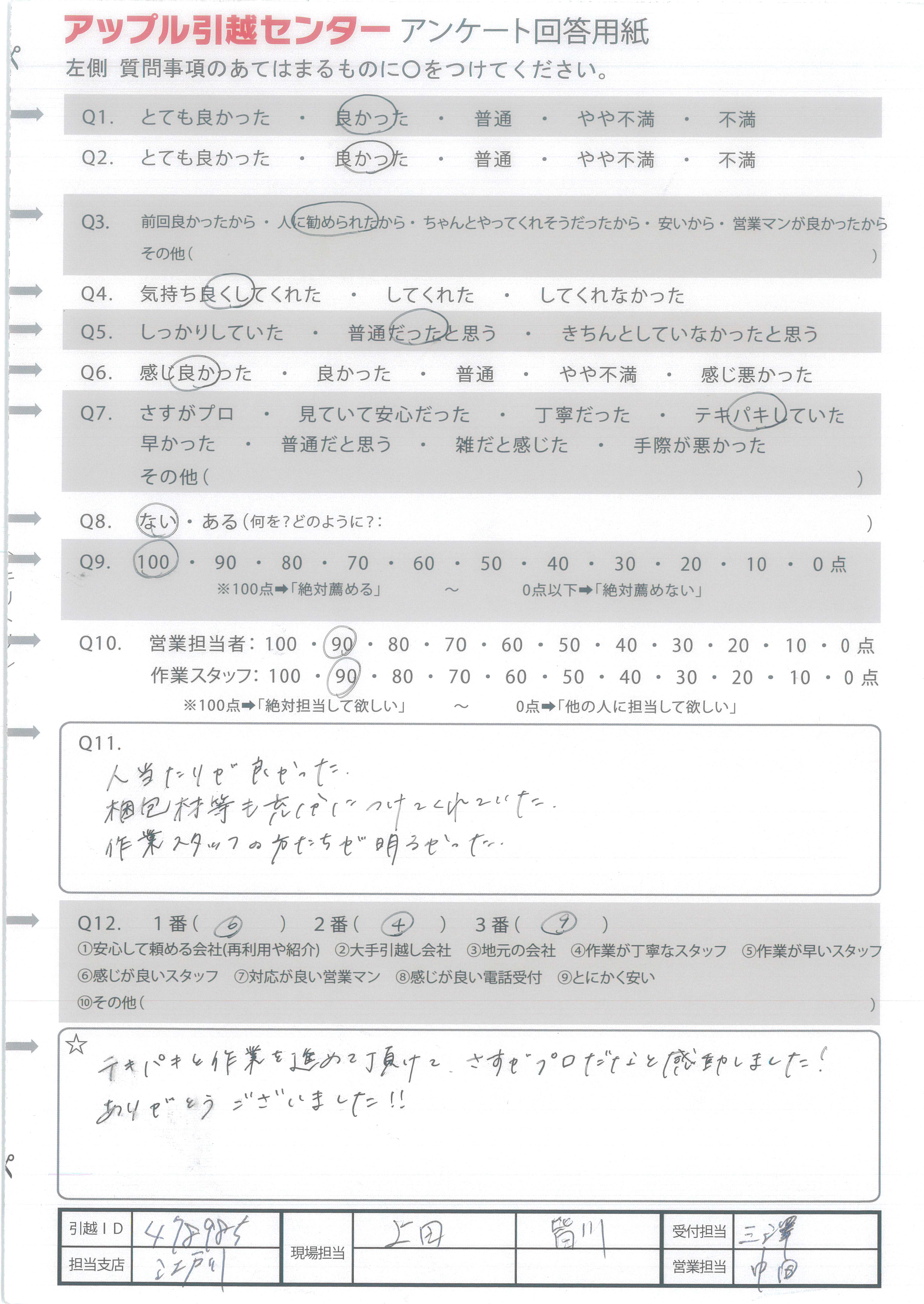 A.初めての引越しで不安でしたが、とても感じが良く丁寧かつ迅速に対応していただき、気持ちよく引越しすることができたました。