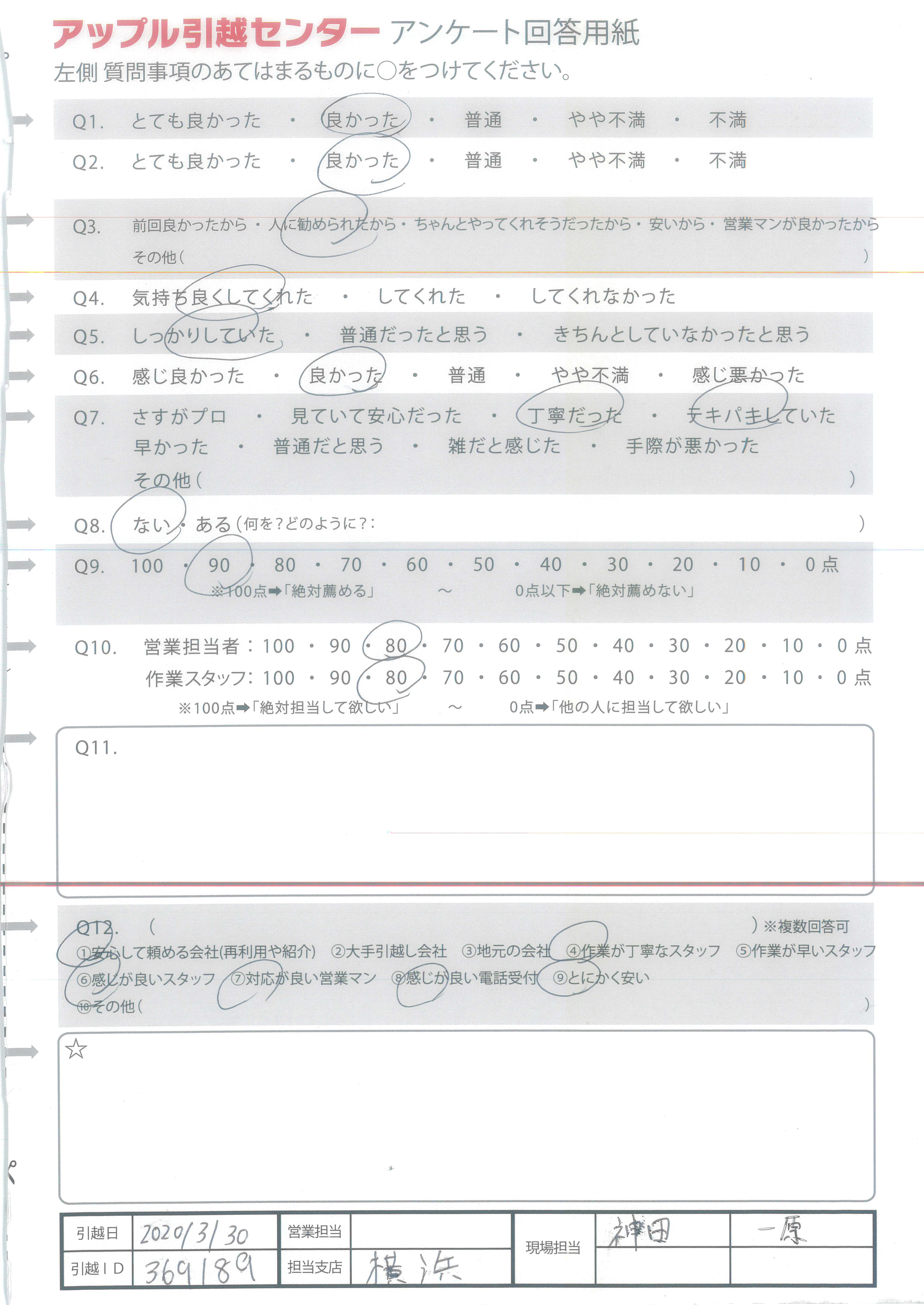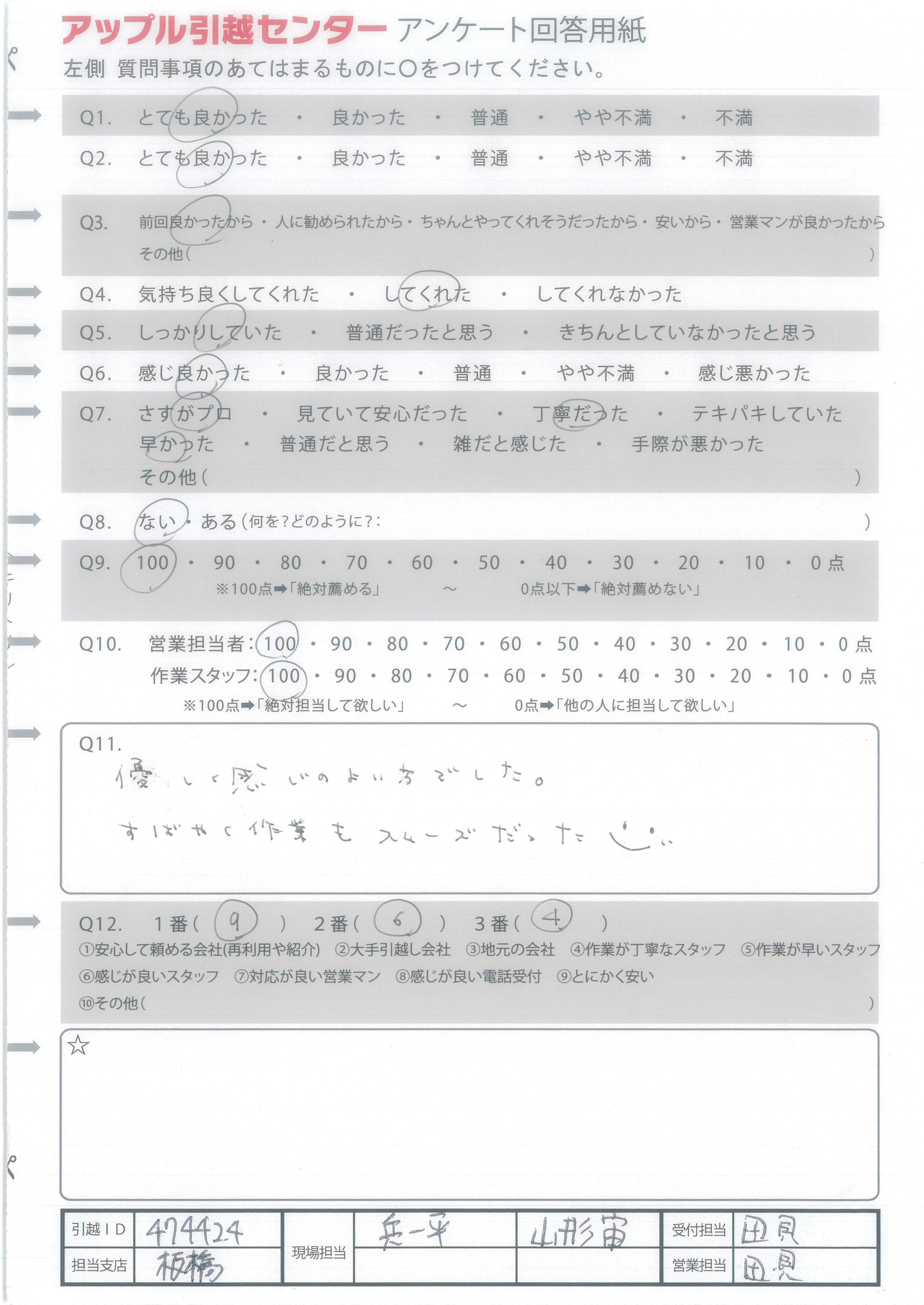 A.今まで何度か他社の引越し業社を頼んだ事がありましたがアップルさんが、一番良かったです。とても親切に対応して下さりありがとうございました。また引越しの時が、あれば今回担当だった方々にお願いしたいです。