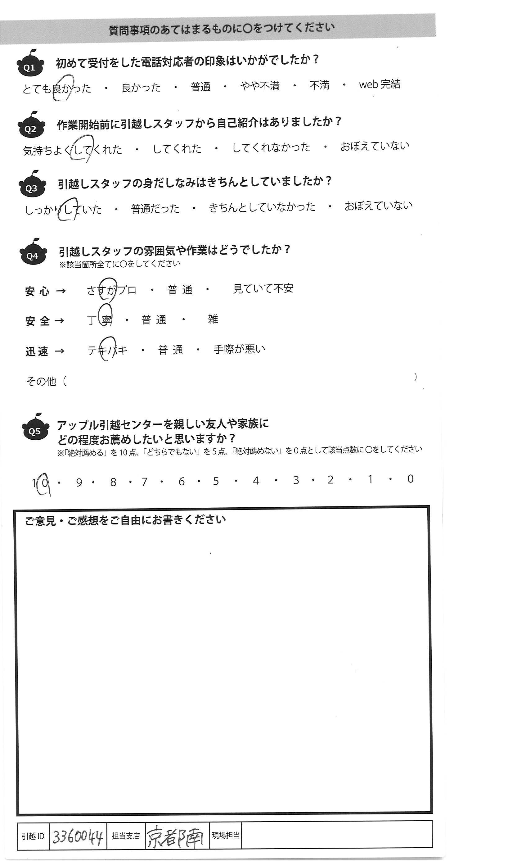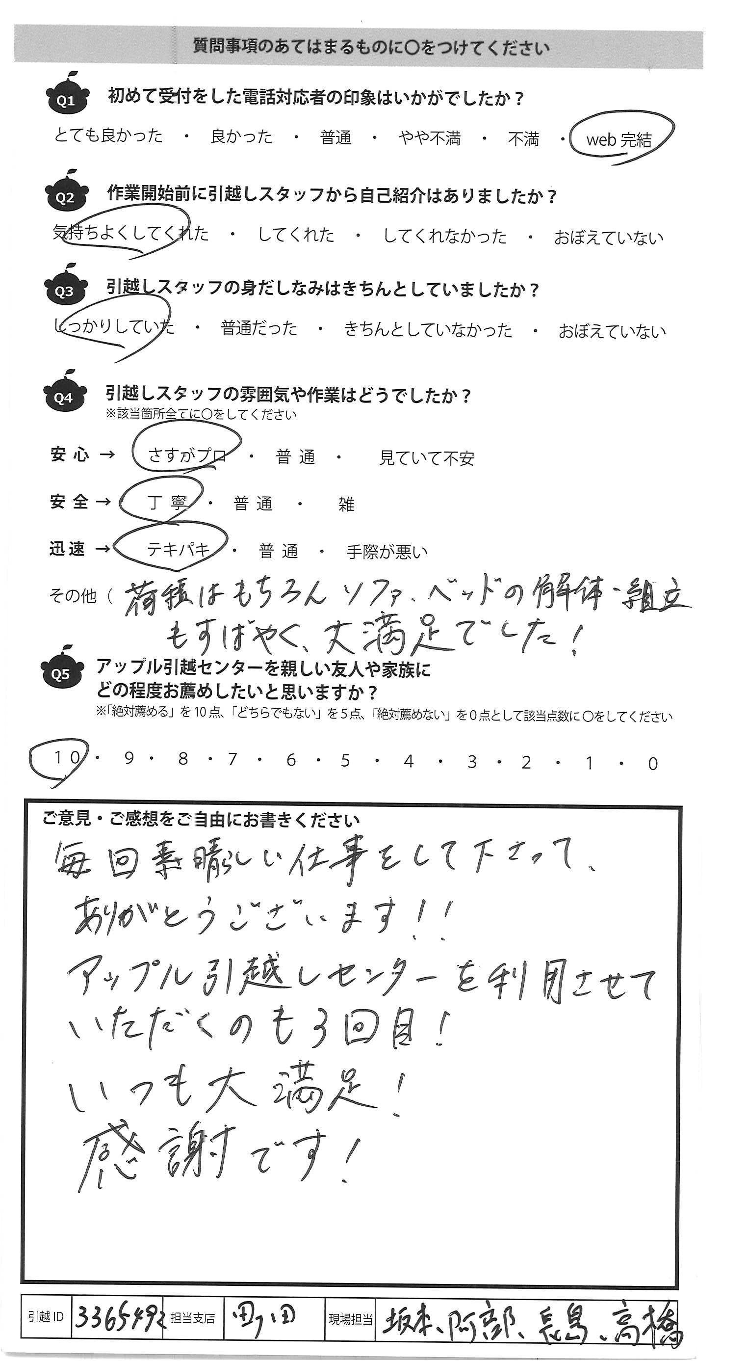 A.引越し当日ご対応いただいた方々は、とても丁寧にスピード 感を持って作業してくださりました。 退去するマンションの最後の掃除ができるように掃除機を 最後まで残しておいてくださったり、私が妊娠中のため 新居に搬入の際、クッションを先に出してくださったりとお心遣い いただいたおかげで安心して引越しすることができました。 お見積や当日ご対応いただいた方々に関しては、10点満点ですが ダンボールの引取が有料であることは引越し後に知ったため、 -2点となりました。今後はダンボール無料エリアを拡大していた だけるとありがたかったです。 今回は大変お世話になりました。ありがとうございました。