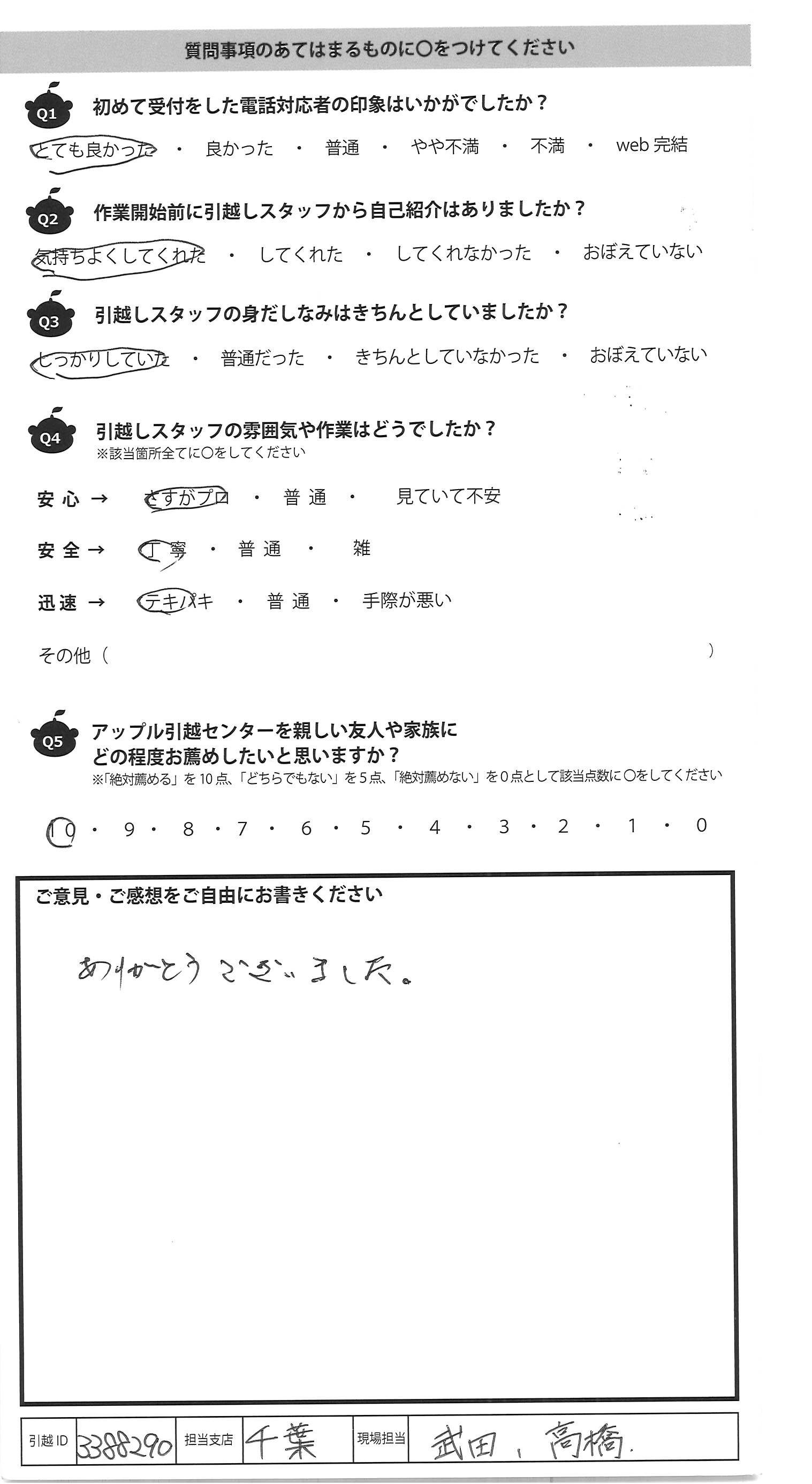 A.とても気持ちの良いご対応と引越し作業をして頂きました。 お値段も良心的で、利用して良かったです。 ありがとうございました。