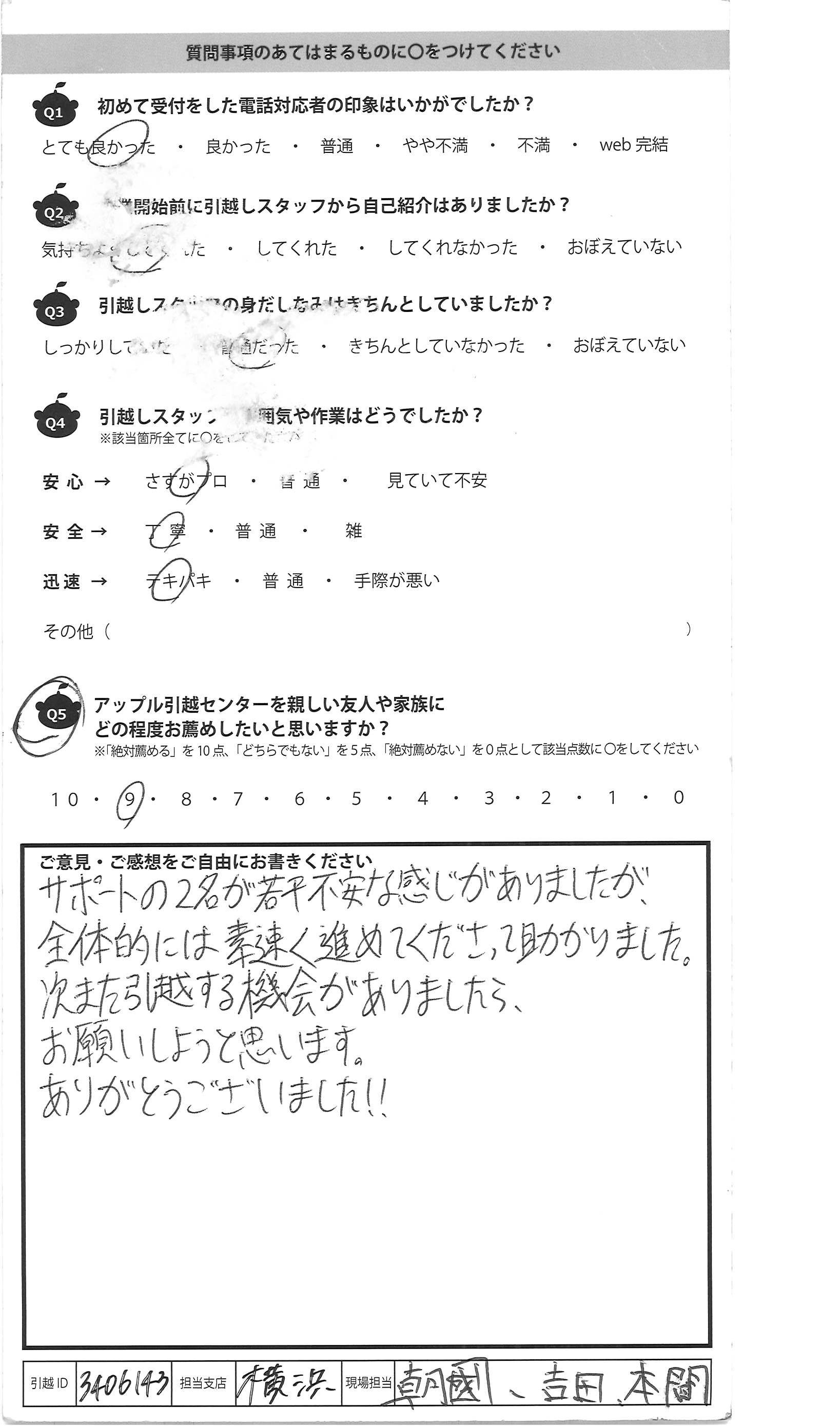 アップル引越センターでは、面映いお褒めの言葉も、胸に突き刺さるお叱りのコメントも、