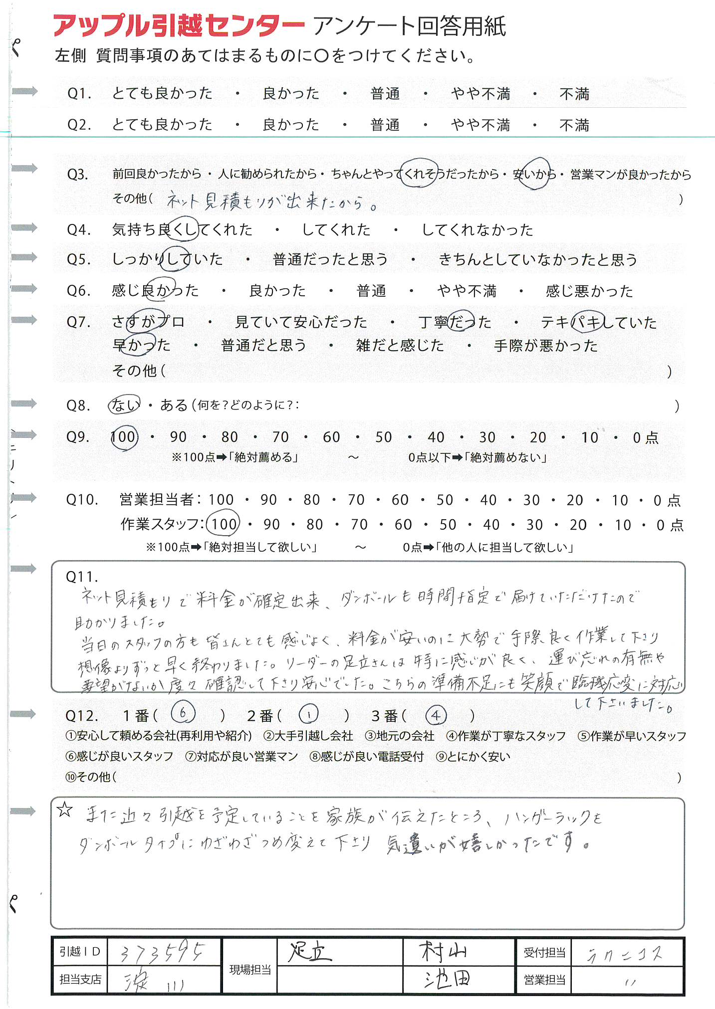 A.Q9の理由:今回の単身での利用だったので、単身で利用される方にはおすすめします 家族での利用は分からないため、90点をさせて頂きました。 Q10の理由:営業の方は丁寧に素早く見積もり頂きました。 他社の電話見積もりよりも早くて楽でした。 作業の方はあっという間に搬出搬入して頂きました。 想像していたよりも半分以上早く済みました。 1個1個丁寧にやって頂きましたし、チームワークが良いなと思いました。