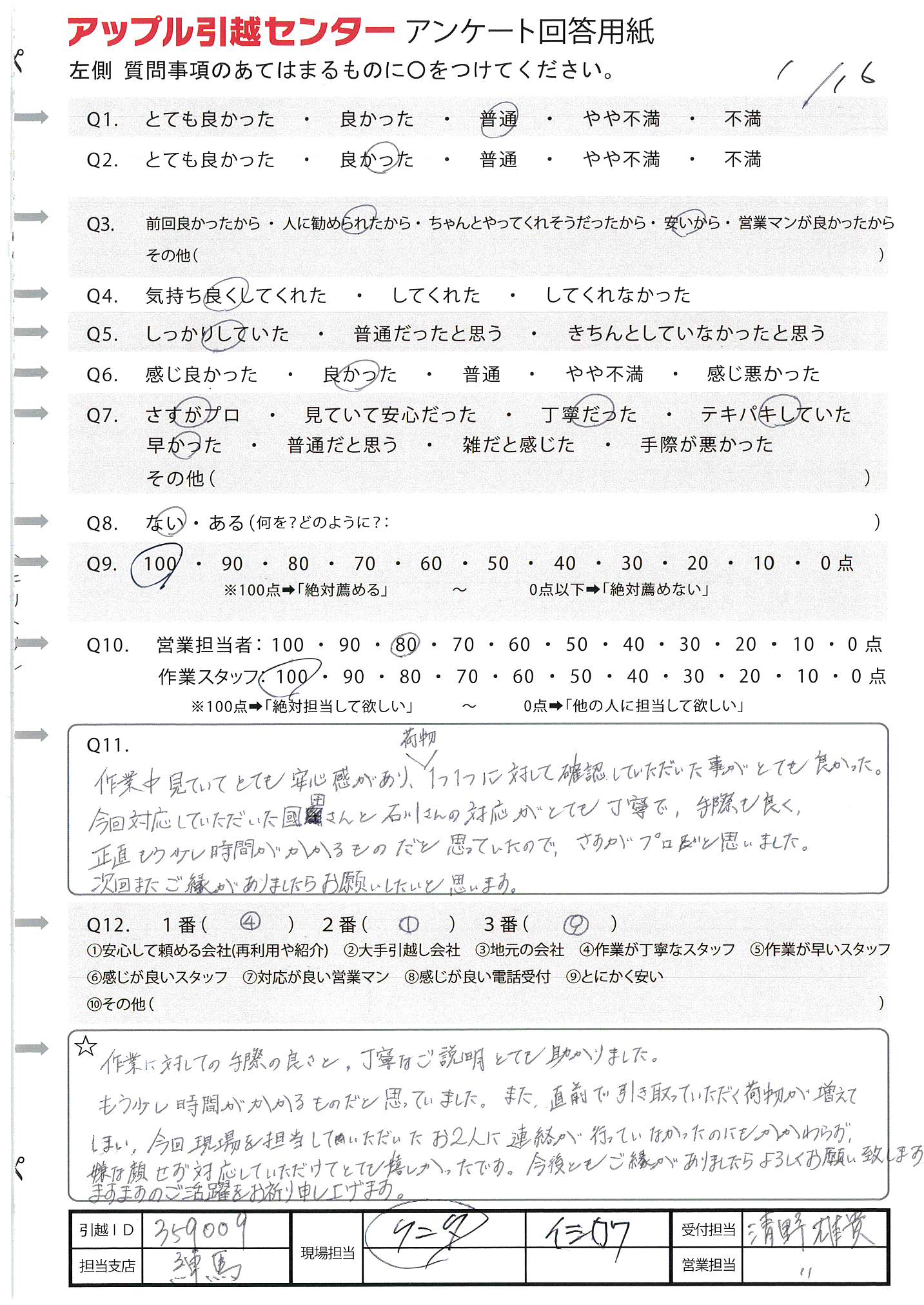 A.作業中見ていてとても安心感があり、荷物1つ1つに対して確認していただいた事がとても良かった。 今回対応していただいた國田さんと石川さんの対応がとても丁寧で。手際も良く、正直もう少し時間がかかるものだと思っていたので、さすがプロだと思いました。 次回またご縁がありましたらお願いしたいと思います。