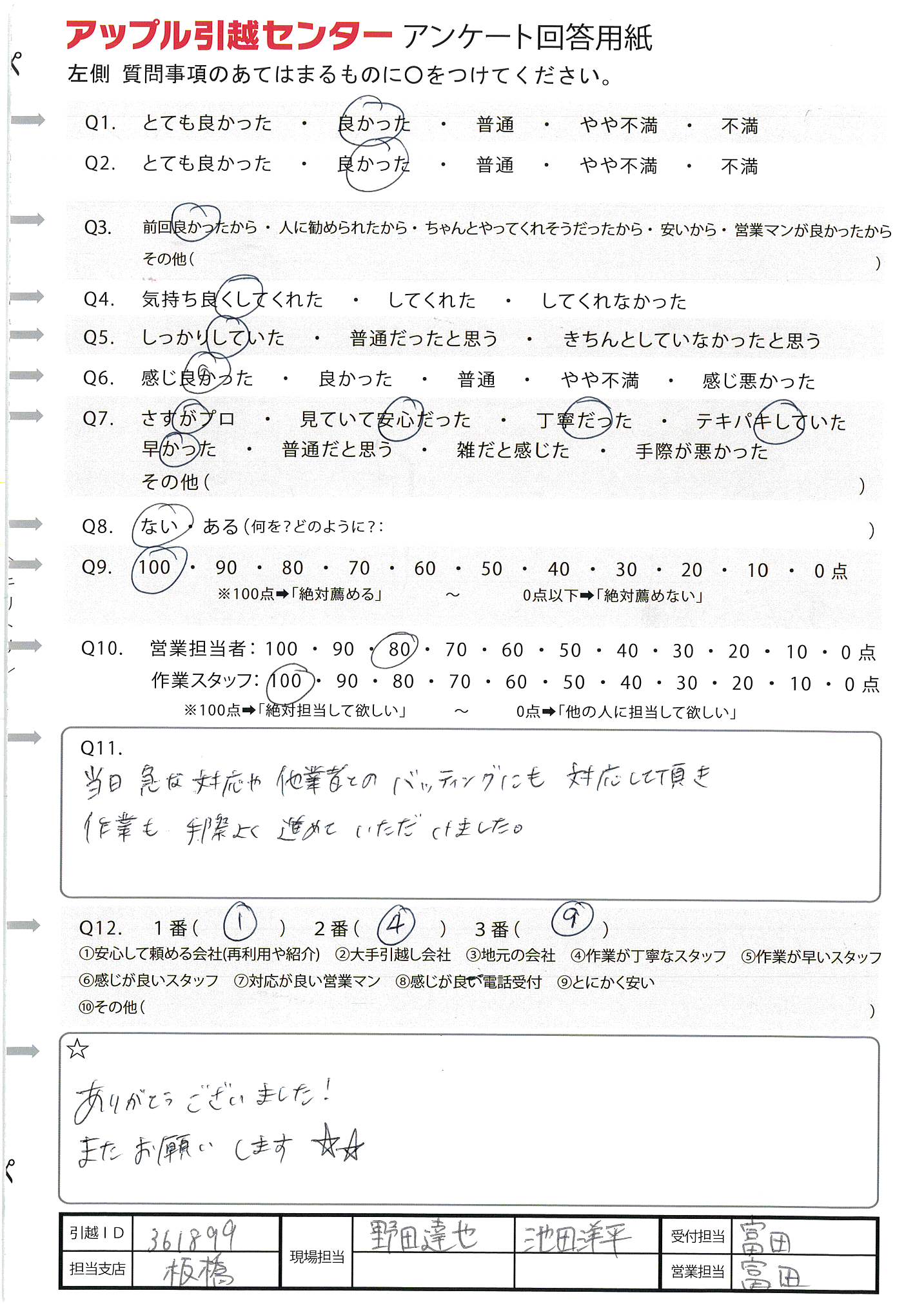 A.営業担当者については最後の確認の電話はつながらなかったのですが、 引越し前に質問の電話をした際の対応は質問にすぐ答えて頂きよかったです。 作業スタッフについては来て頂いた3名ともていねいでテキパキしていて、 レンジの配線を教えてくれたり、洗たく機の蛇口がパッキンが劣化しているのを 教えてくれたり、ベッドの組み立ての要望をきいてくれたりと思っていた以上の対応を して下さりとても良かったです。また次もアップルさんにたのみたいと思います。