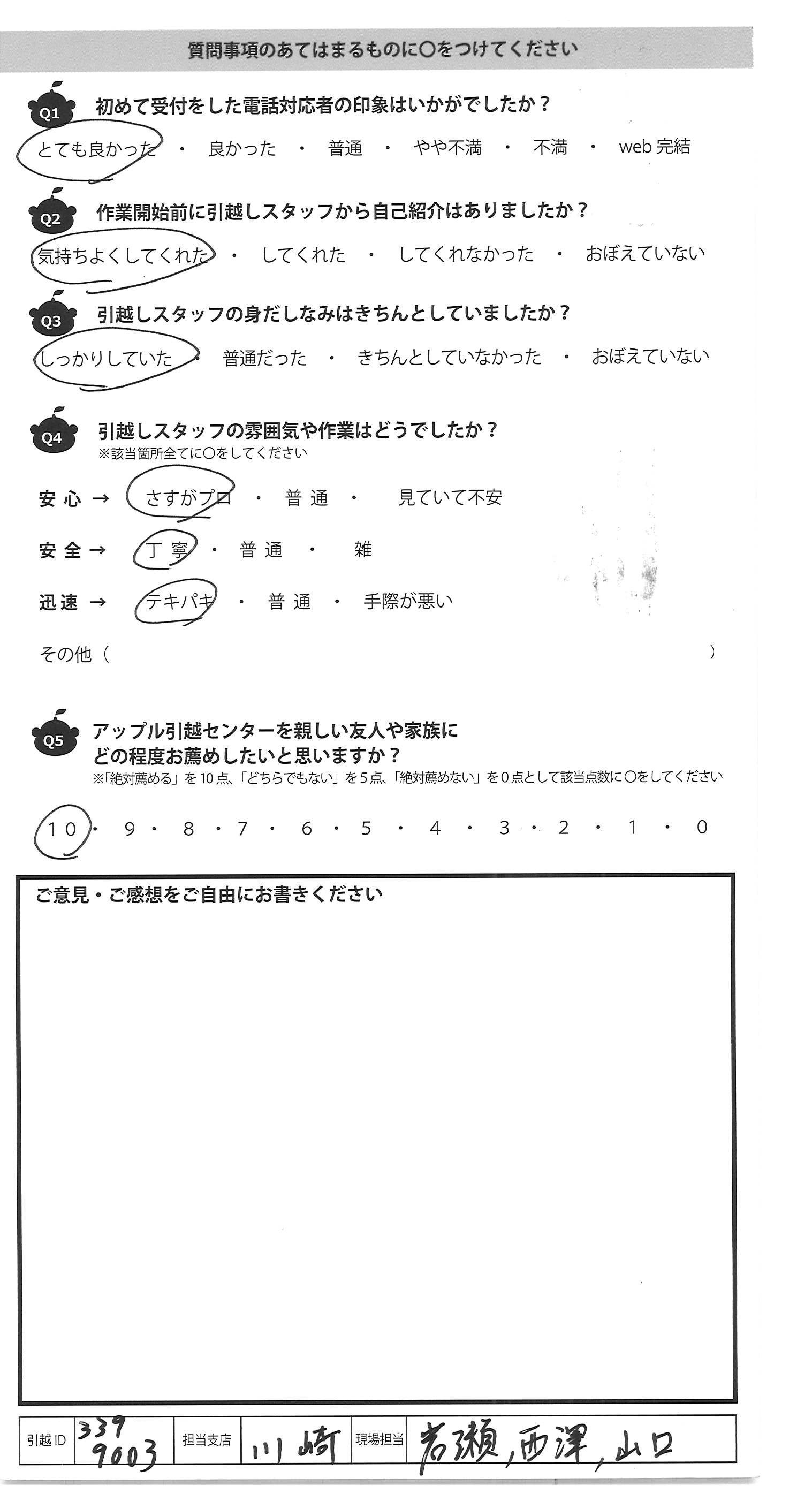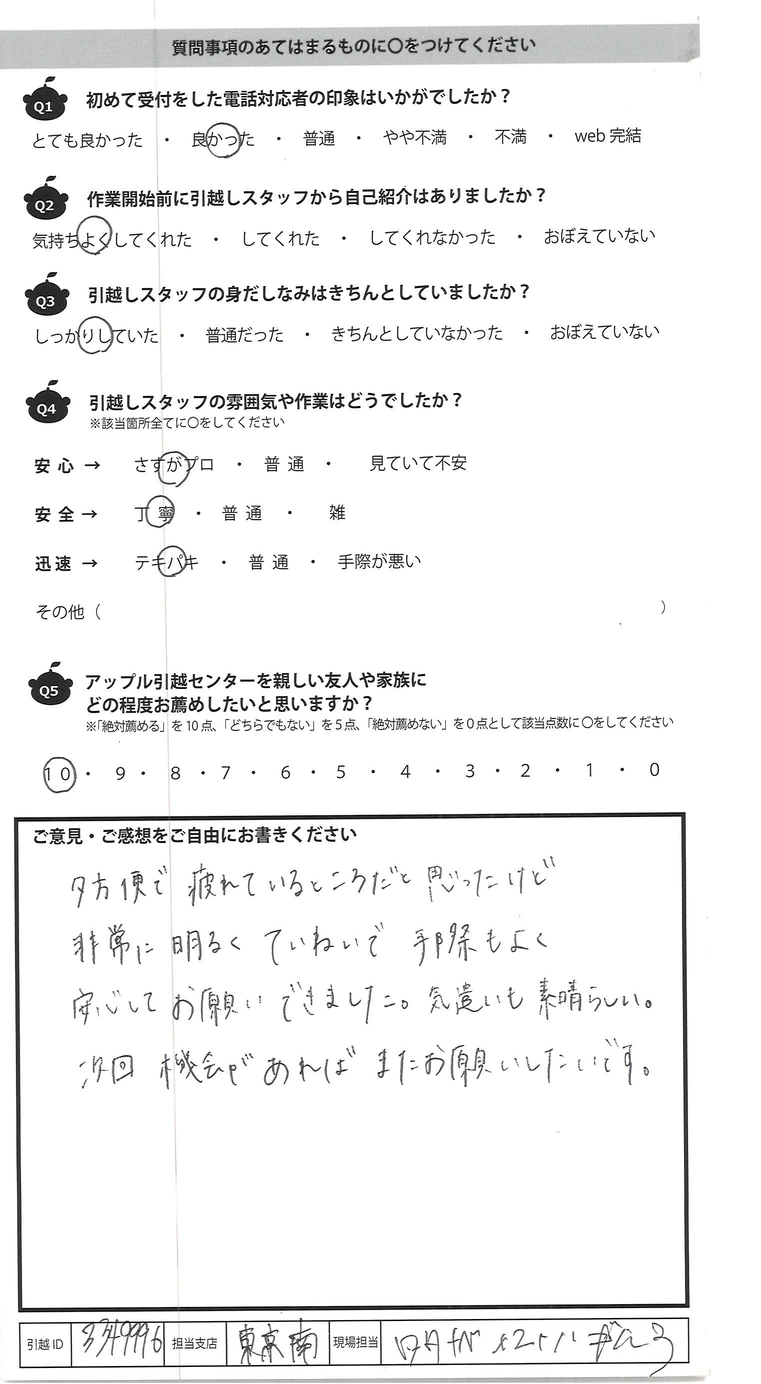 A.髙橋さんの お気遣いと段取りが素晴らしかったです。 好印象で人当たりが良く、 臨機応変、スムーズにご対応いただきました。 最初の電話応愛から完了まで丁寧で、 アップル引越センター様の品質の高さを 感じました。依頼して良かったです。 ありがとうございました。