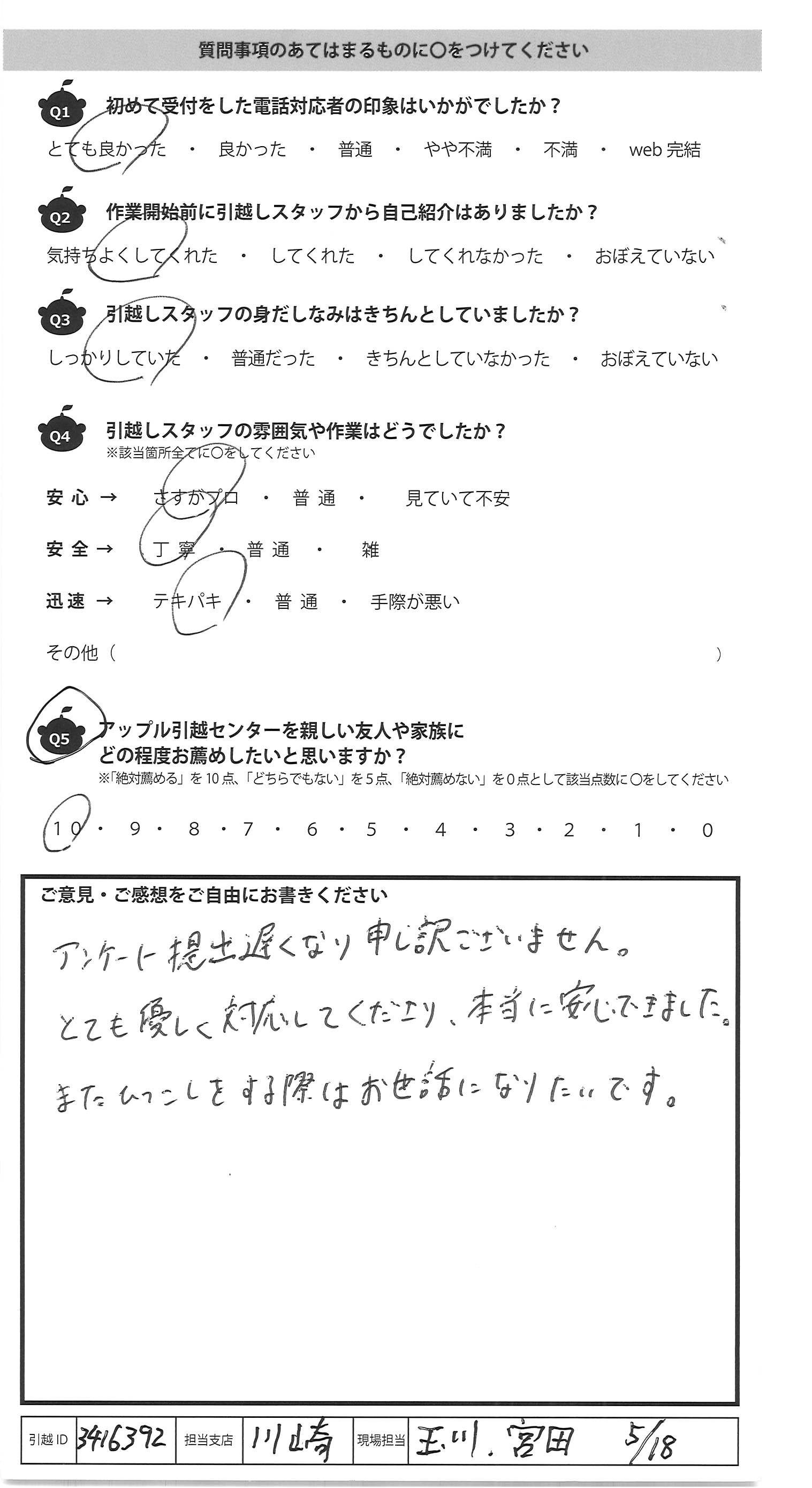 A.アンケート提出遅くなり申し訳ございません。 とても優しく対応してくださり、本当に安心できました。 またひっこしをする際はお世話になりたいです。