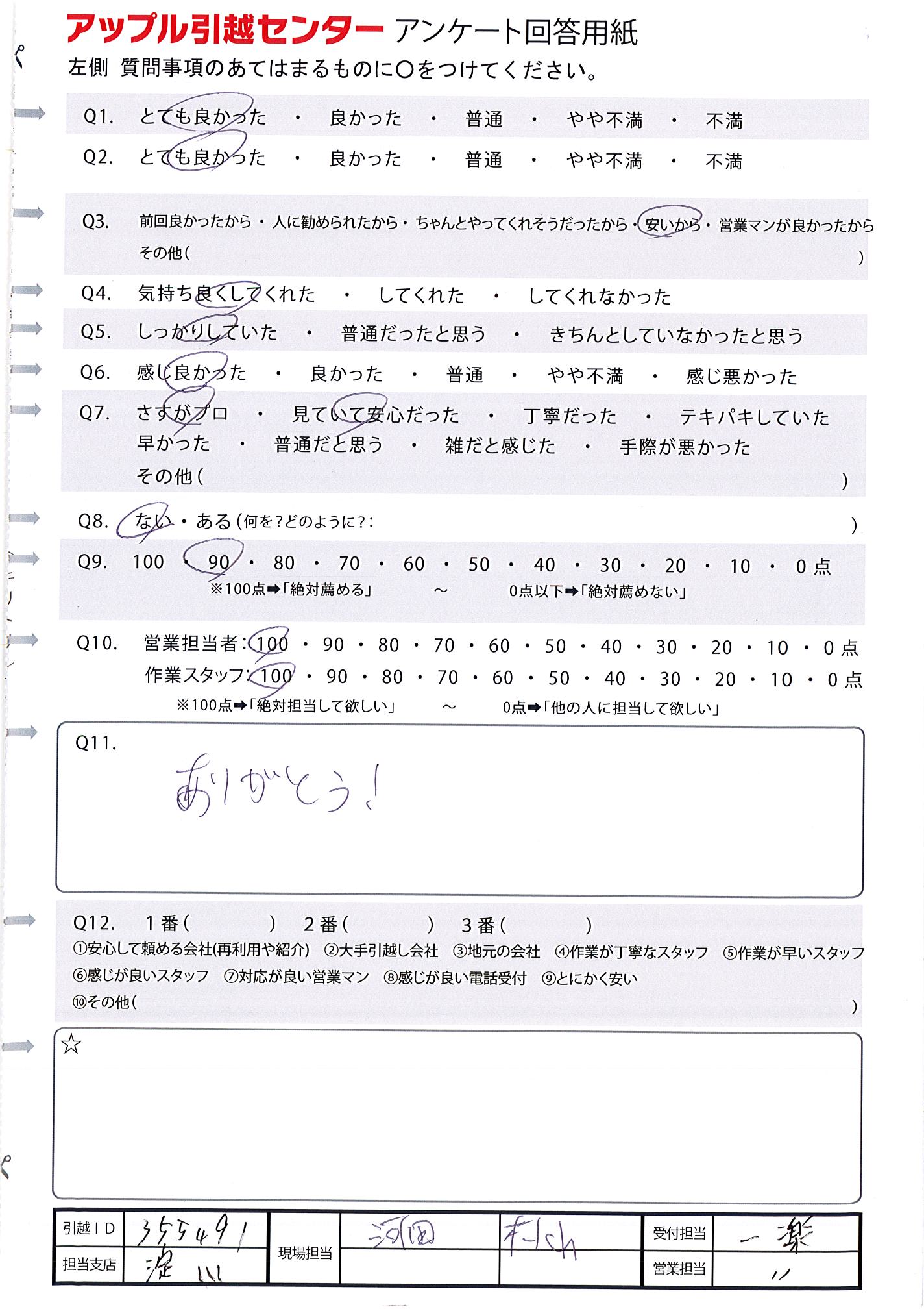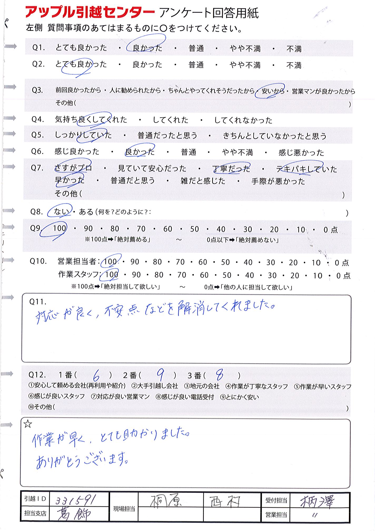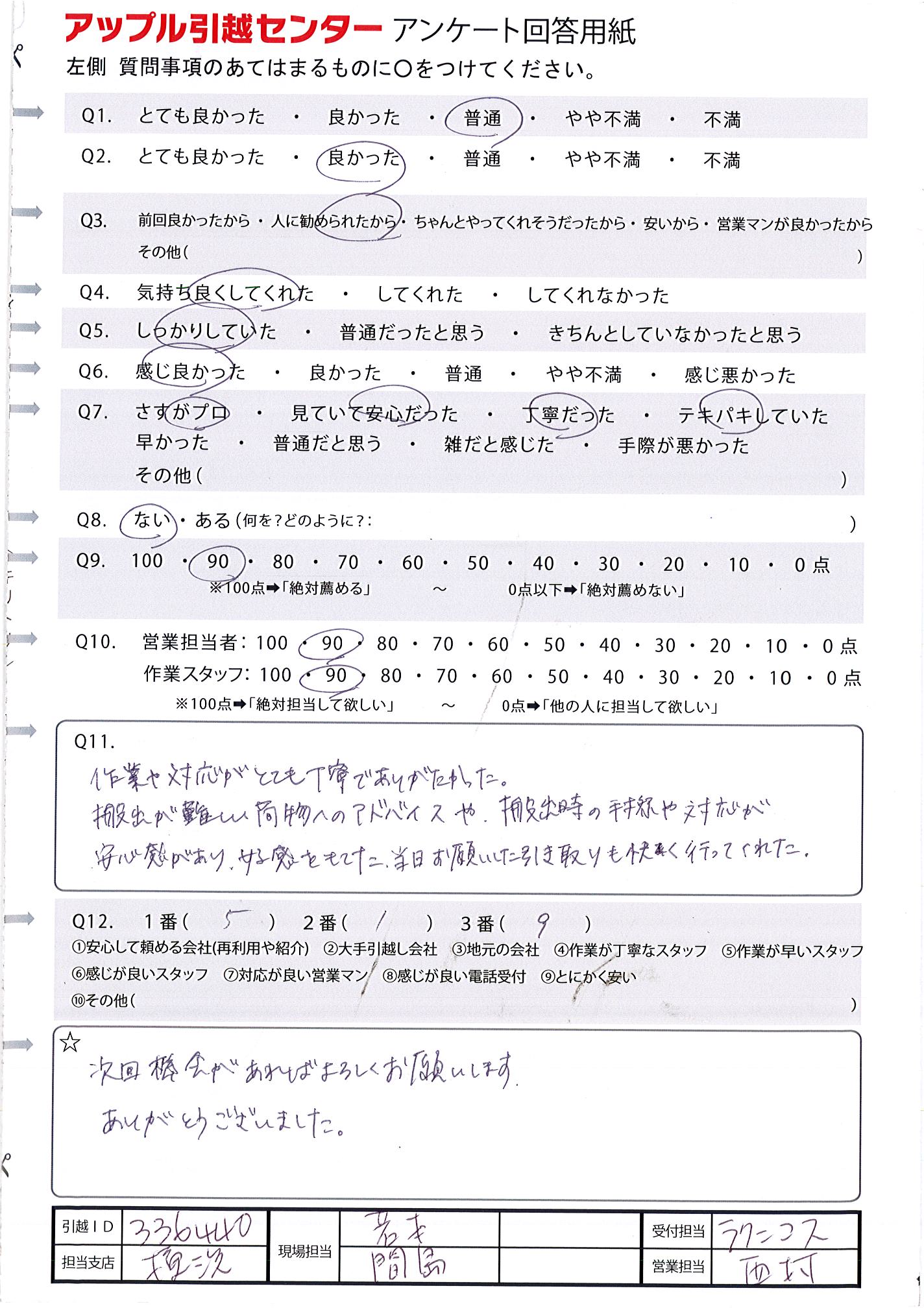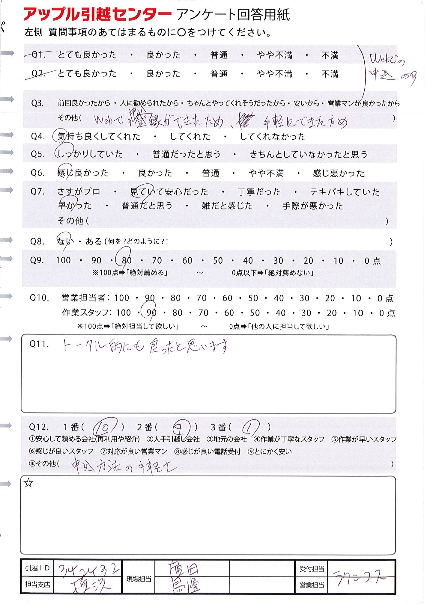 A.対応、料金ともに満足です。 また引越すときお願いしたいです。