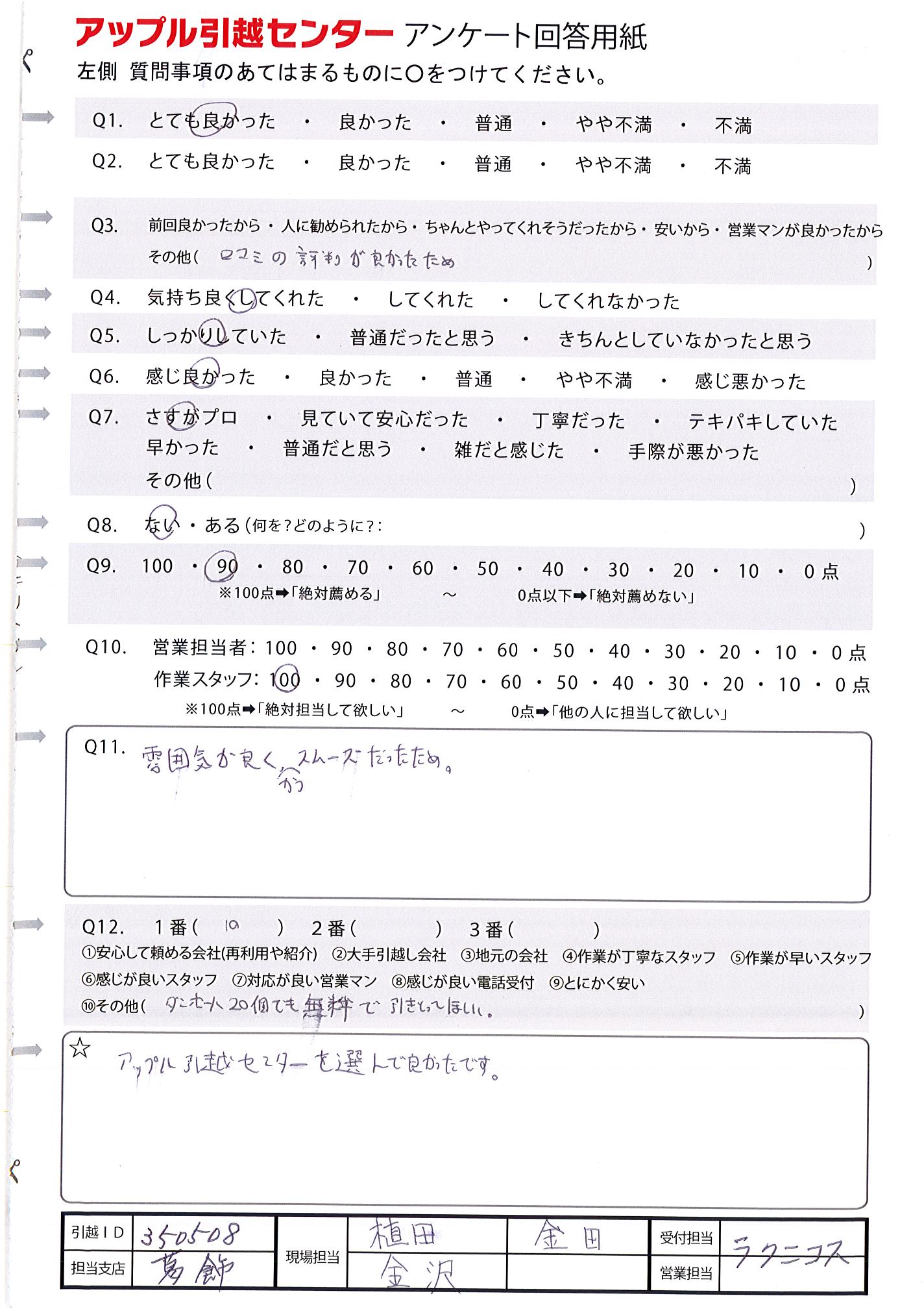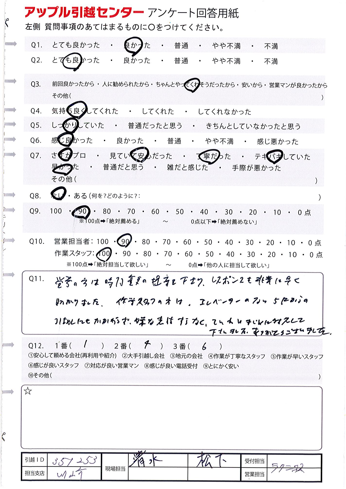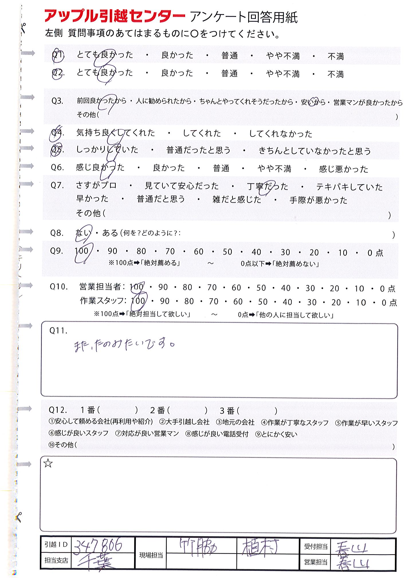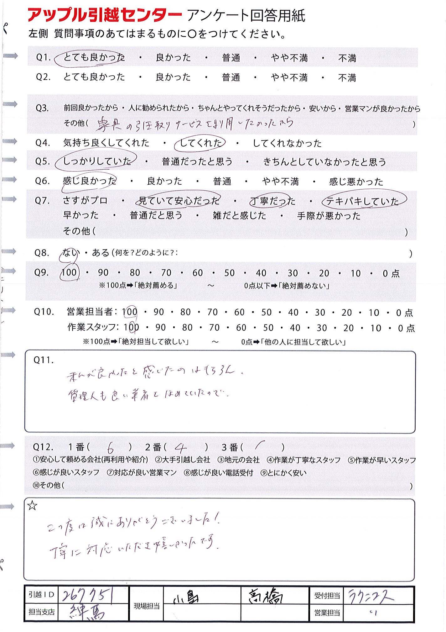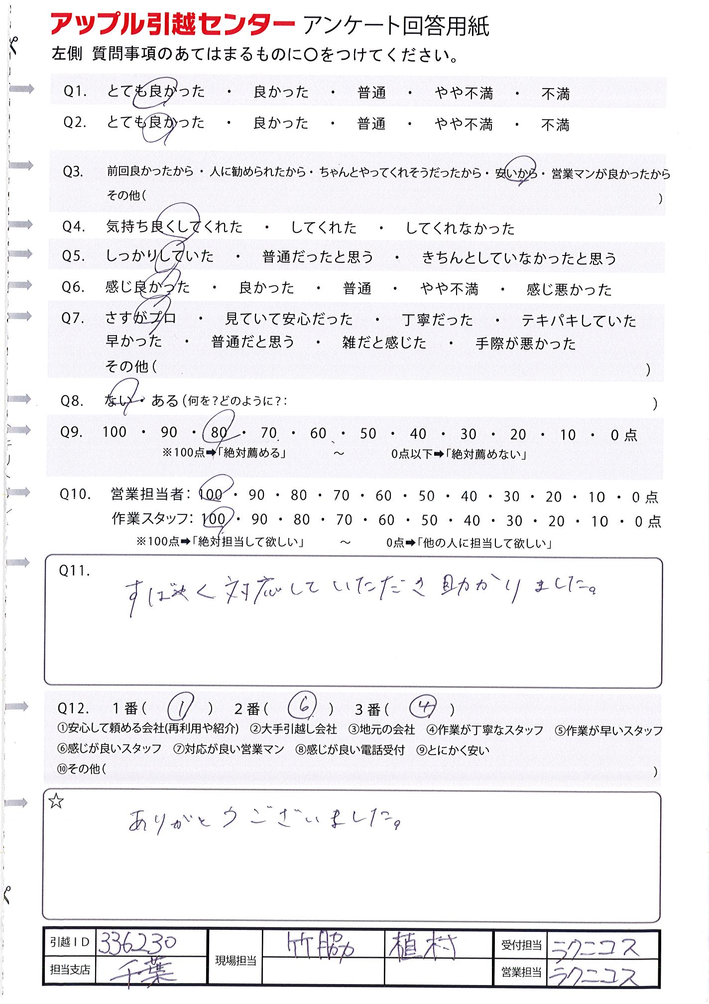 A.対応、料金ともに満足です。 また引越すときお願いしたいです。