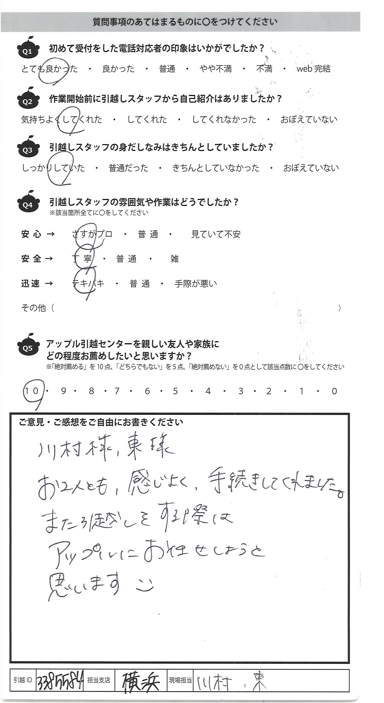A.川村様、東様 お2人とも、感じよく、手続きしてくれました。 また引越しをする際は アップルにお任せしようと 思います