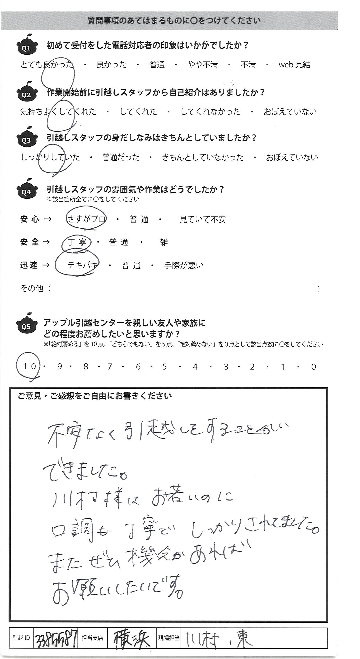 A.不安なく引越しをすることが できました。 川村様はお若いのに 口調も丁寧でしっかりされてました。 またぜひ機会があれば お願いしたいです。」