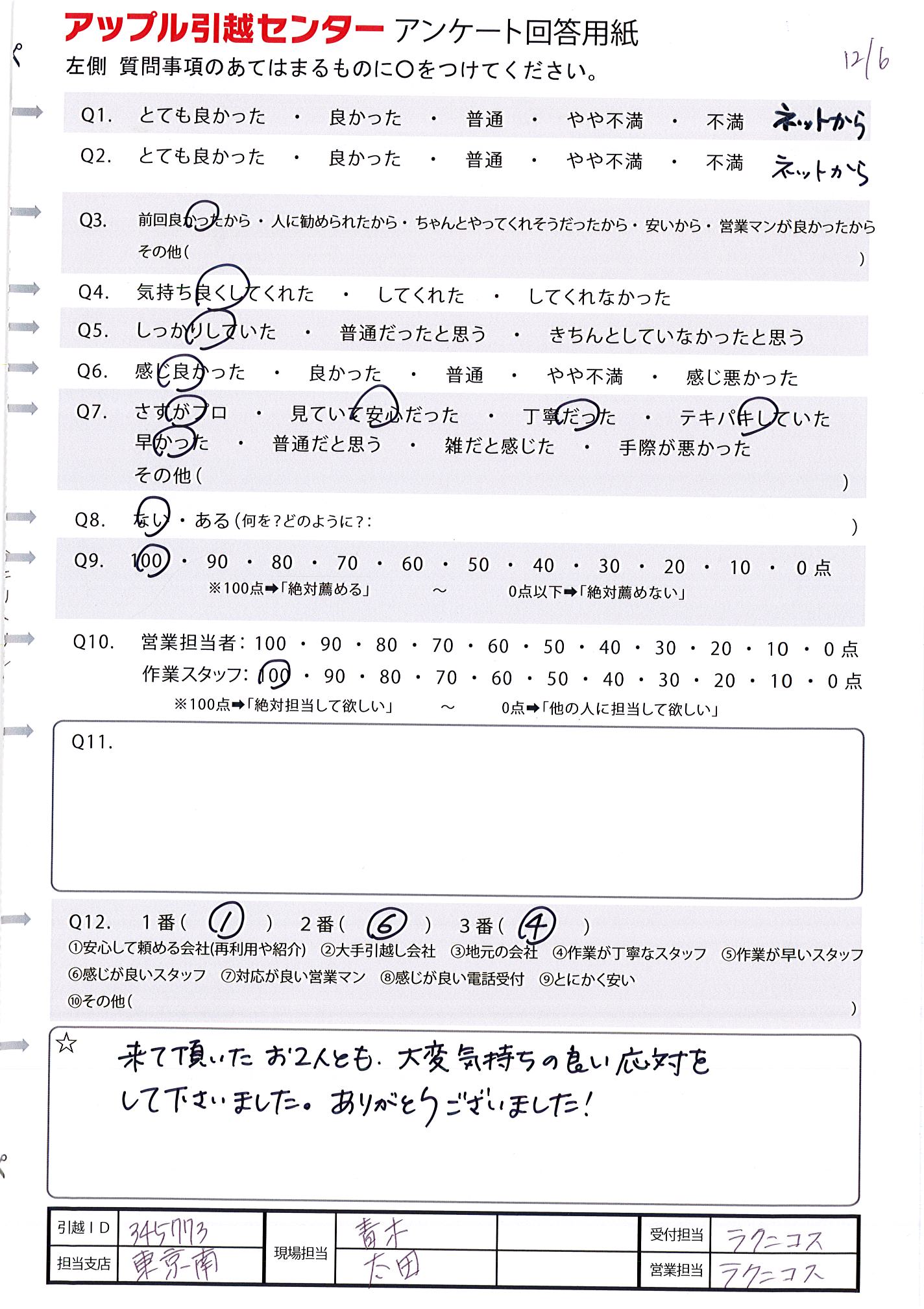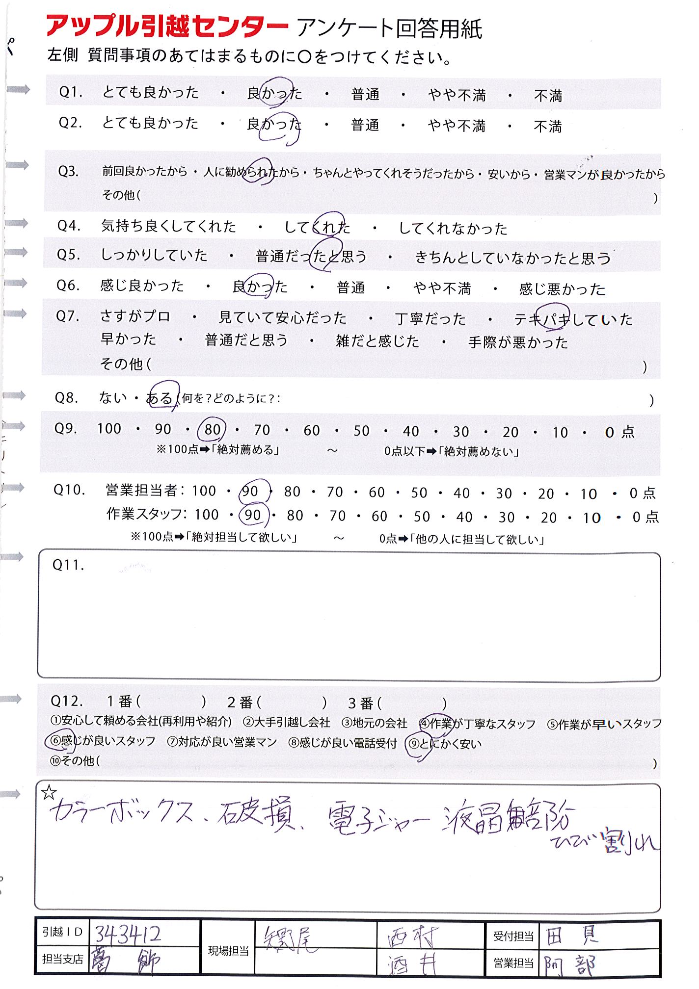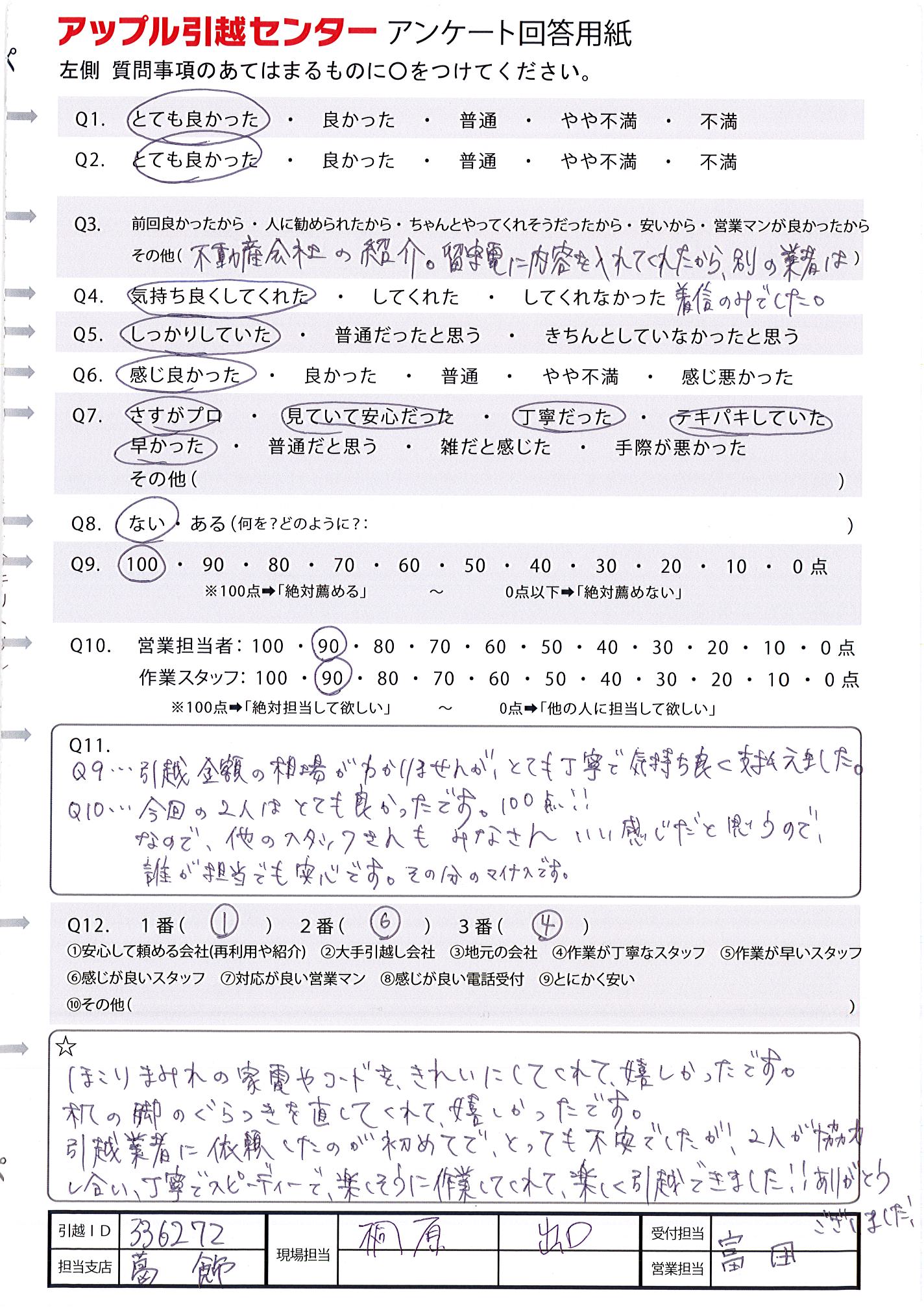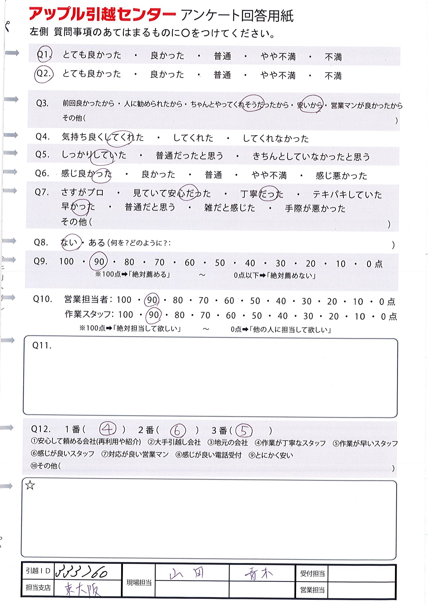 A.Q9・・・引越金額の相場がわかりませんが、とても丁寧で気持ち良く支払えました。 Q10・・・今回の2人はとても良かったです。100点!! なので、他のスタッフさんもみなさんいい感じだと思うので、誰が担当でも安心です。 その分のマイナスです。