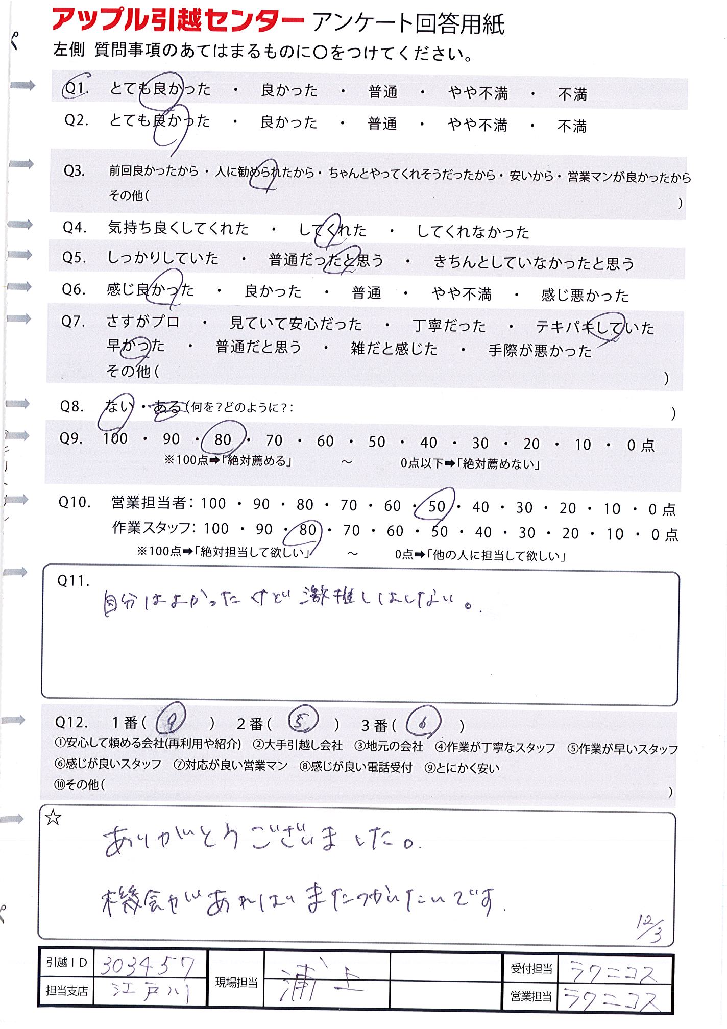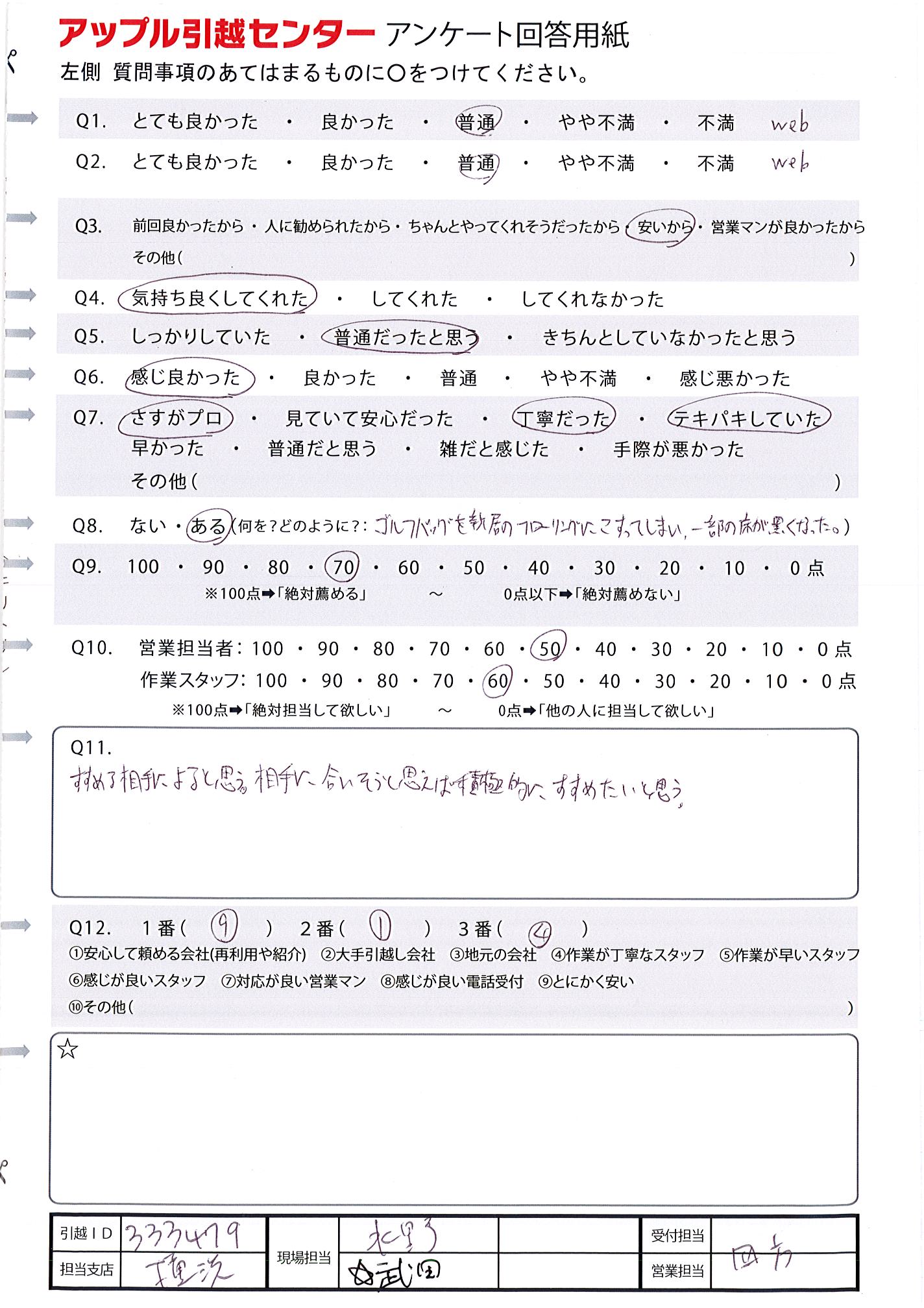 A.初めての引越しで不安あったが 丁寧に作業してくれたり、対応がよかったから。