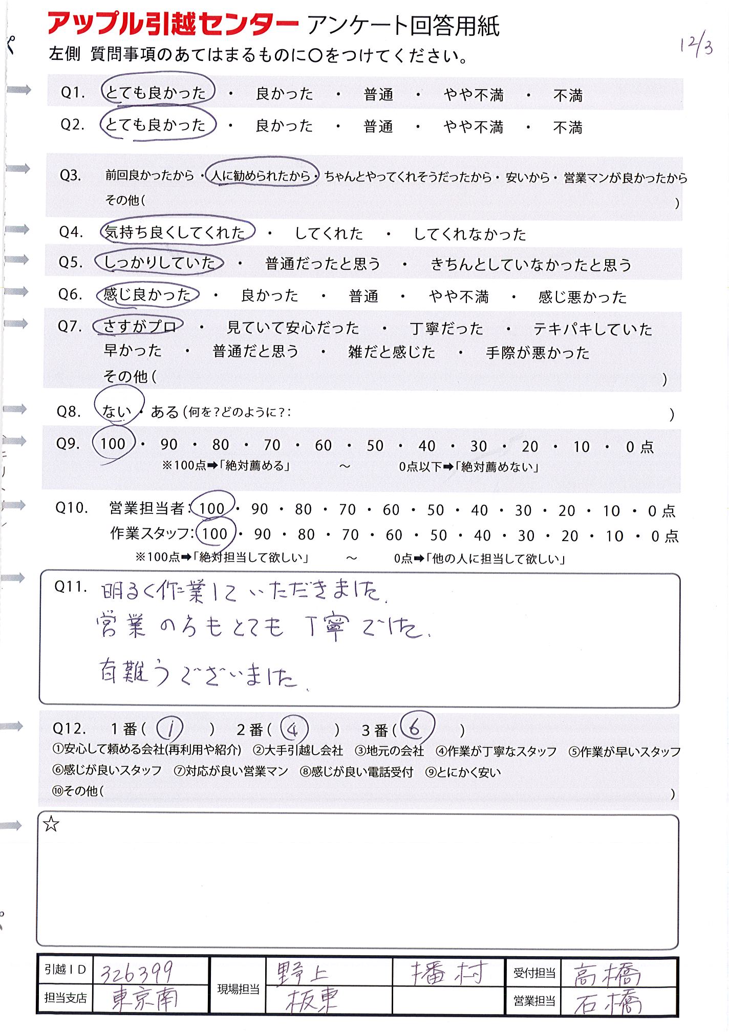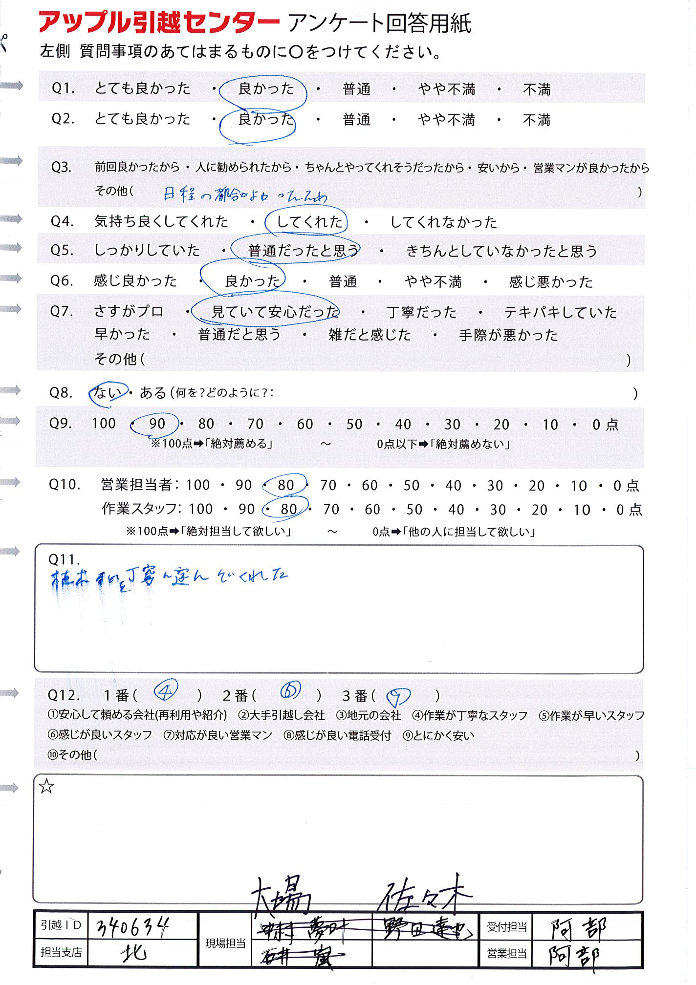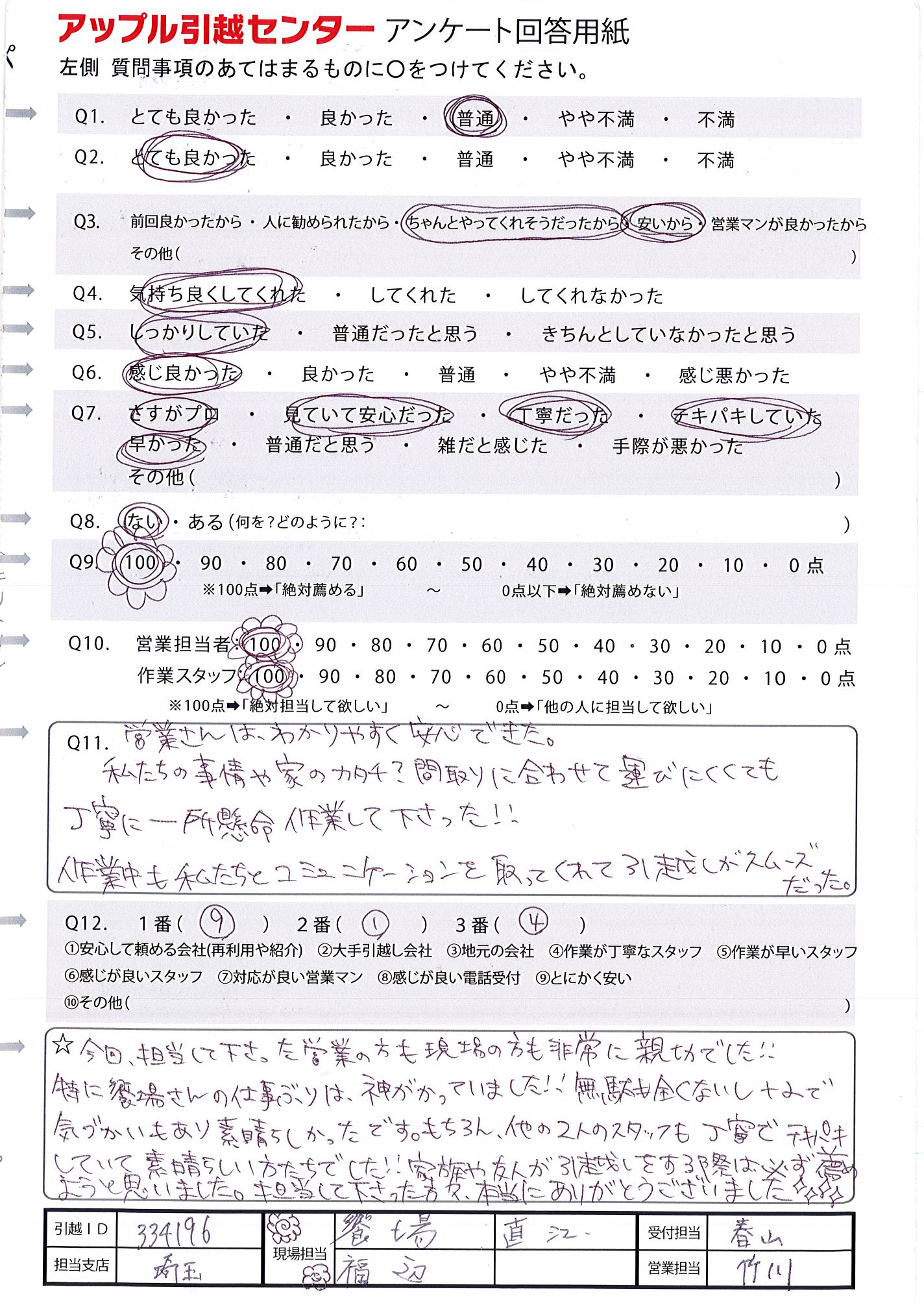 A.夫婦口をそろえて、次回の引越しも、アップルでお願いしたいね!と言っています。 遅い時間まで作業して頂いたにも関わらず、嫌な顔、態度1つせず、丁寧に対応して下さった滝沢さんと若本さんには本当に好感が持てました。 お2人でよかったです。 お世話になりました!!