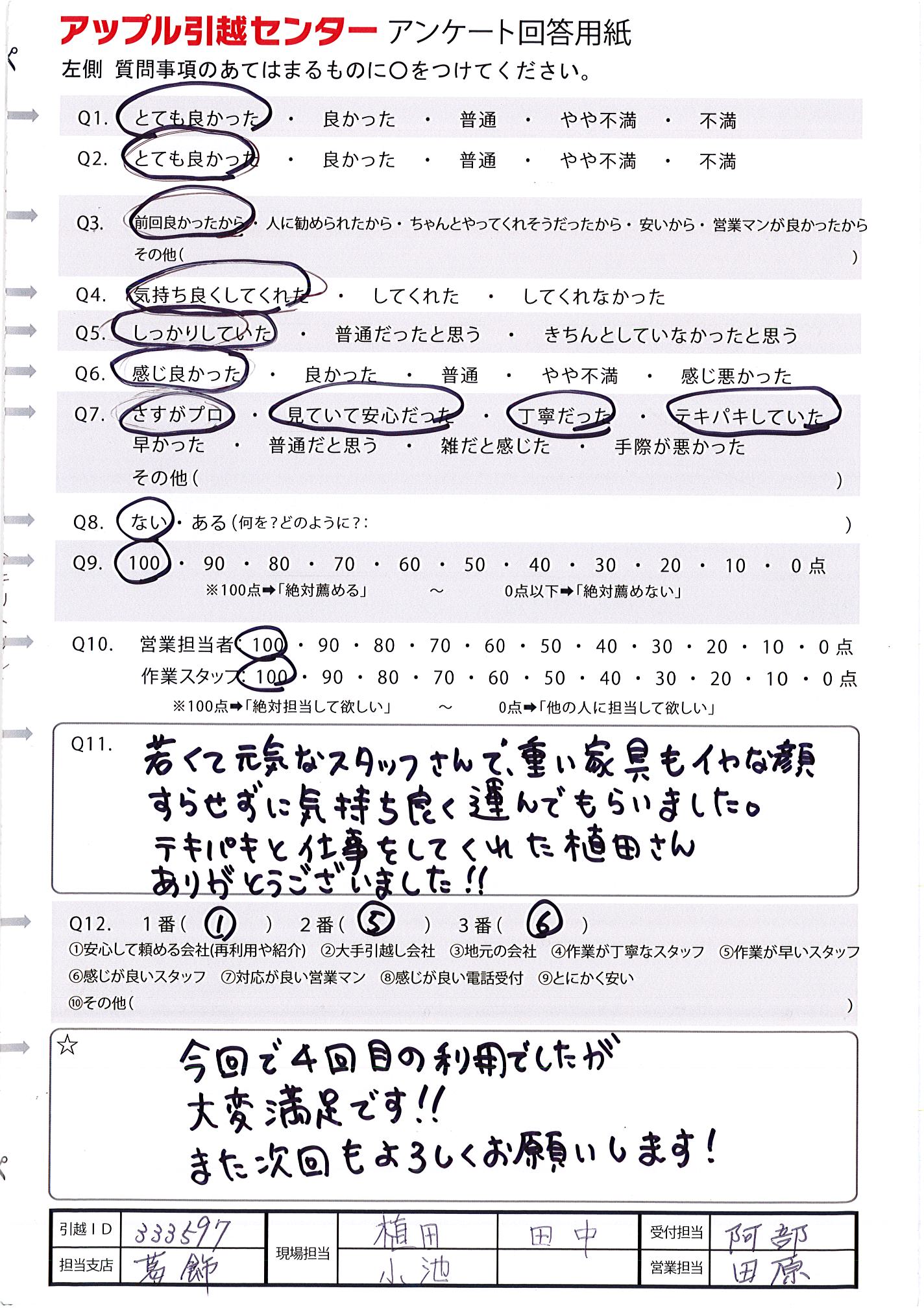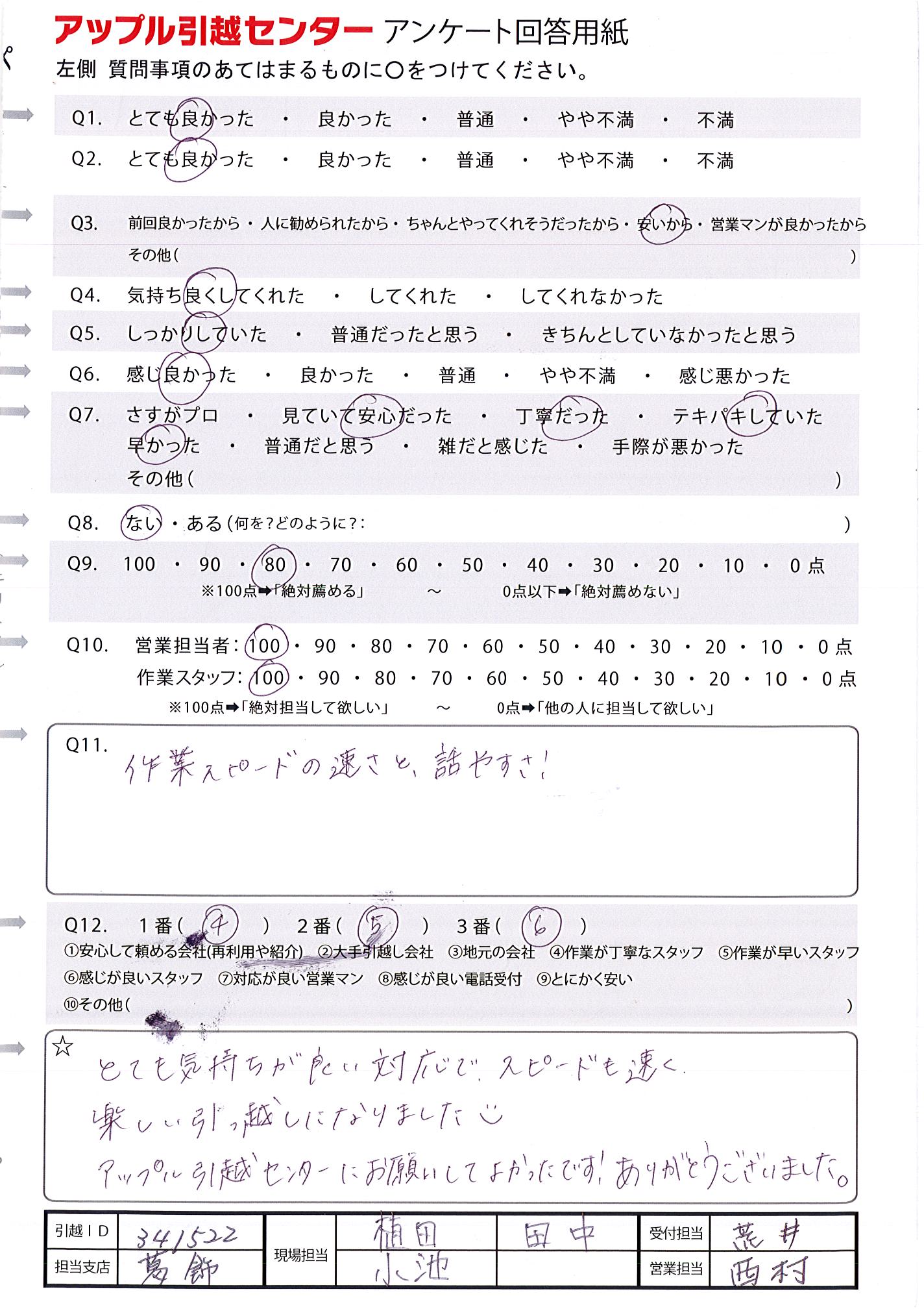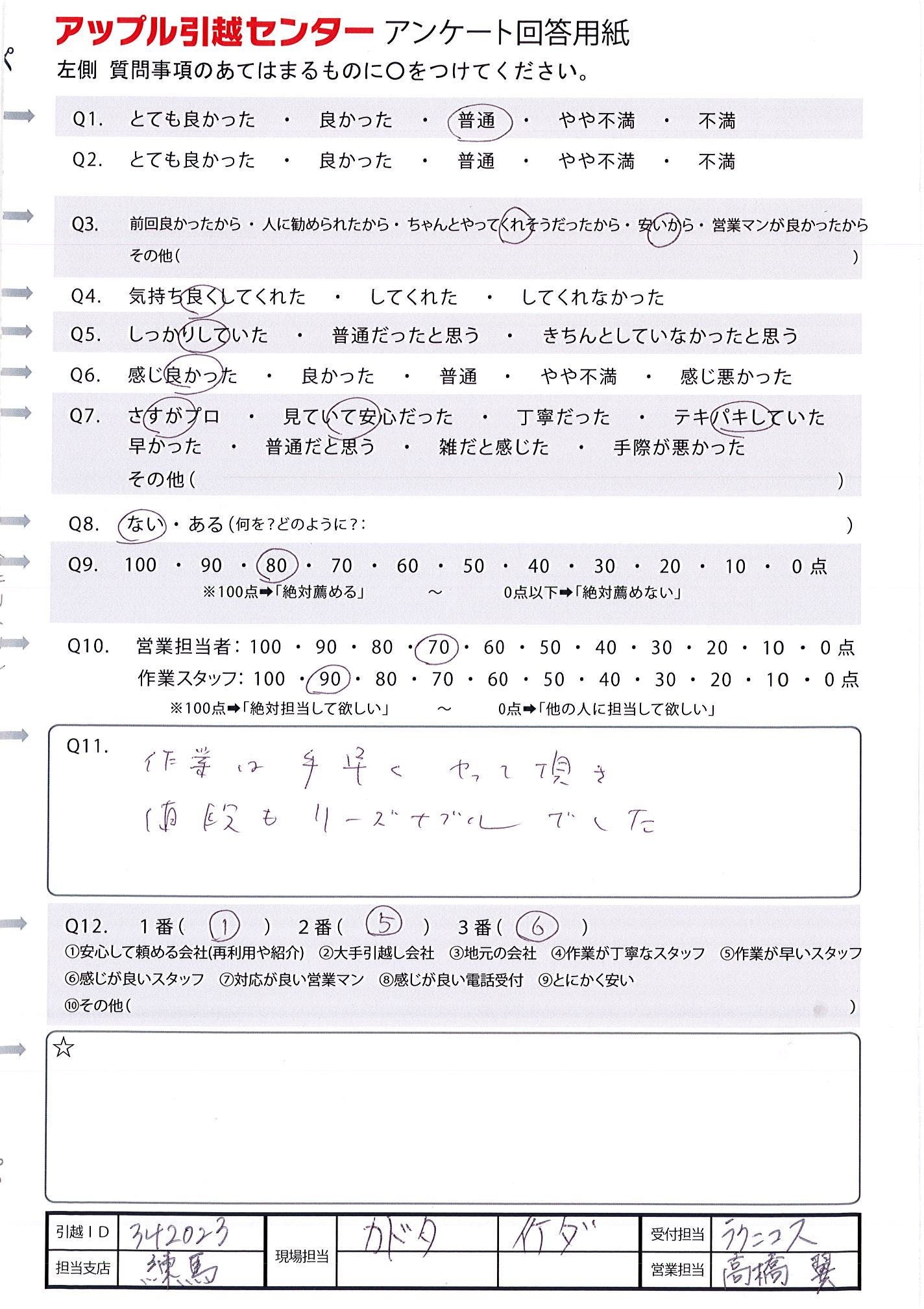 A.引越先が面倒なタワーマンションだったにも関わらず、管理会社への確認などもスムーズにして頂き、大変に助かりました。 またハキハキ明るい対応も好印象でした。 当日担当して頂いたタナカさんも丁寧かつ迅速に作業して頂き、思っていた半分くらいの時間で完了しました。 金額も他社より安く、勧めない理由がありません。