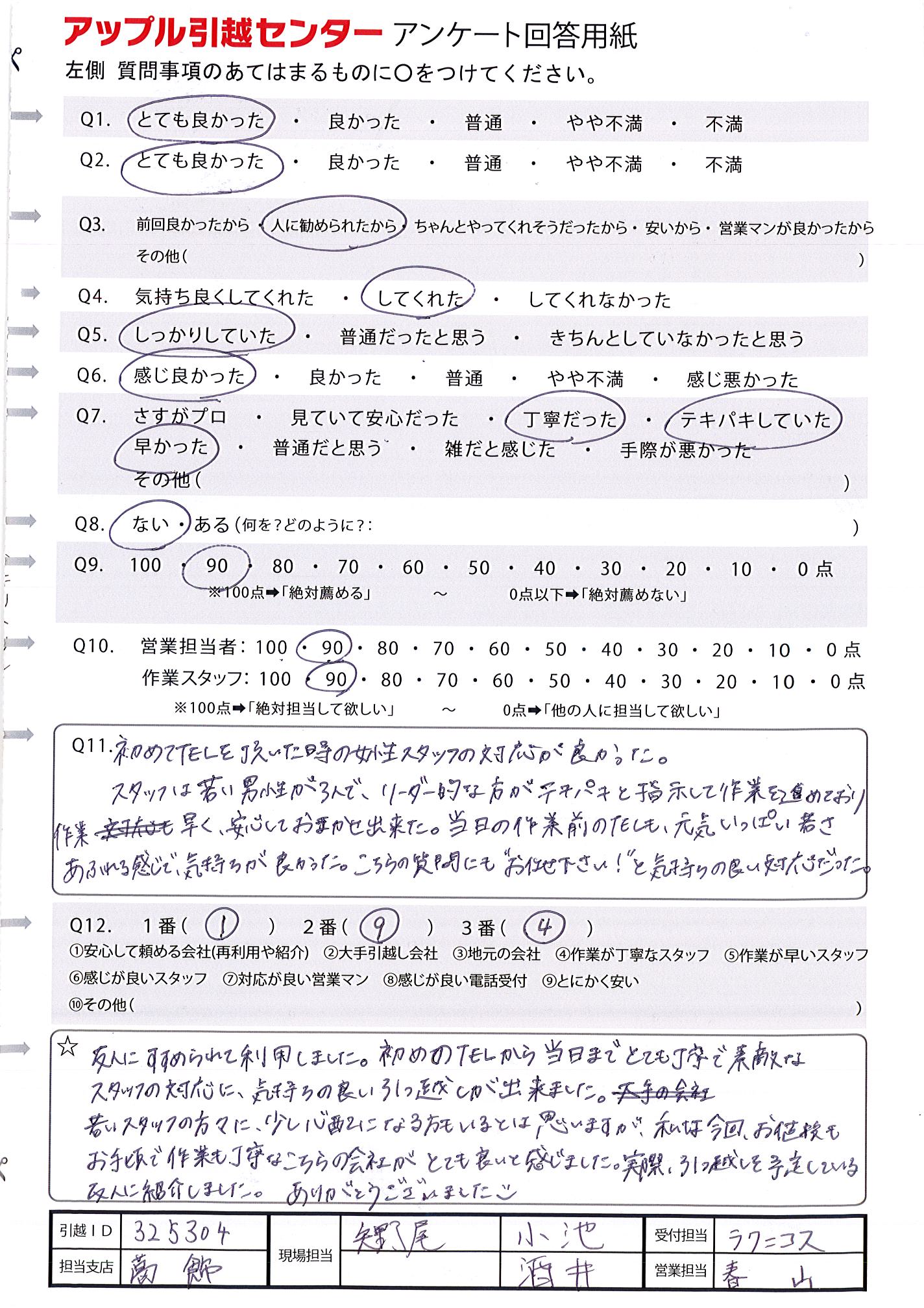 A.開始時間が最終時間よりになり、訪問前の事前連絡が少し遅かったので心配していましたが、作業は早く対応も親切にしていただき気持ちよく引越しする事ができました。 ありがとうございました。