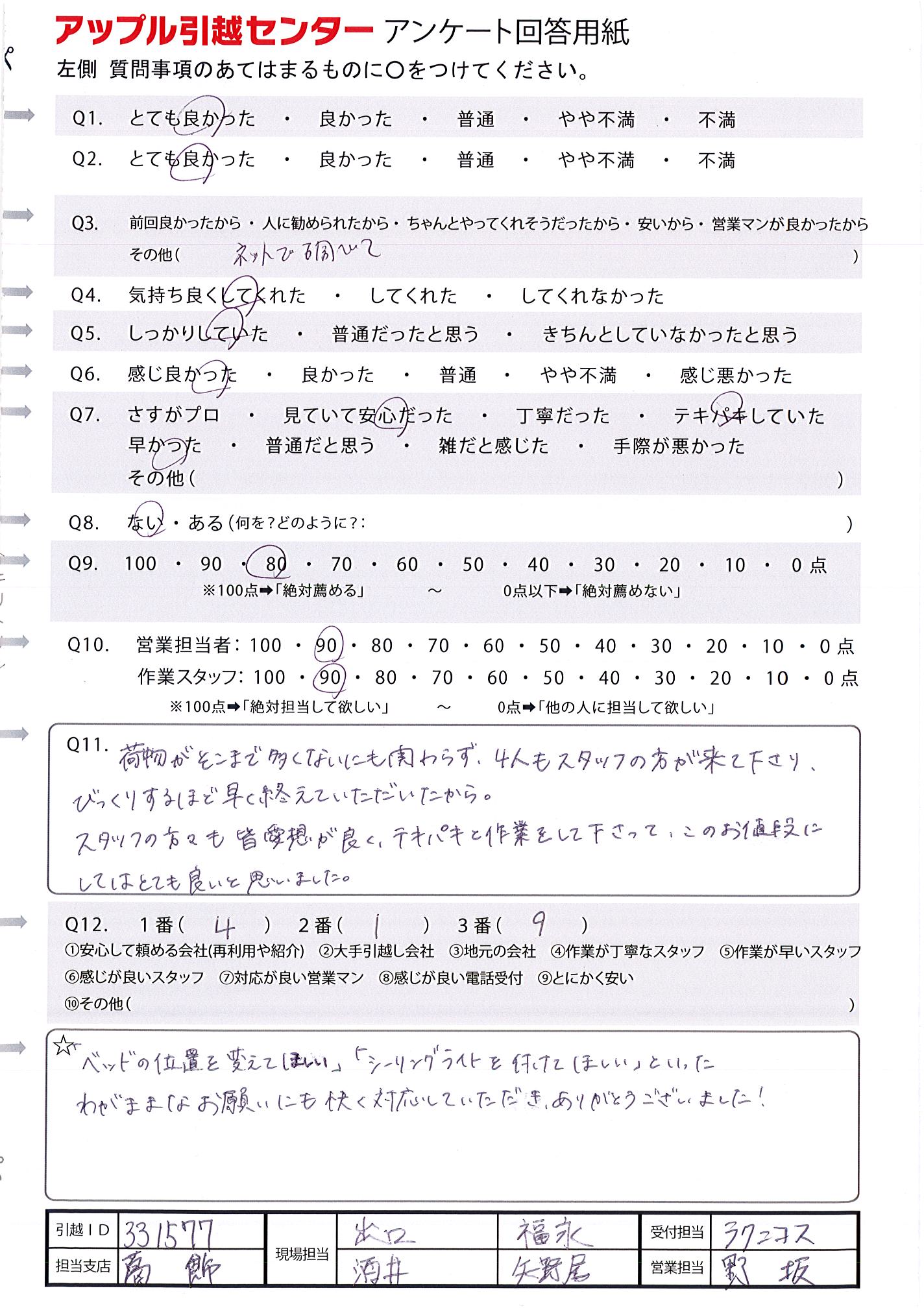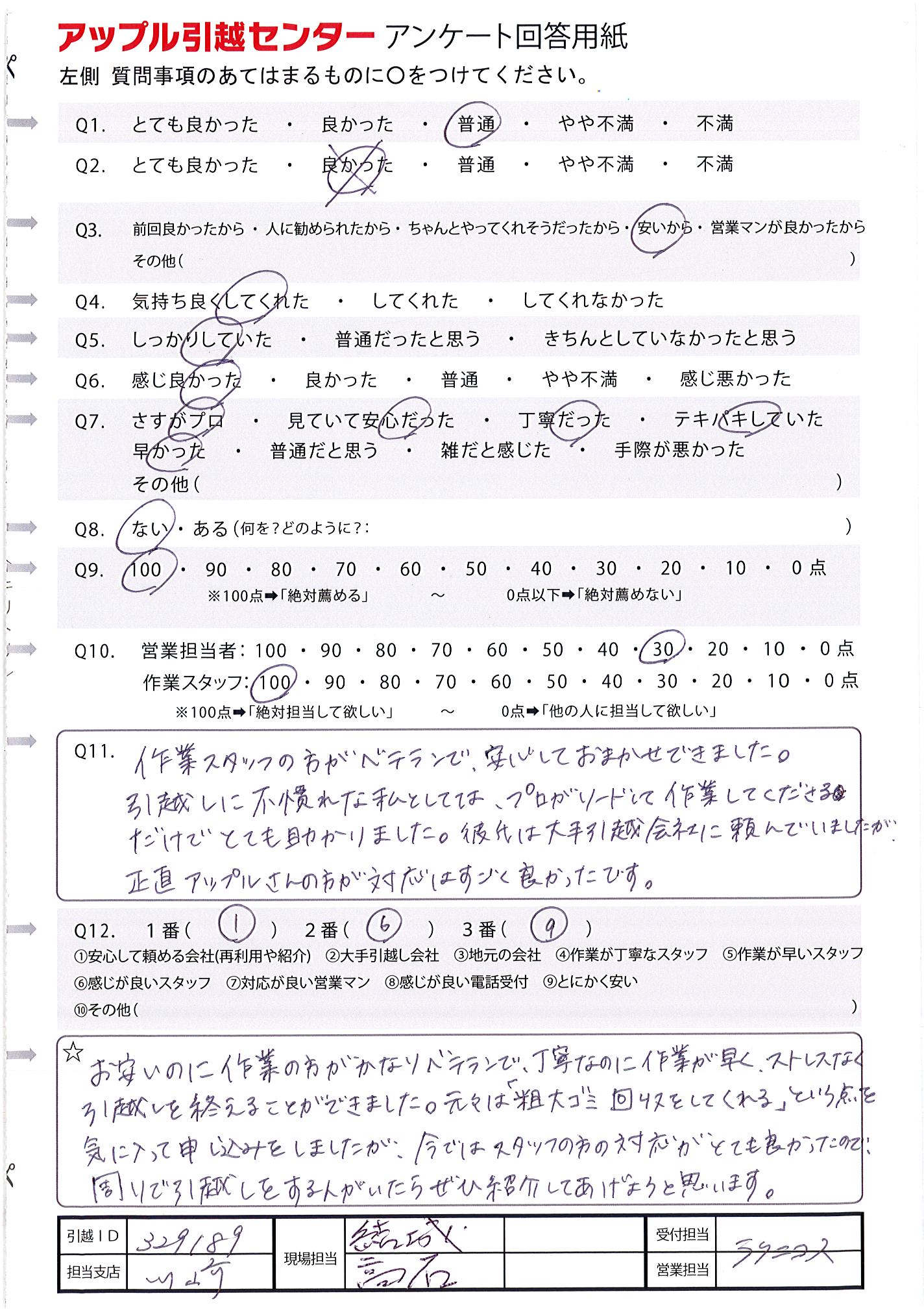 A.レベルは非常に高かったし、丁寧だったし、初めて引越し会社に頼りましたので、アップルにして良かったと思います。