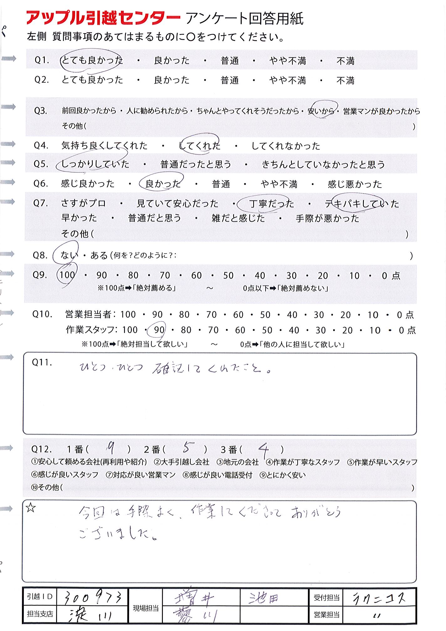 A.アンケート提出が遅くなりすみません。 また、当日の作業スタッフさん達にきちんとしたお礼もできずすみませんでした。 とても感謝しています。 ありがとうございました。