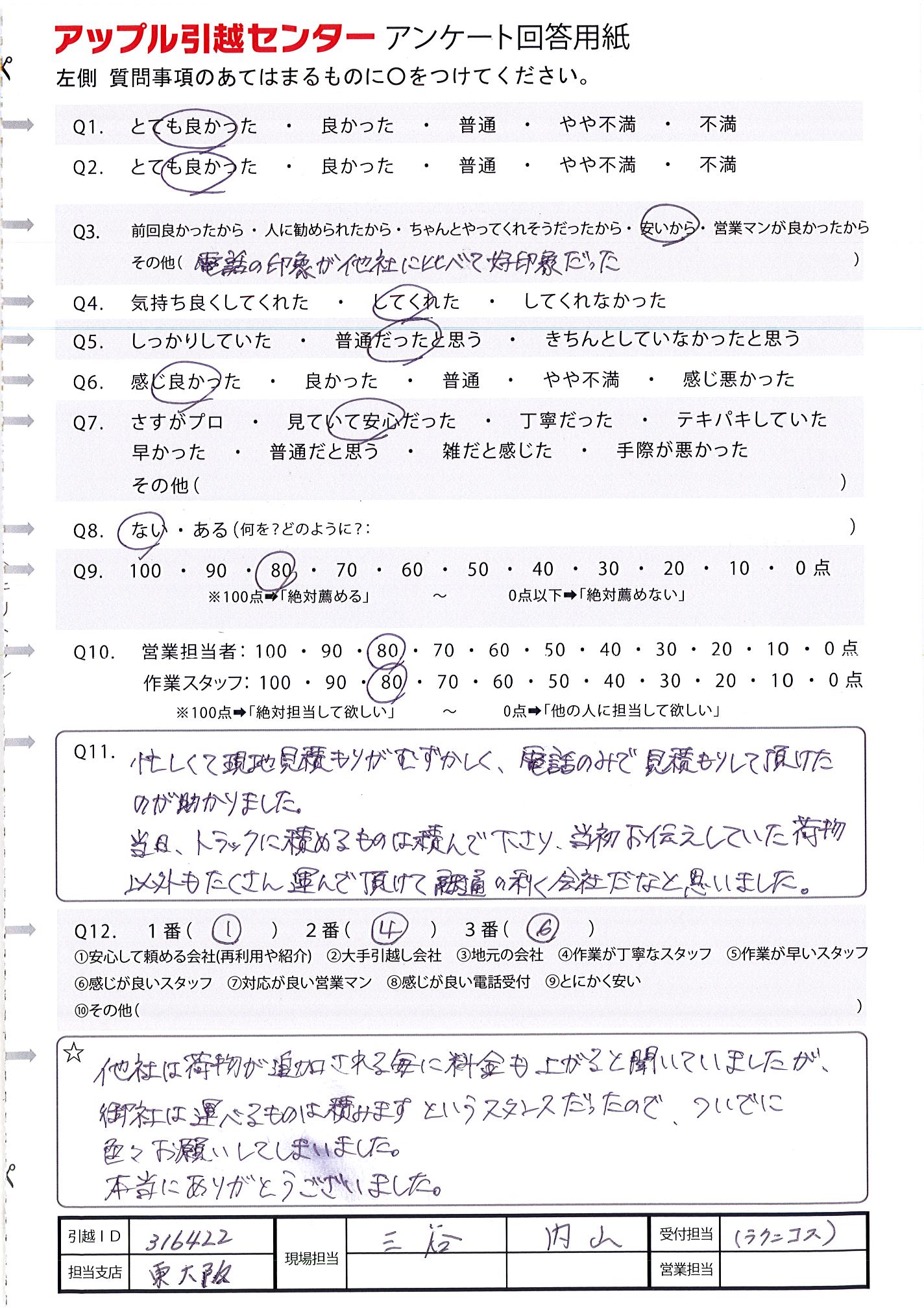 A.引越スタッフの感じも良く気持ち良く引越できました。 システムがしっかりしていて、メールでの連絡もあり安心でした。 又、次回もお願いしたいと思っています。