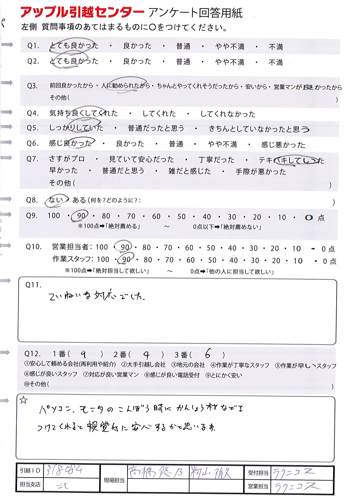 A.引越の依頼が引越の数週間前なのに引き受けて頂き本当にありがとうございました。 作業して下さった佐藤さん、酒井さんの手際を見て「さすがプロ」と感じましたし、安心して見ていられました。 次回引っ越す時も宜しくお願い致します。