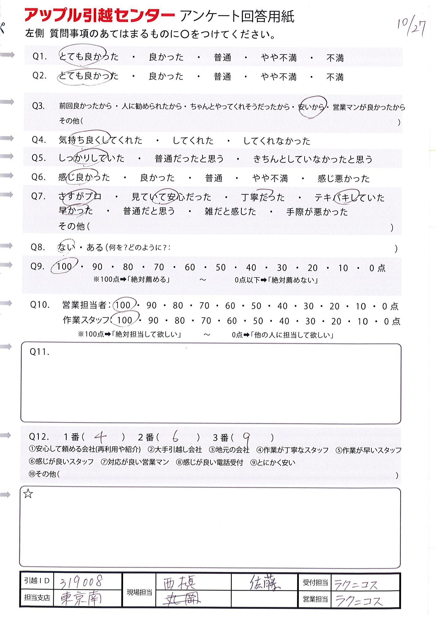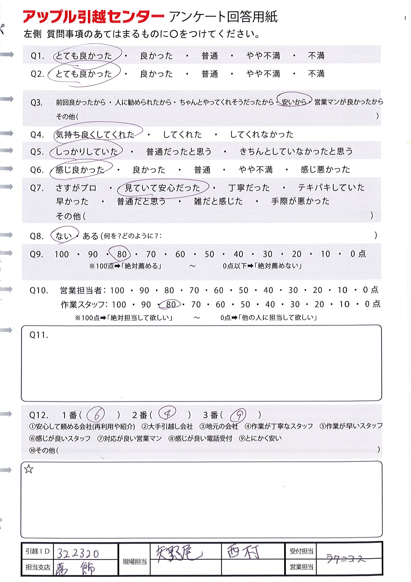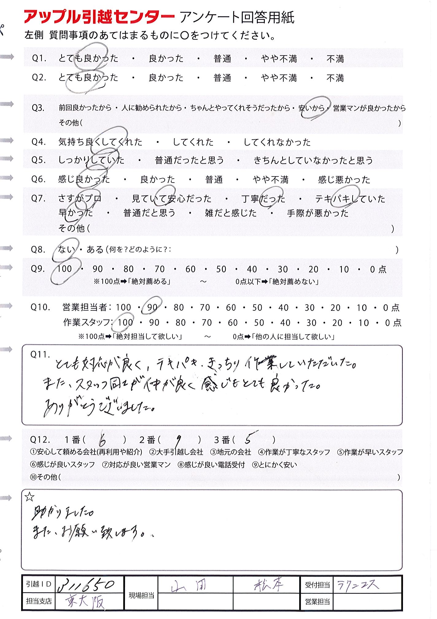A.総じて良いお仕事をしていただいたと感じています。ありがとうございました。 引越しID:314634