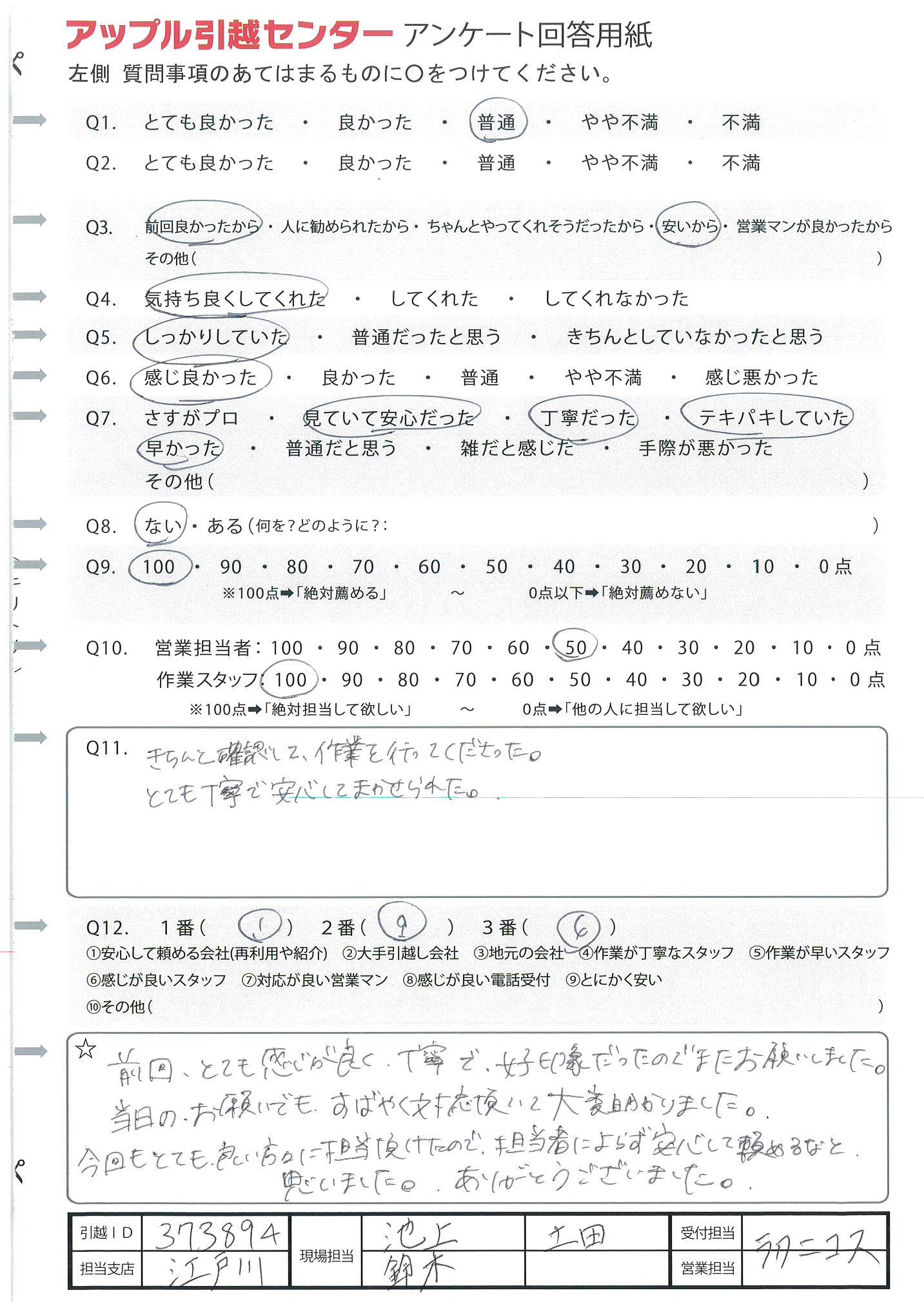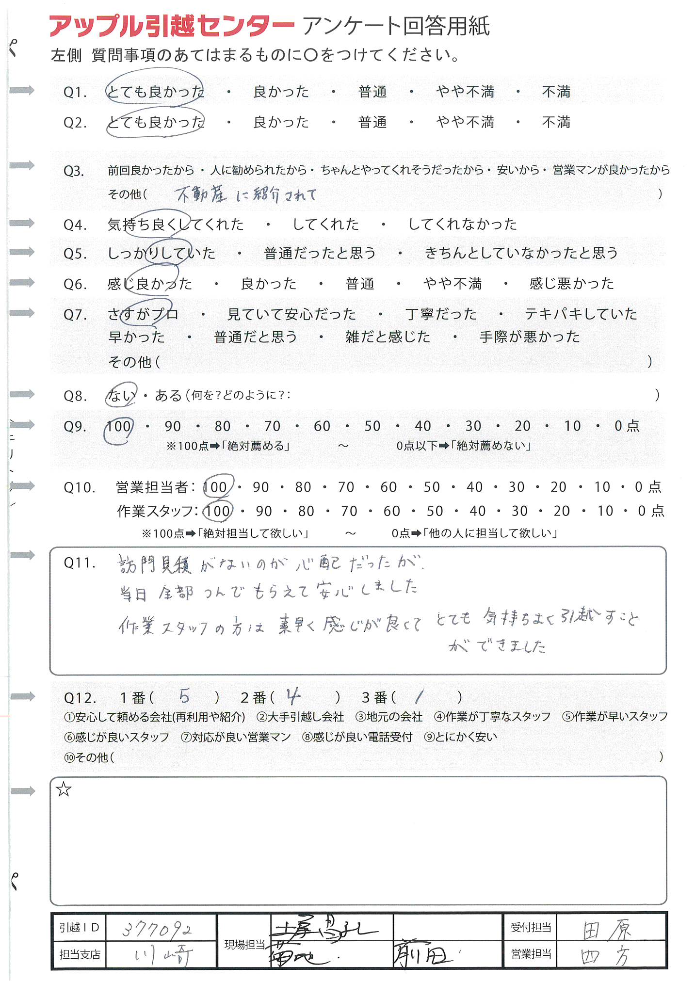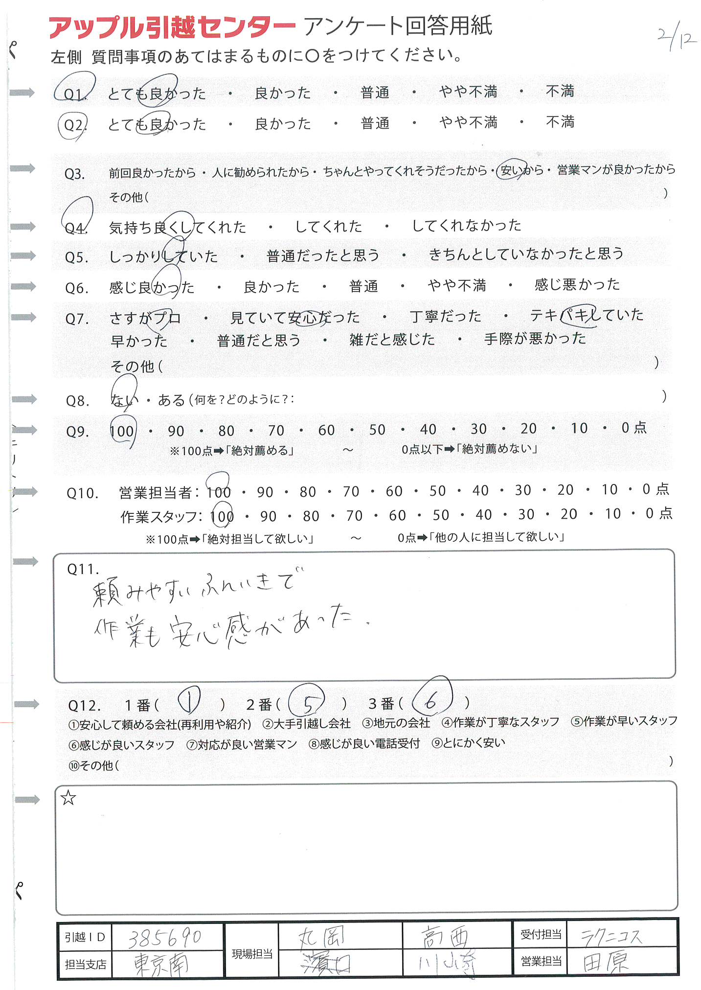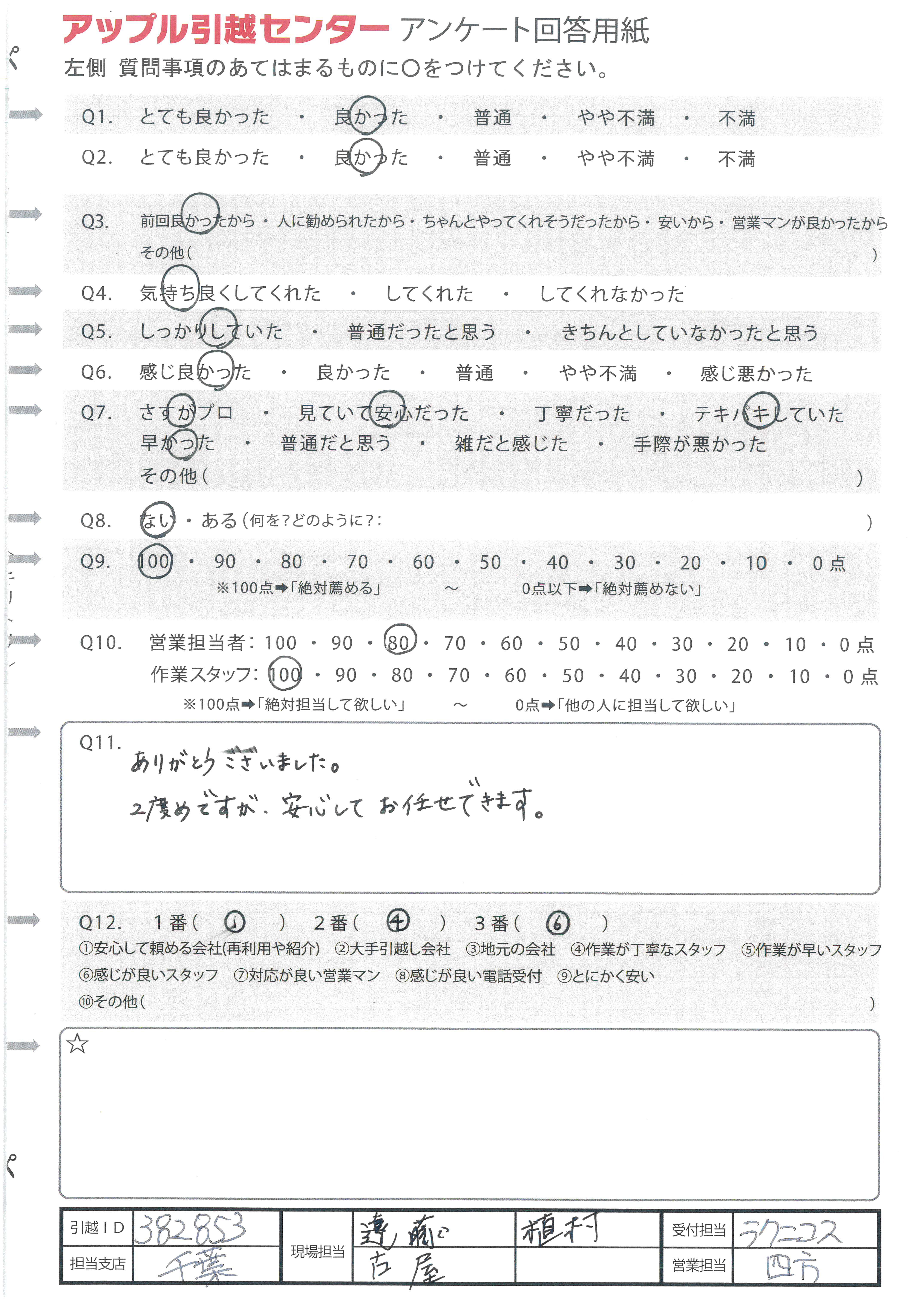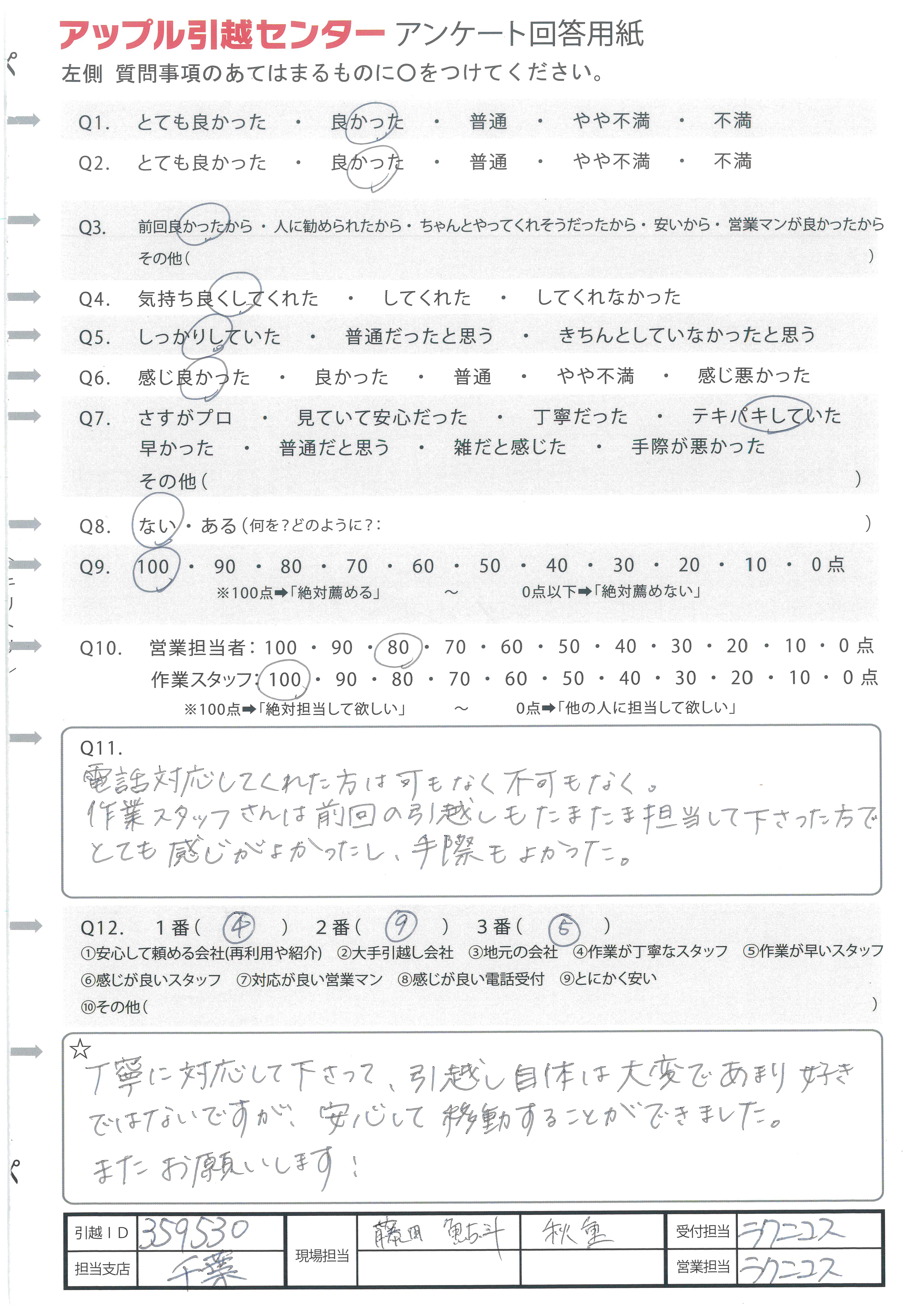 A.引越し作業してくれた方は知識があり、さすがプロと思いました。 (洗たく機の運び方や、部屋を傷つけない気づかい) 引越し作業担当の方はそれがスタンダードであってほしいという思いをこめて上記の点数にしました。